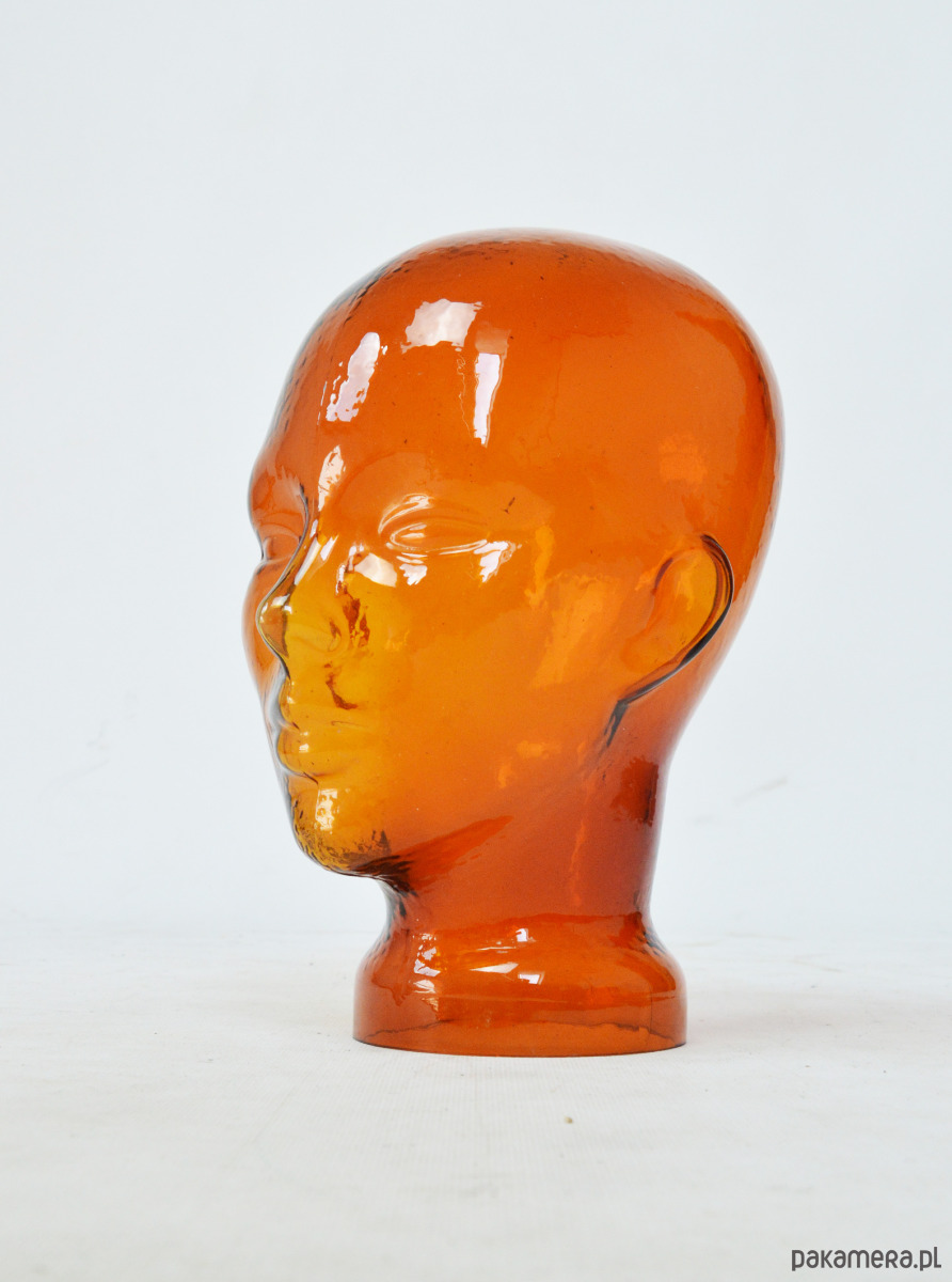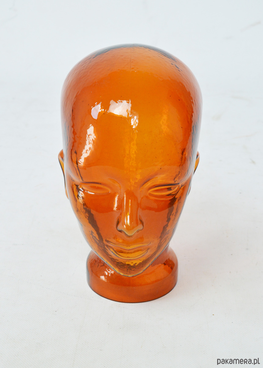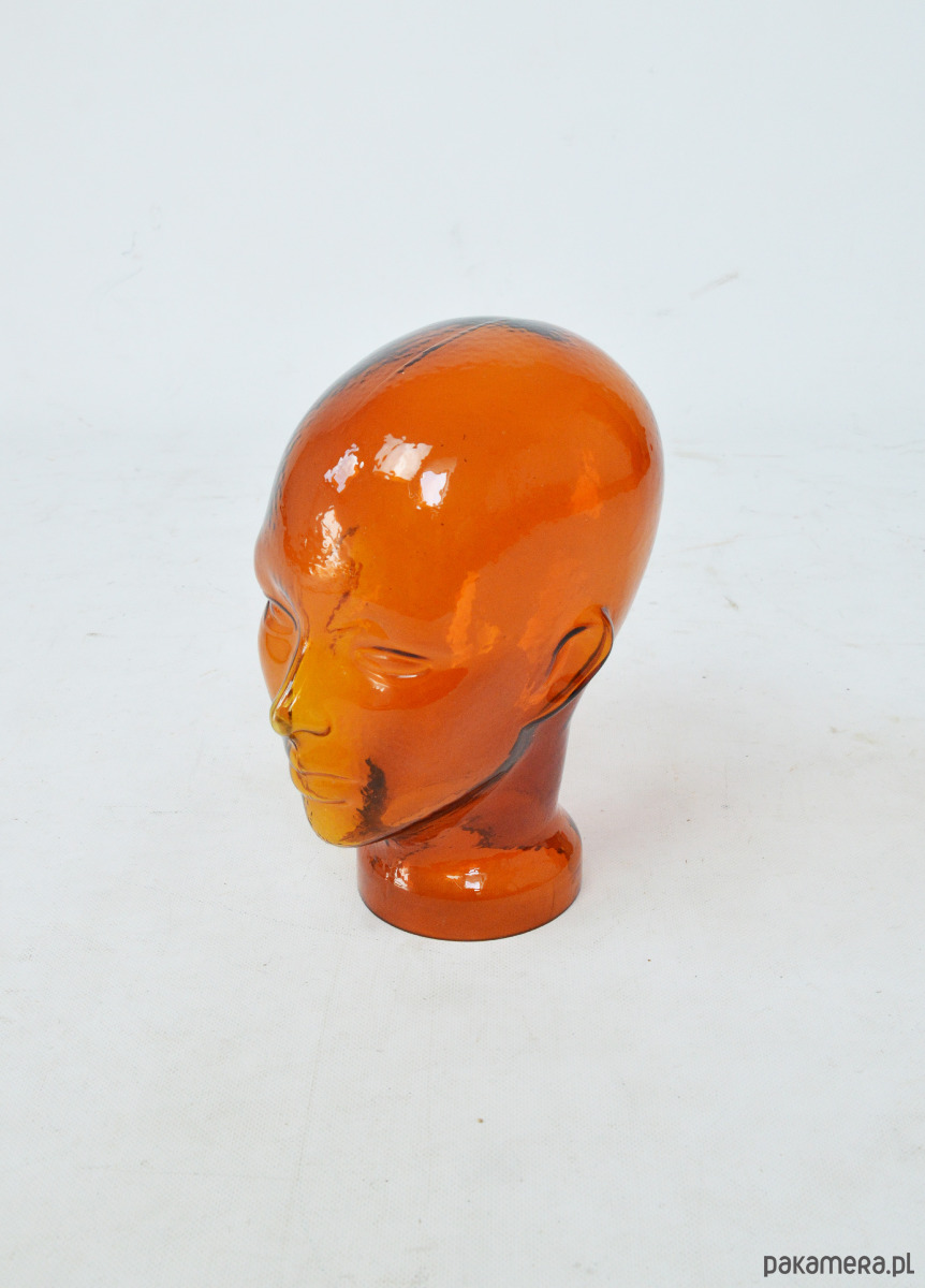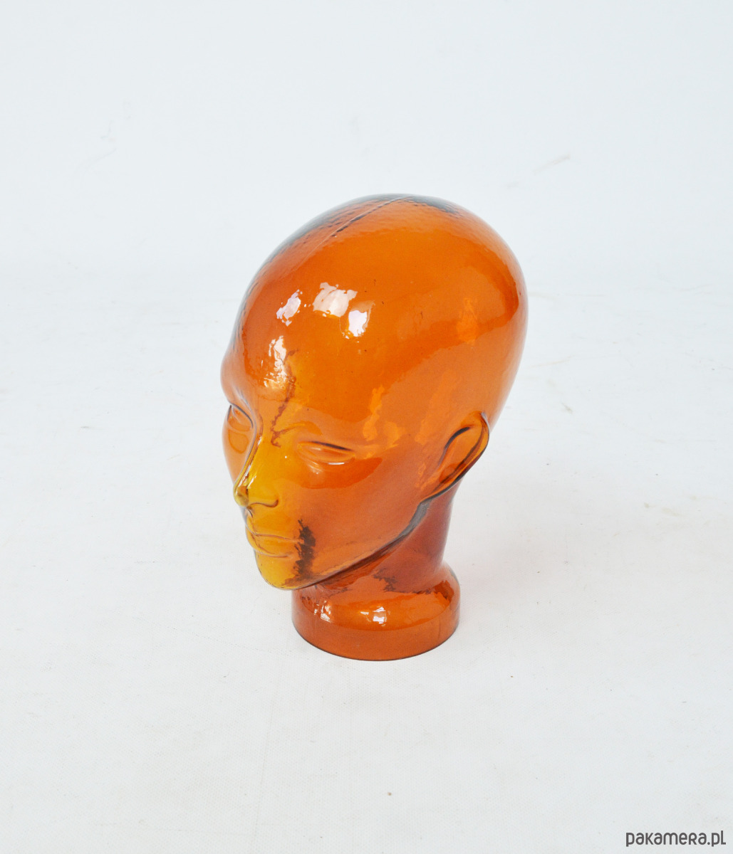 Szklana dekoracyjna głowa z lat 70. Może posłużyć jako stojak na słuchawki lub czapki. Stan zachowania bardzo dobry.