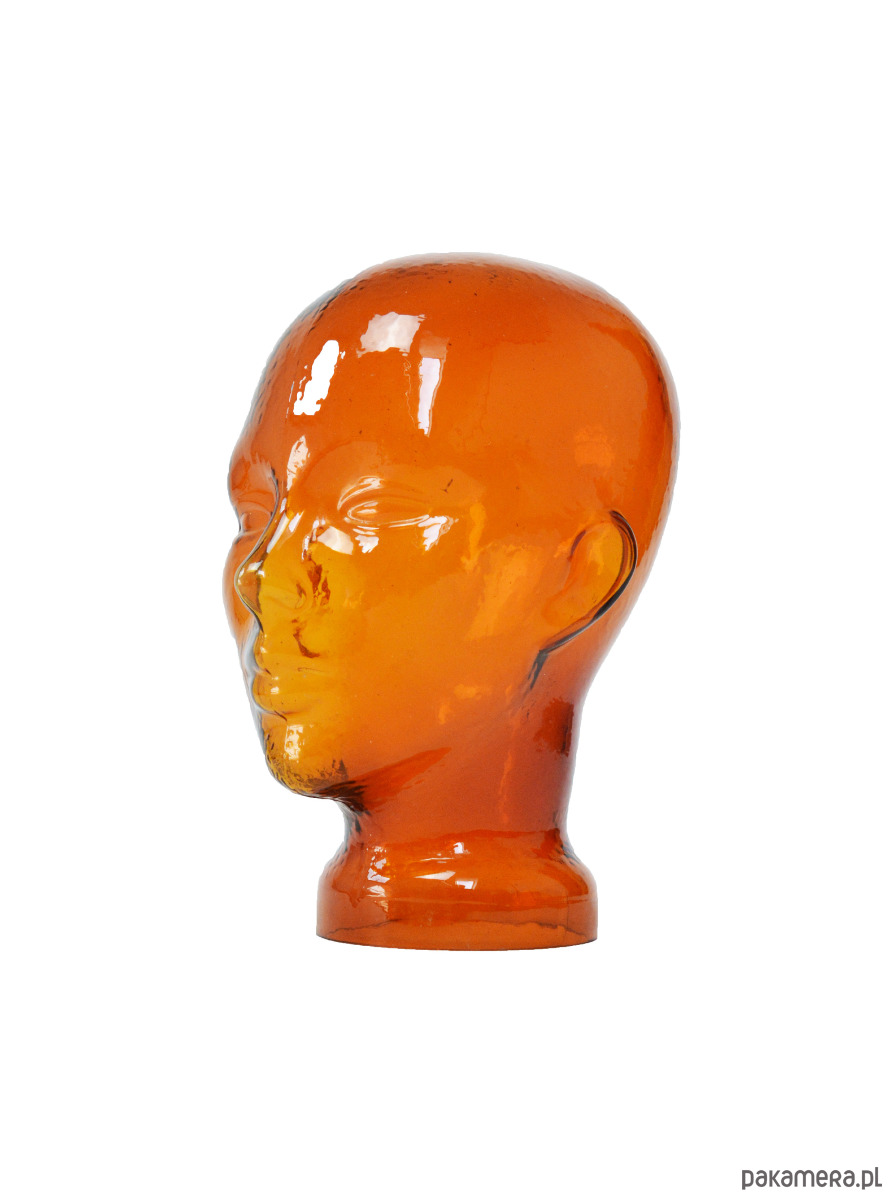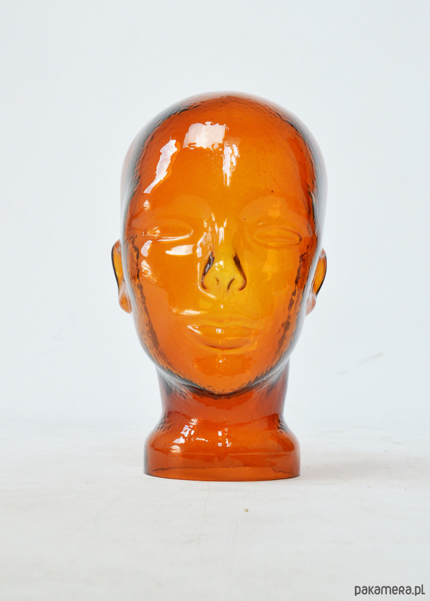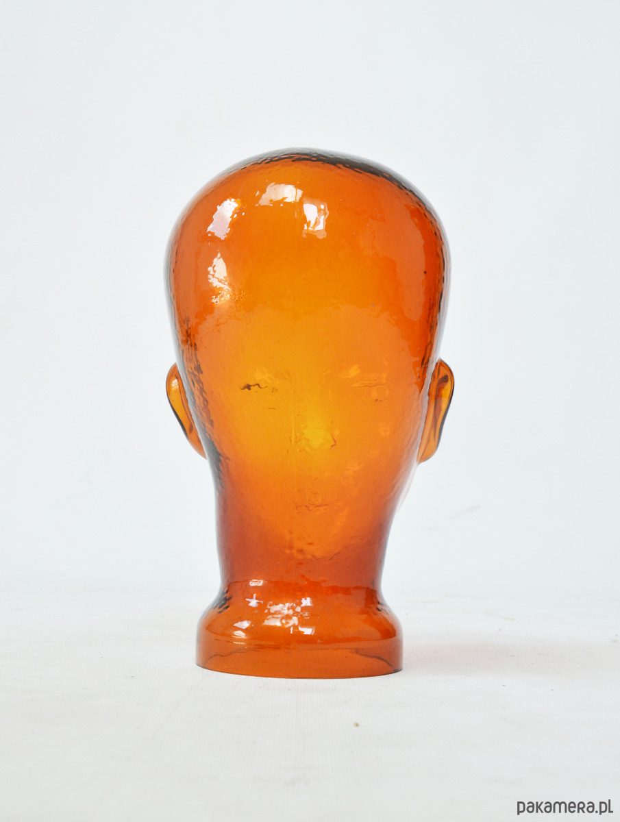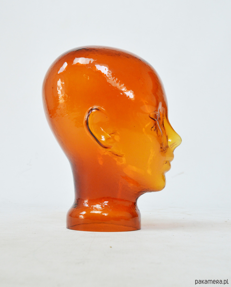 Szklana dekoracyjna głowa z lat 70. Może posłużyć jako stojak na słuchawki lub czapki. Stan zachowania bardzo dobry.