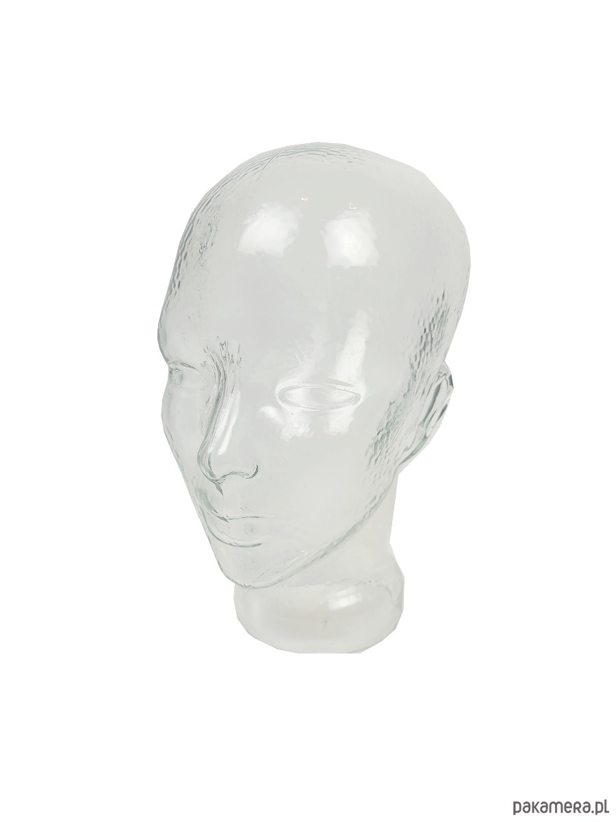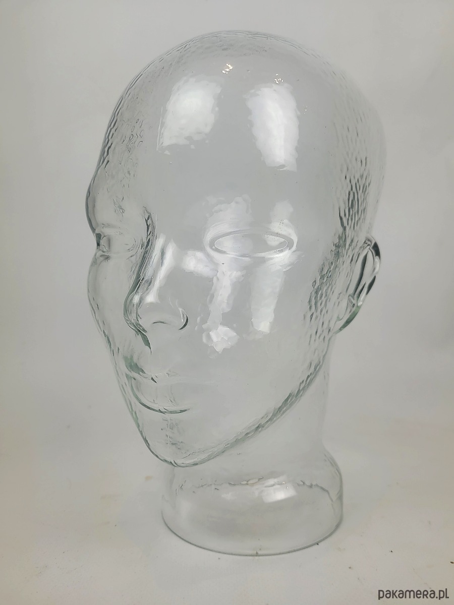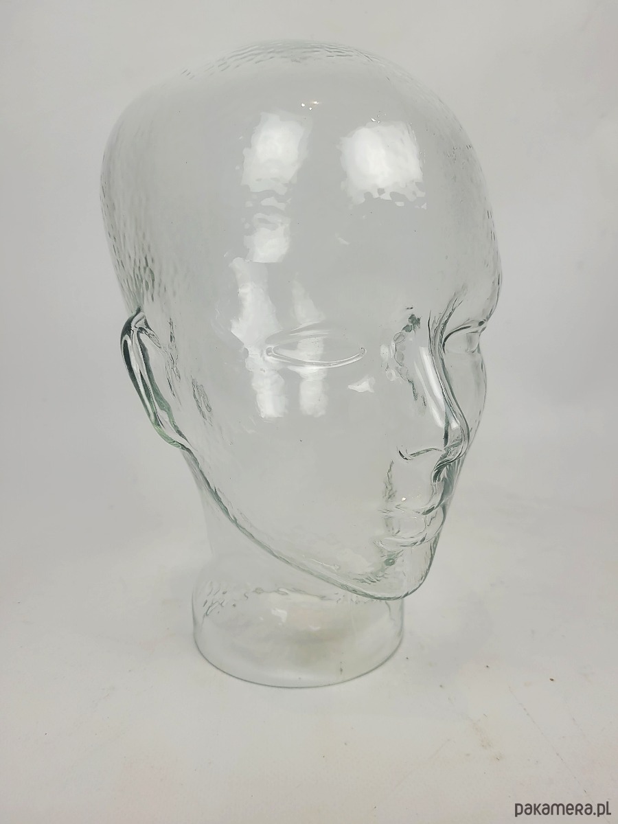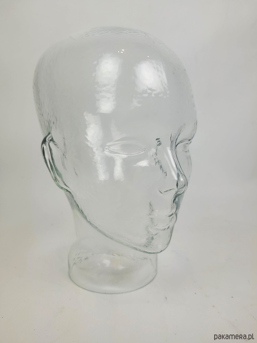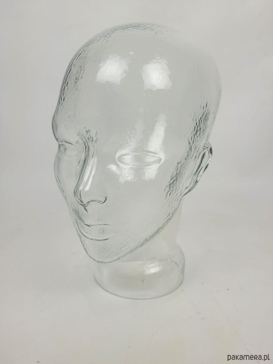 Szklana, dekoracyjna głowa z lat 70. Może posłużyć jako stojak na słuchawki lub czapki. Stan zachowania bardzo dobry.
