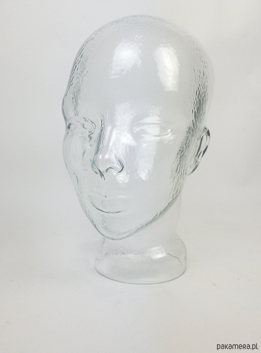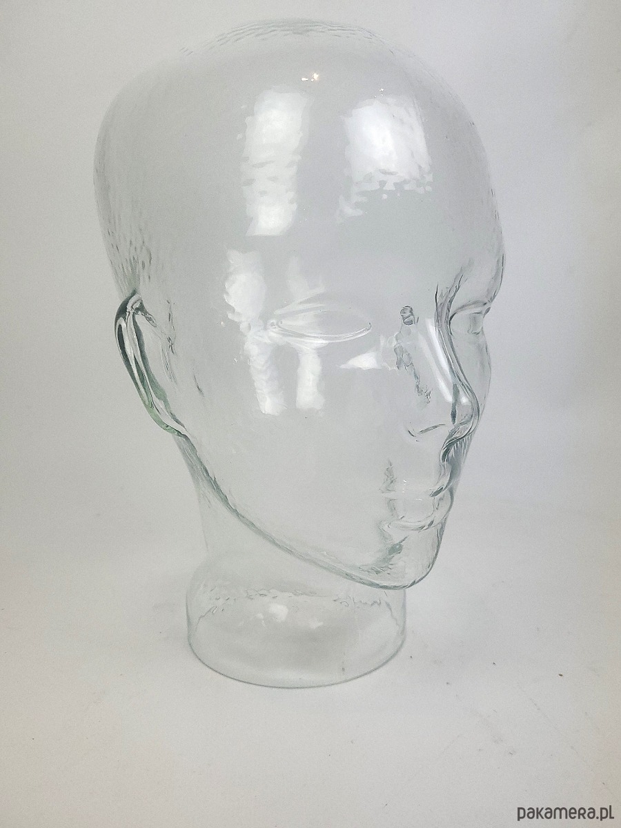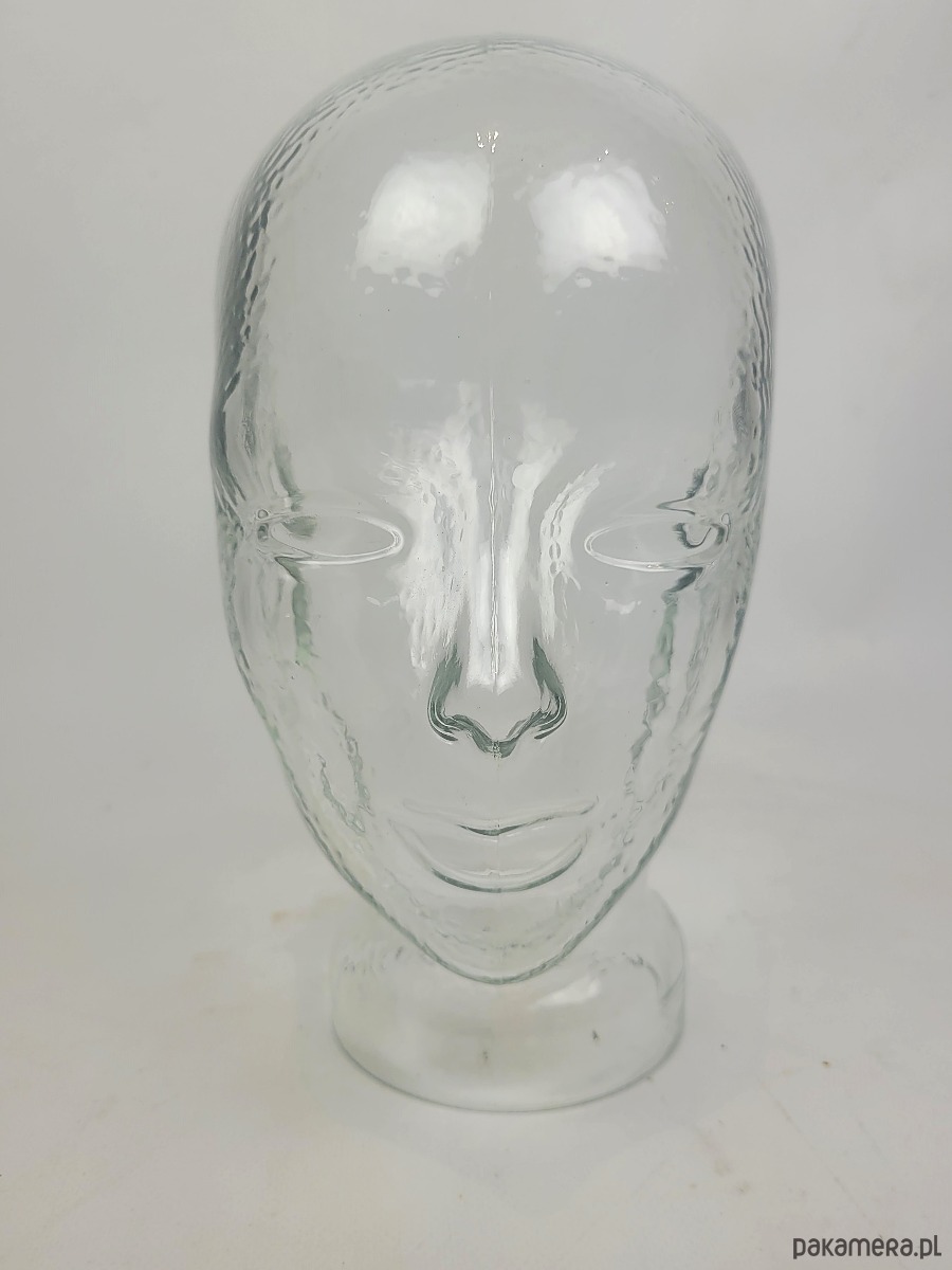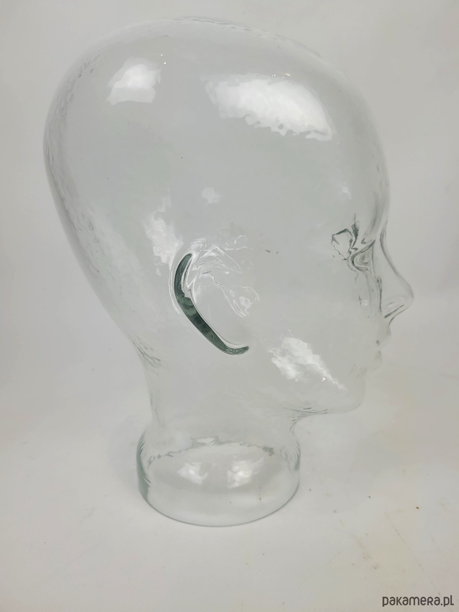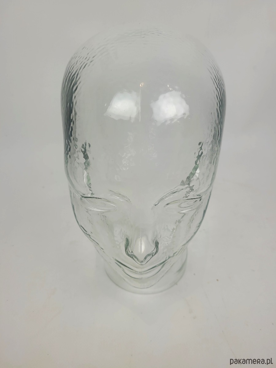 Szklana, dekoracyjna głowa z lat 70. Może posłużyć jako stojak na słuchawki lub czapki. Stan zachowania bardzo dobry.