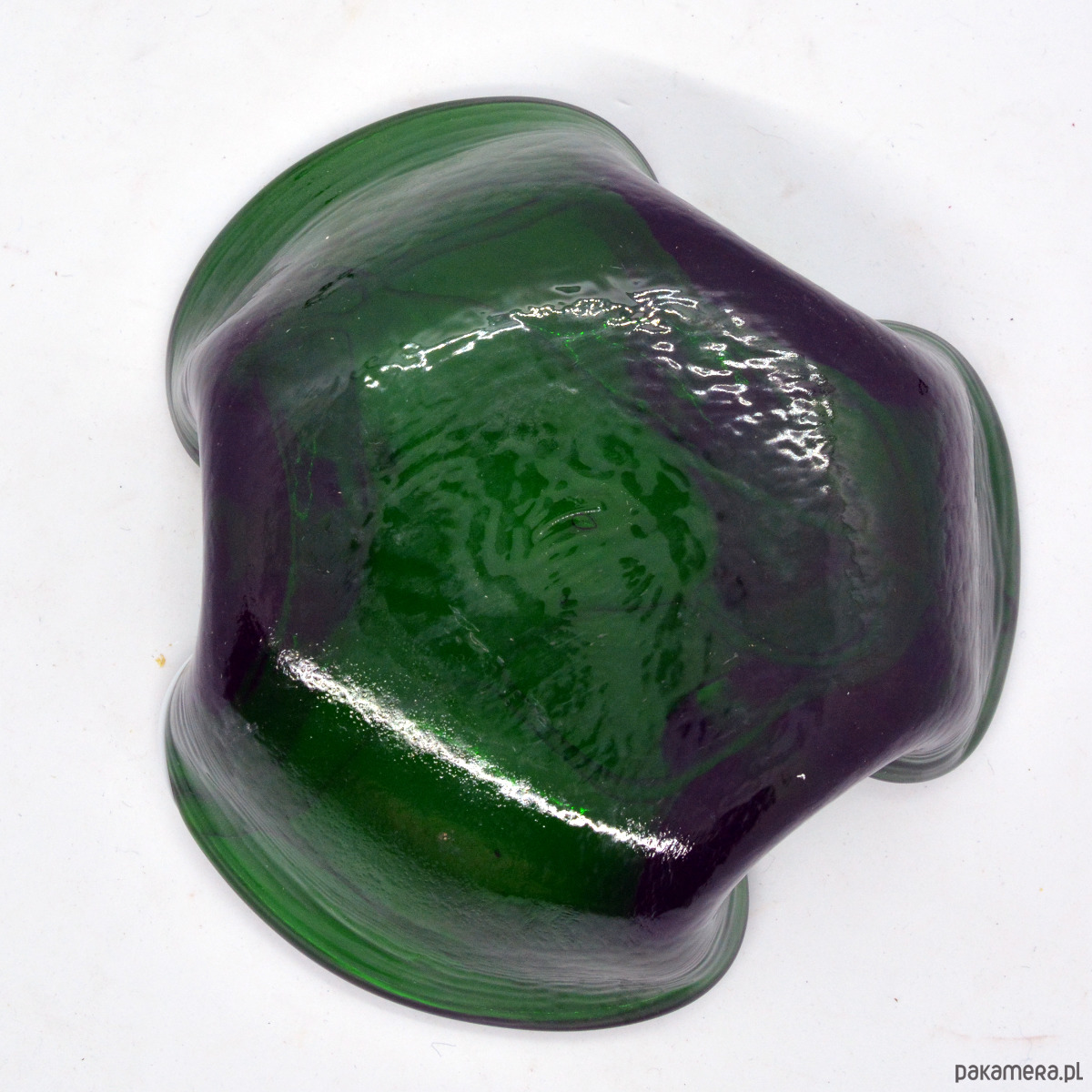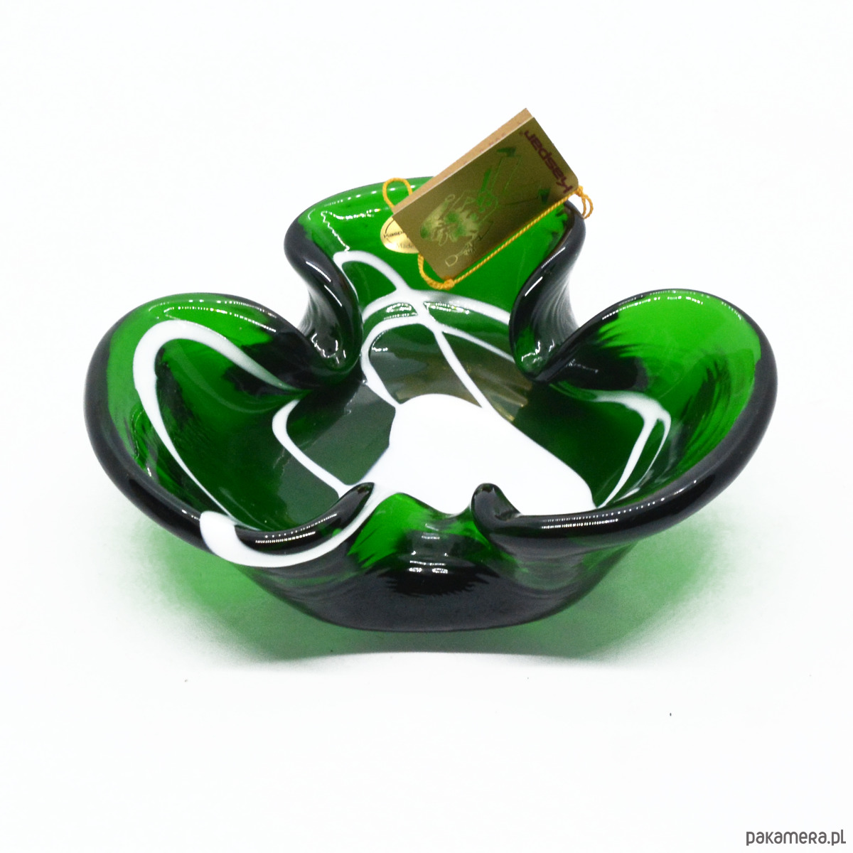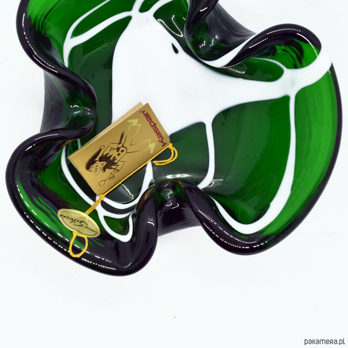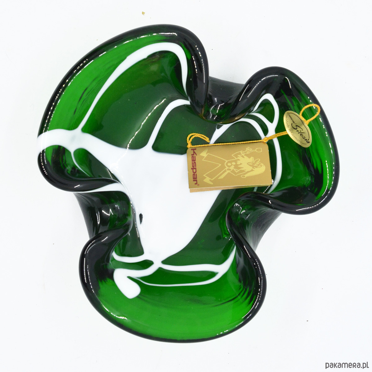 Ręcznie wykonana misa ze szkła kryształowego ołowiowego wyprodukowana w latach 70. przez Kaspar Single Art. Misa w kolorze szkła butelkowego z białymi, nieprzeźroczystymi zdobieniami. Może również pełnić funkcję popielniczki.