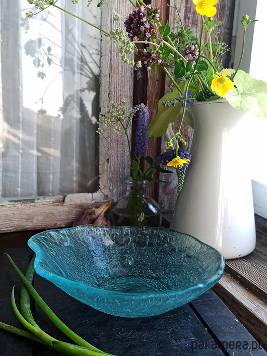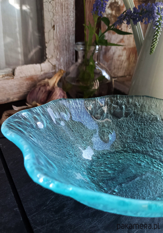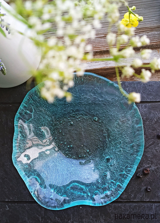 Wyjątkowa miseczka wykonana ręcznie z bezbarwnego szkła w technice fusingu .Wypalona w temperaturze powyżej 800 stopni. Pofalowany, nieregularny brzeg oraz bogata faktura widoczna poprzez transparentne szkło nadaje naczyniu organicznego charakteru. Delikatnie zielonkawy odcień jest naturalnym kolorem użytej tafli szkła. Pięknie prezentuje się jako dekoracja, ale także jest w pełni funkcjonalnym naczyniem użytkowym. Sprawdzi się do serwowania przekąsek czy letnich deserów. Średnica miseczki w najszerszym miejscu to 17,5cm, wysokość ok. 5cm.