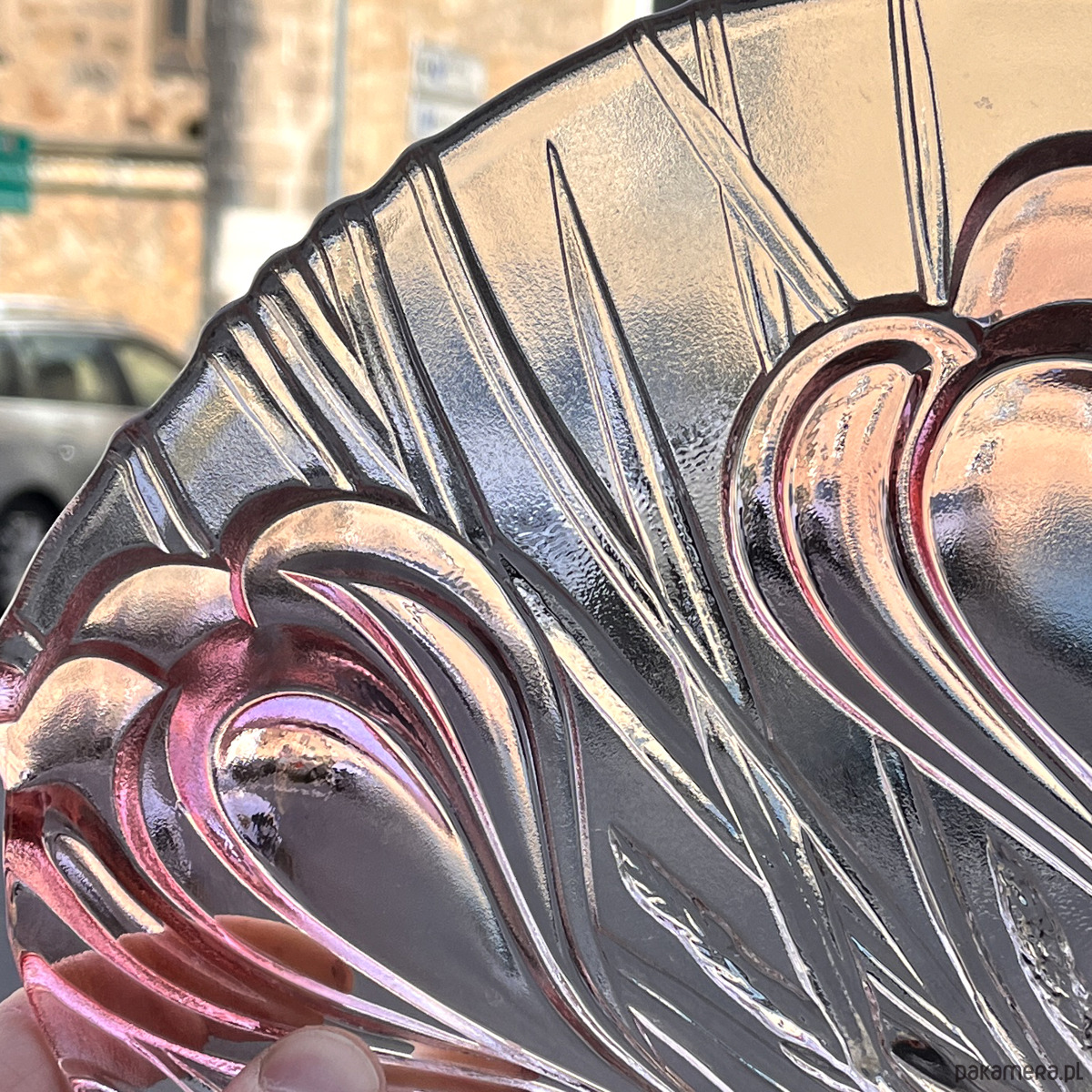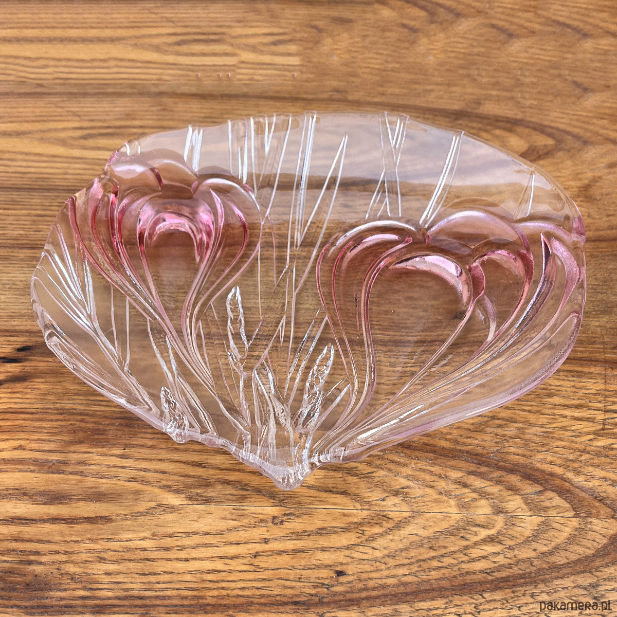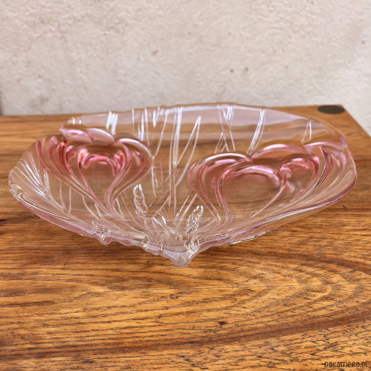 Szklana misa lub patera o nieregularnym kształcie ze zdobieniami różowymi w kształcie krokusów wyprodukowane przez Waltherglas w Niemczech w latach 70. Przedmiot z wielobarwnego szkła kryształowego zachowany w stanie oryginalnym bardzo dobrym, nosi minimalne ślady użytkowania.