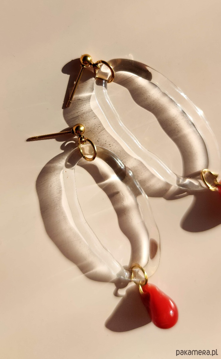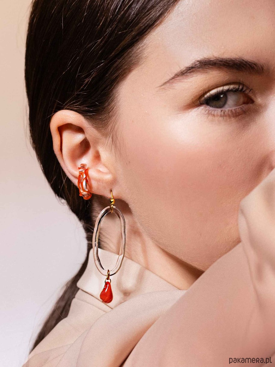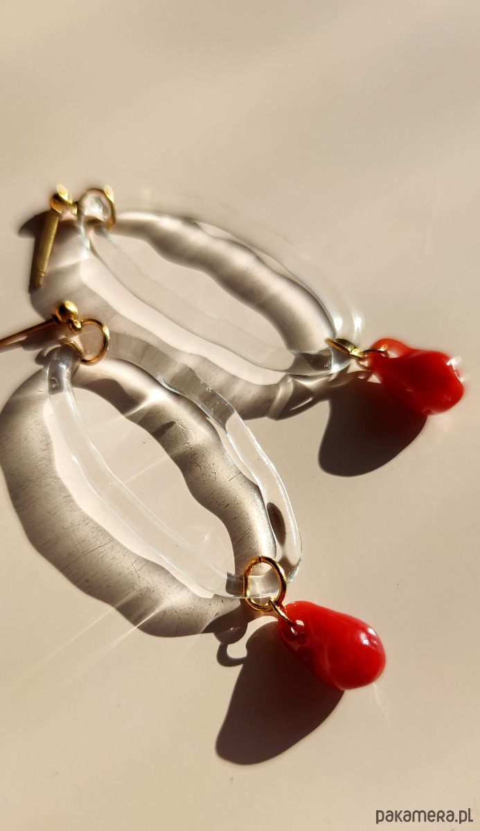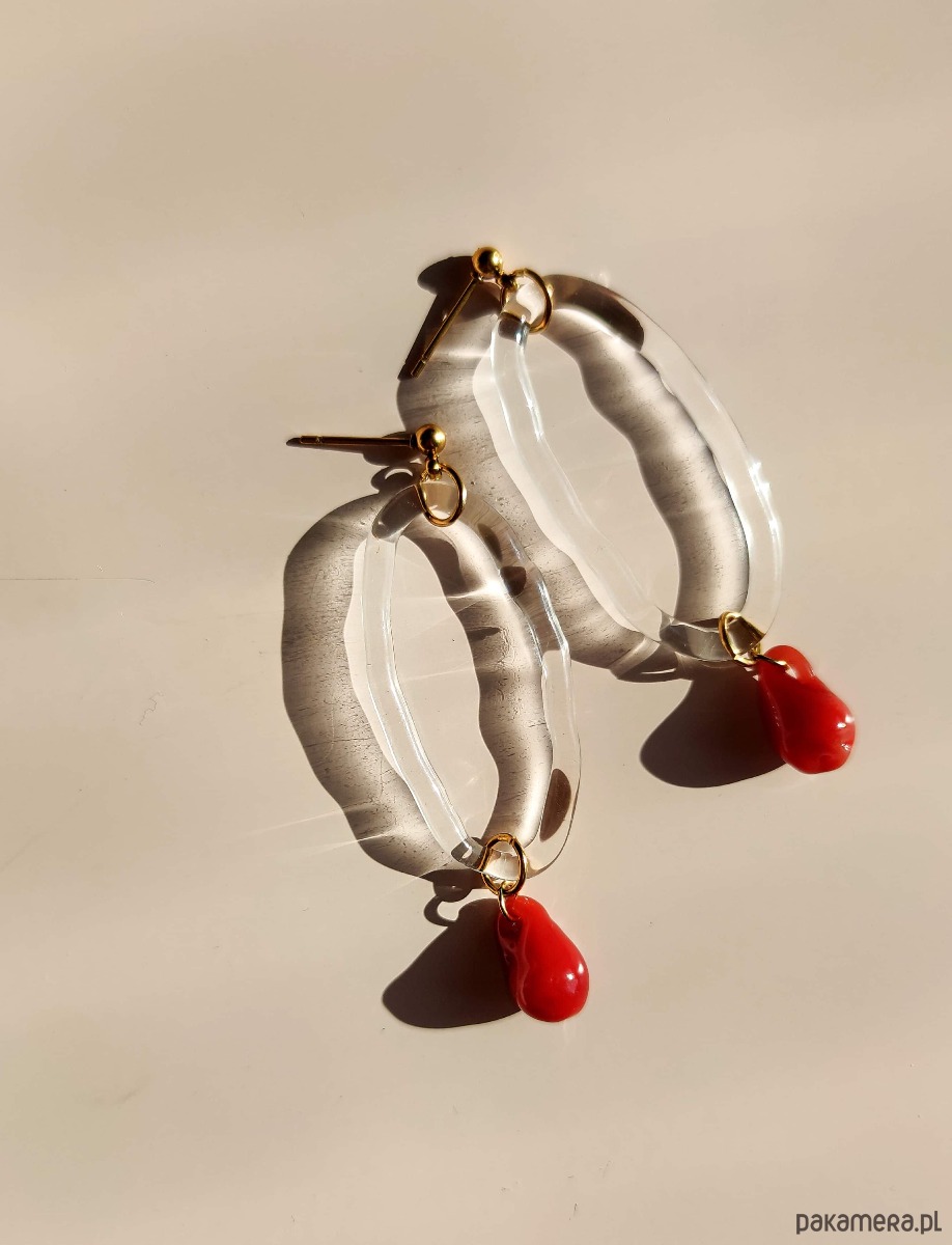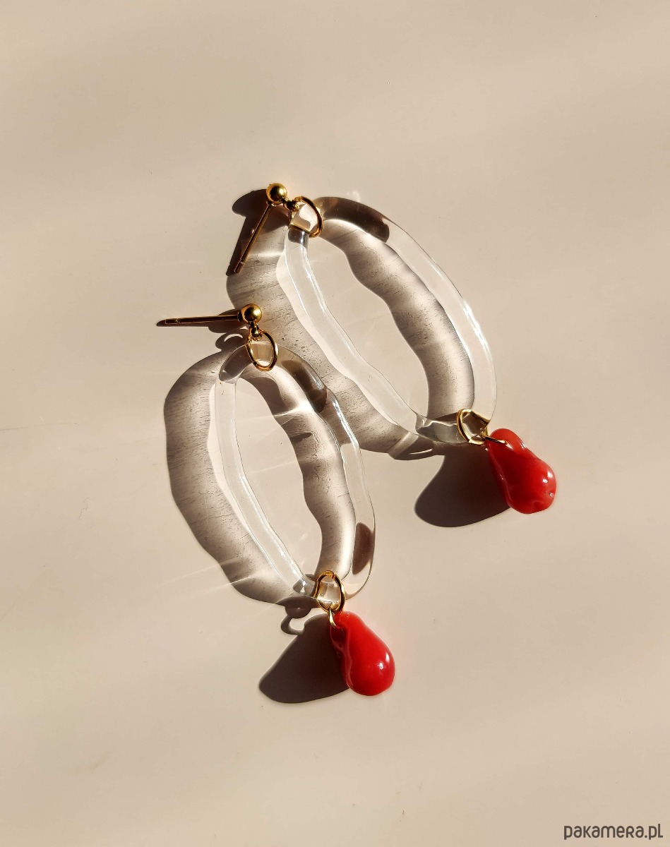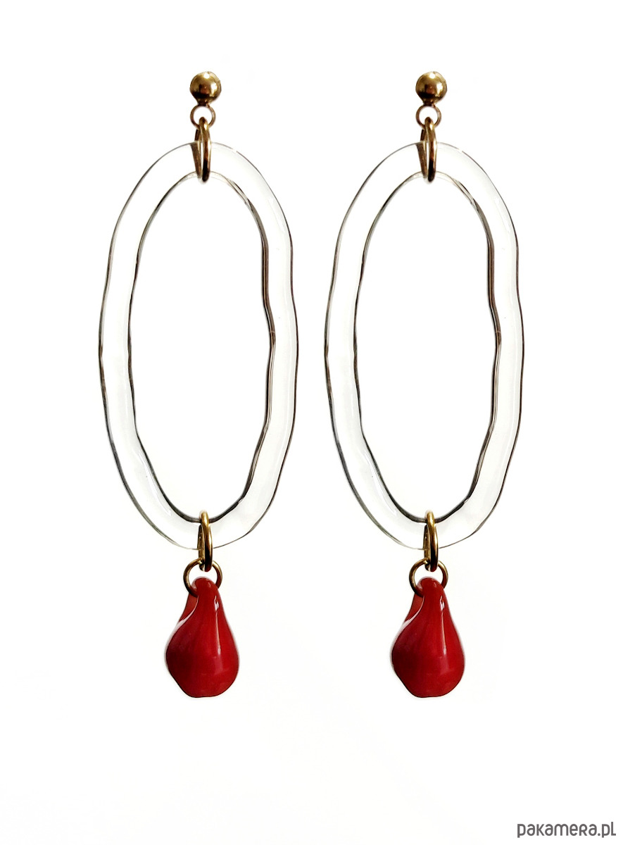 Szklane kolczyki "Coral" - owalny motyw z czerwoną kroplą