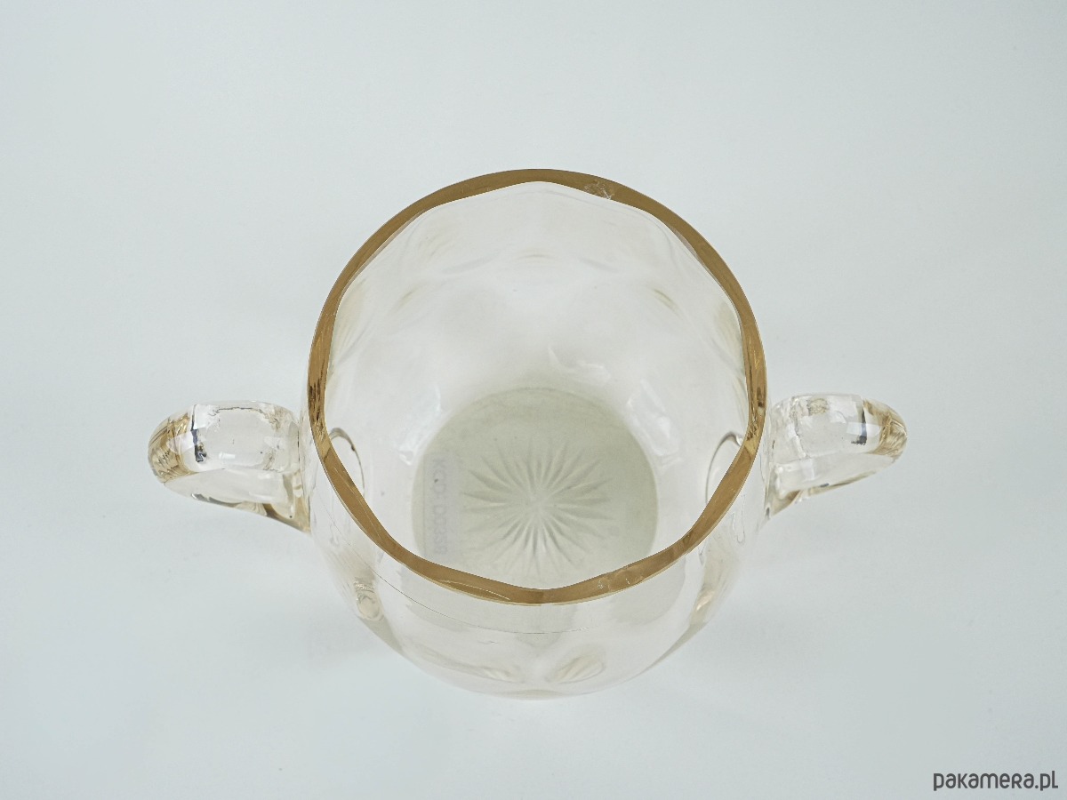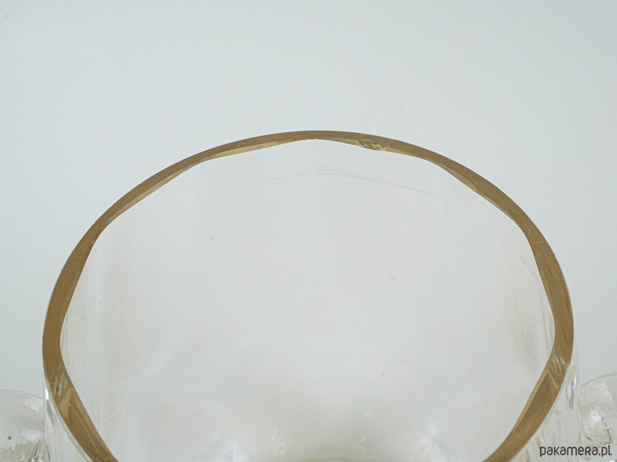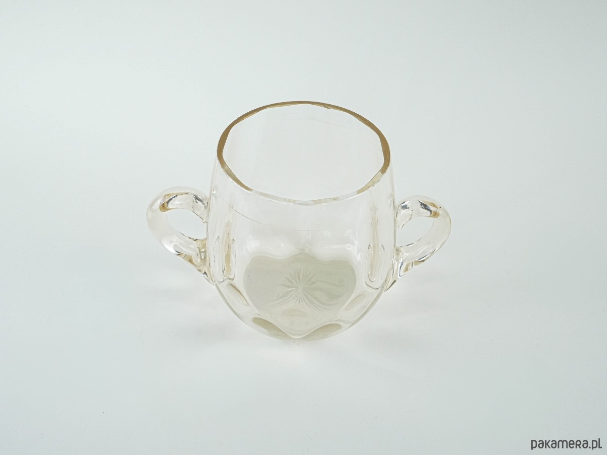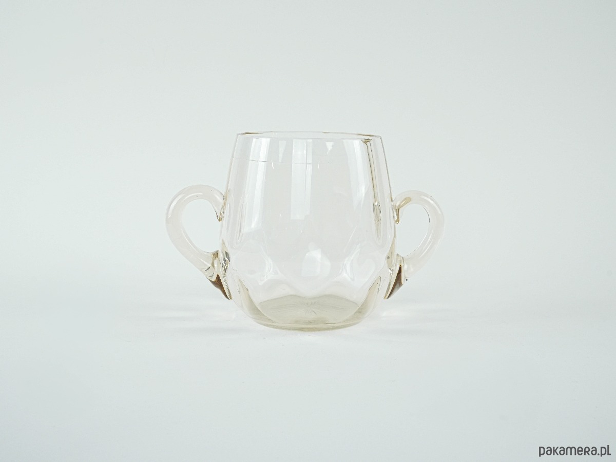 Okazałe, ręcznie dmuchane wiaderko do lodu, wykonane z transparentnego szkła w odcieniu delikatnego bursztynu. Wyposażone w dwa masywne, szklane uchwyty formowane ręcznie oraz subtelny, gwiaździsty szlif na dnie. Stylowy dodatek w klimacie mid-century modern, idealny zarówno do serwowania trunków, jak i jako dekoracyjny element wnętrza.