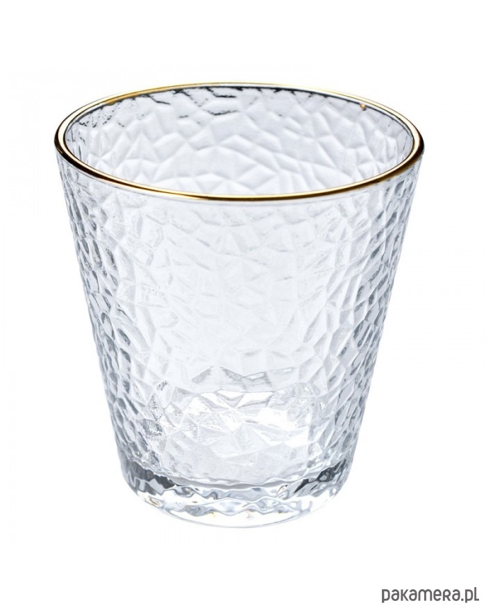 Komplet 12 szklanek wykonanych z transparentnego szkła i ozdobionych ciekawym wzorem. Złota obwódka na obrzeżu dodaje elegancji.