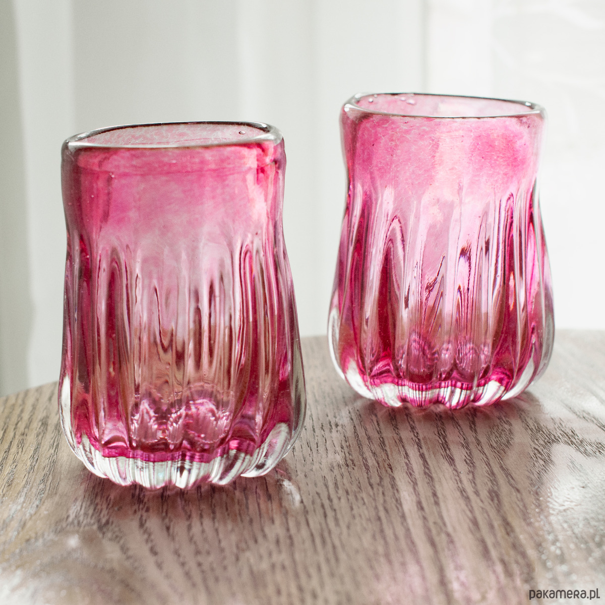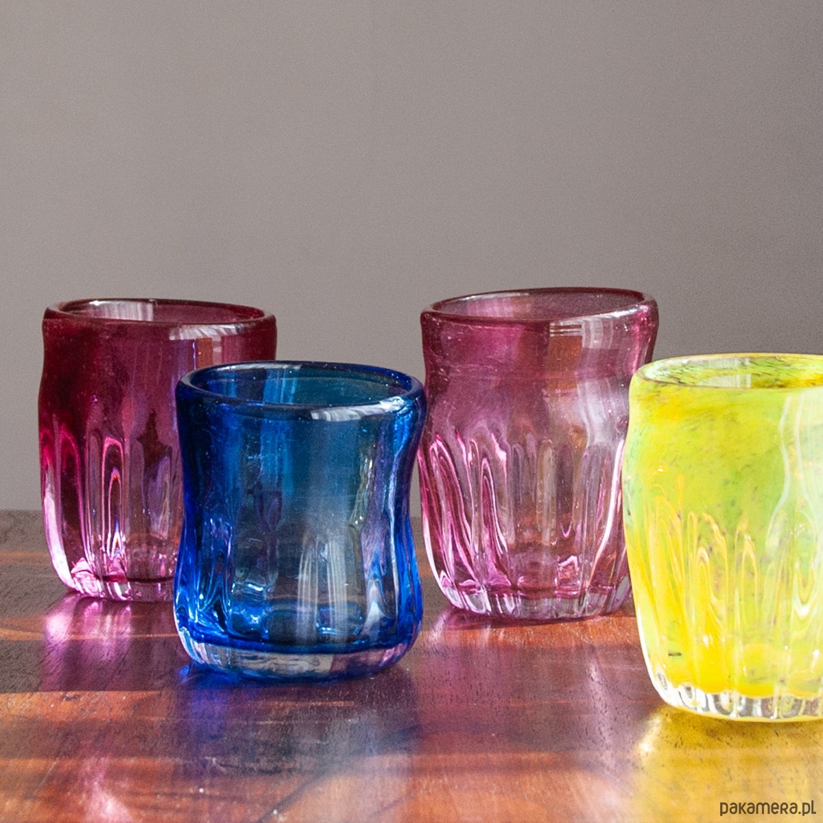 Szklanka „Optyk” powstała w wyniku wykorzystania metalowej przedformy dawniej używanej przez hutników do produkcji szkła w technice zwanej optyk. Wykorzystując pierwszy etap tej popularnej techniki uzyskałem fakturę szkła która w kolejnym etapie została podgrzana. W wyniku wysokiej temperatury szkło się zdeformowało i wygładziło. W tym procesie każda kolejna szklanka jest nieco inna od następnej. Do barwienia masy użyłem kolorowej fryty szklanej.