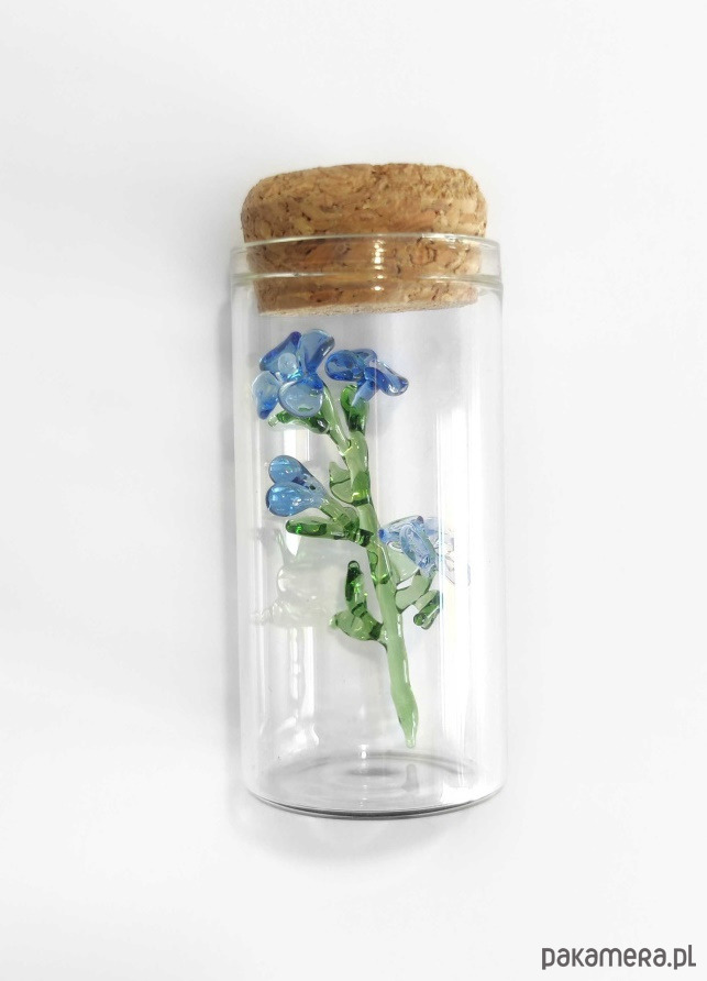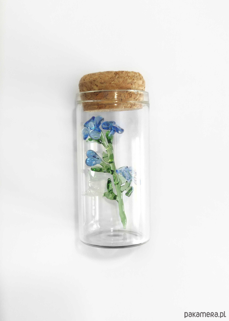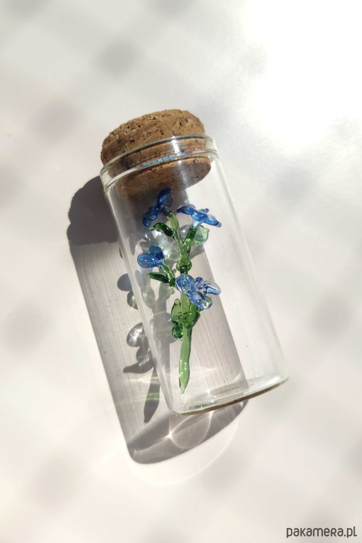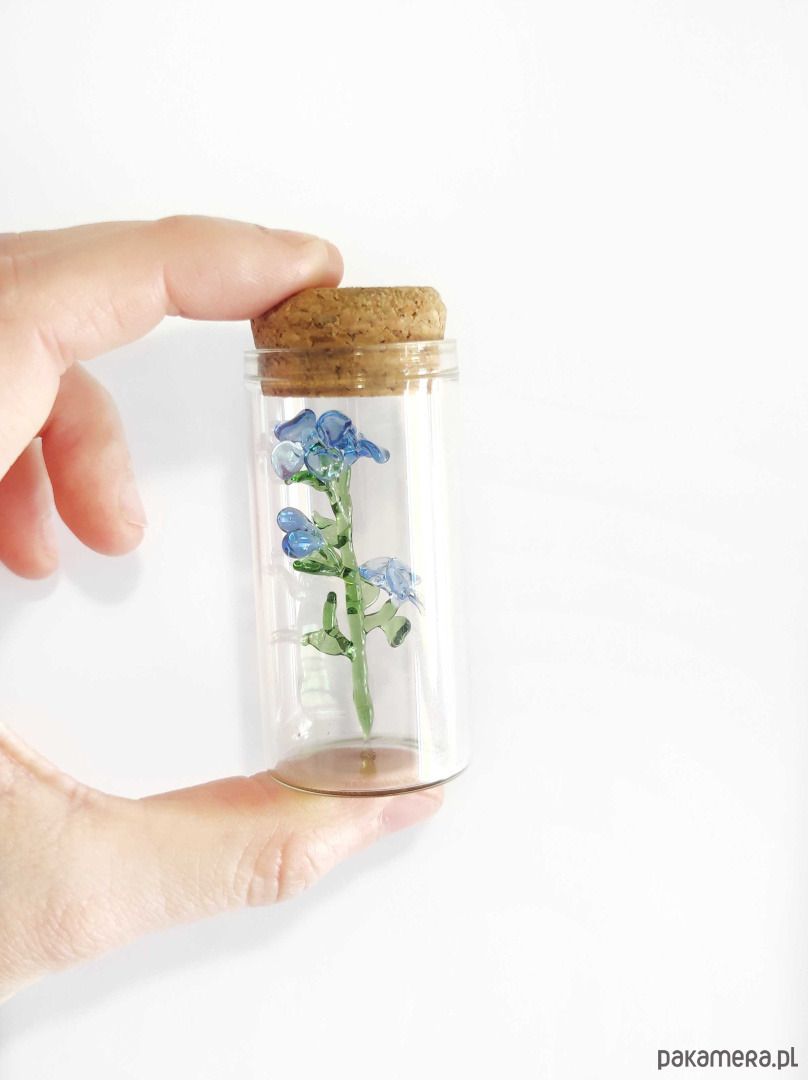 Drobna szklana gałązka kwiatów niezapominajki zamknięta w szklanej buteleczce.