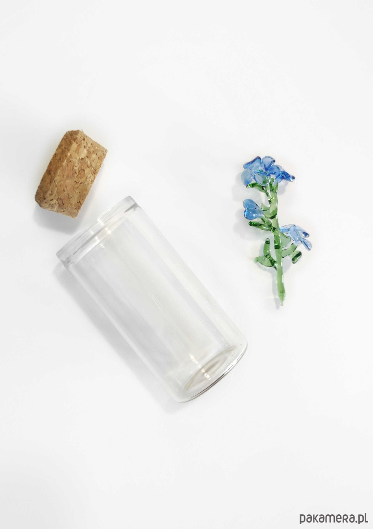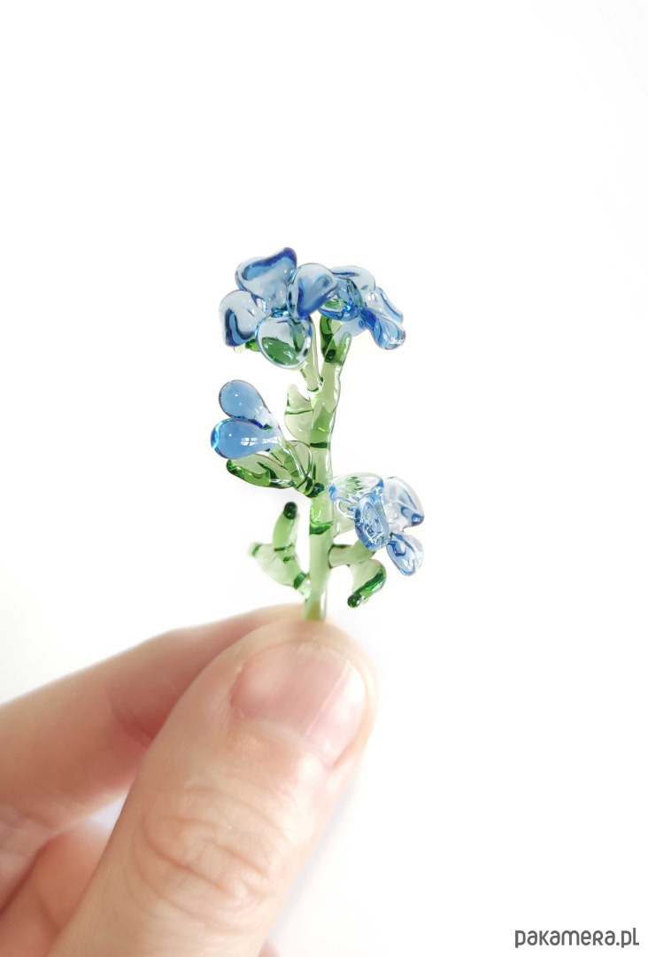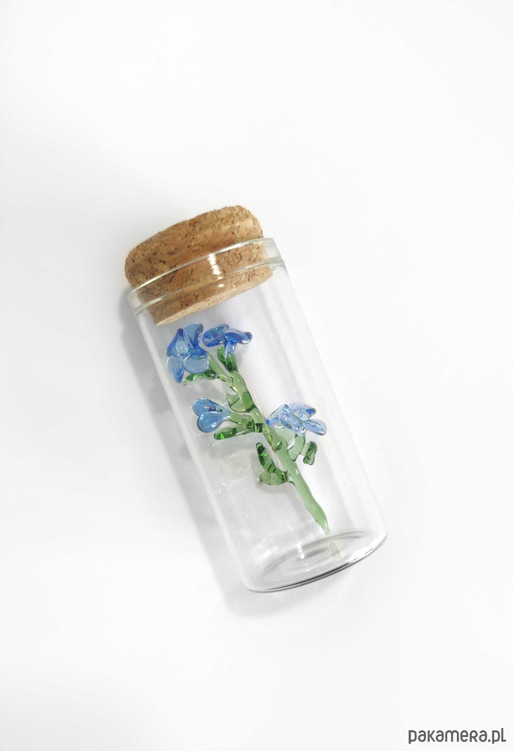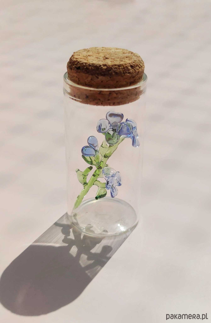 Drobna szklana gałązka kwiatów niezapominajki zamknięta w szklanej buteleczce.