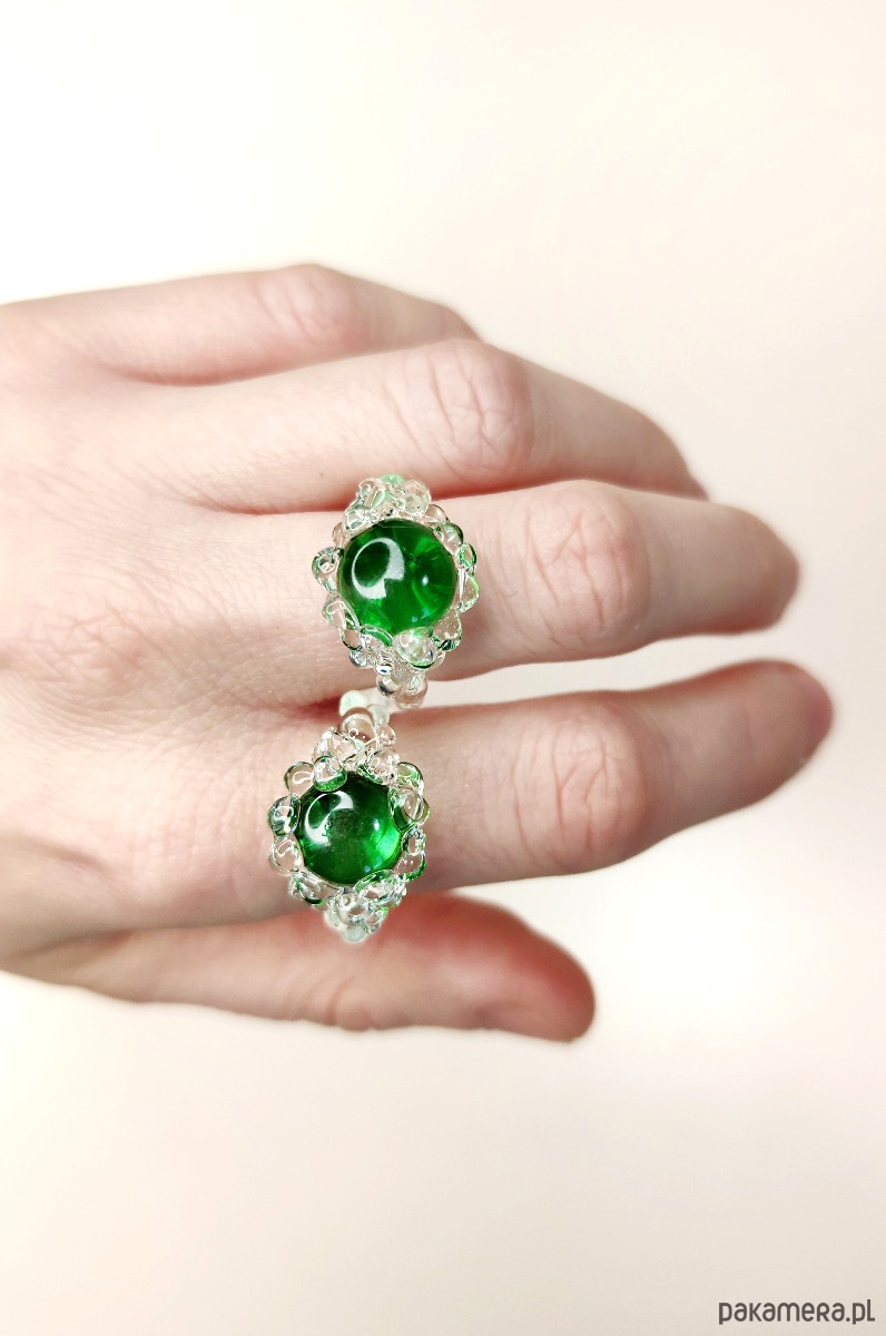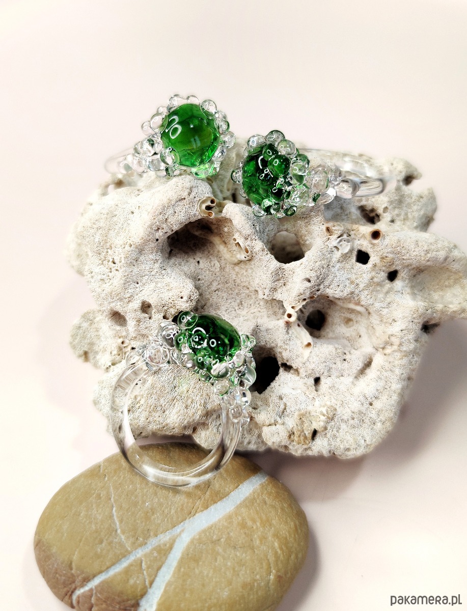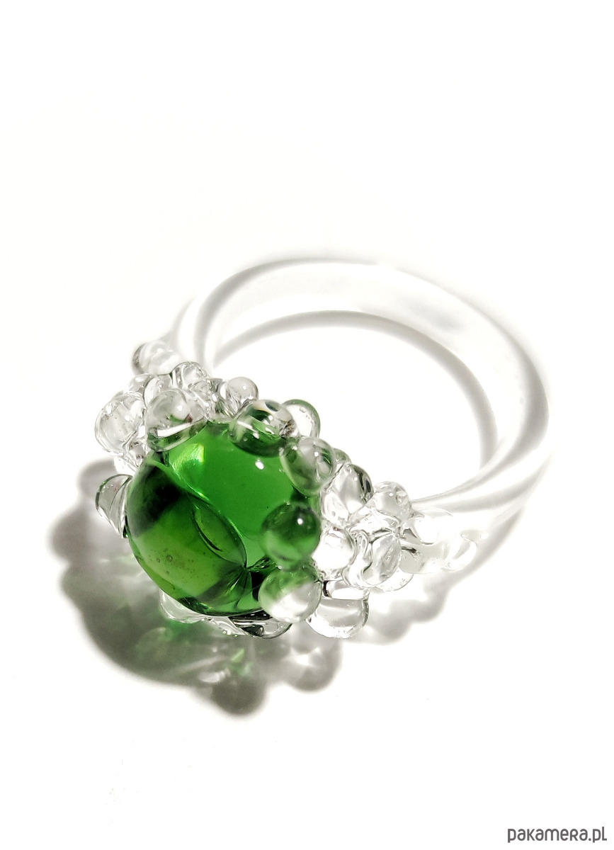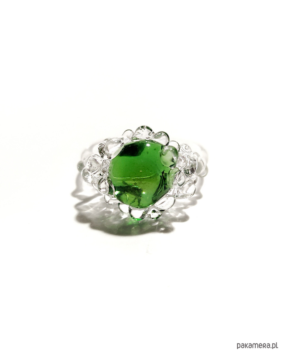 Pierścionek został uformowany ze szkła borokremowego. Zdobienie wykonane jest z kaskady transparentnych, szklanych kropli, których centrum umieszczona została idealnie gładka tafla koloru.