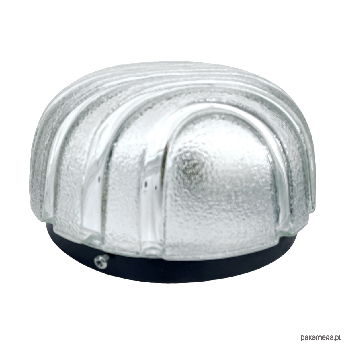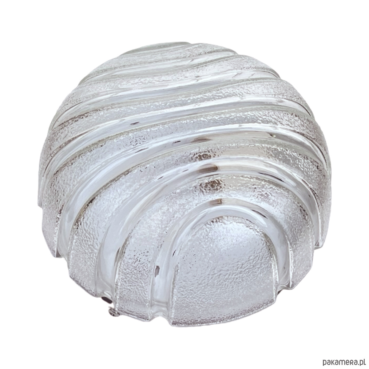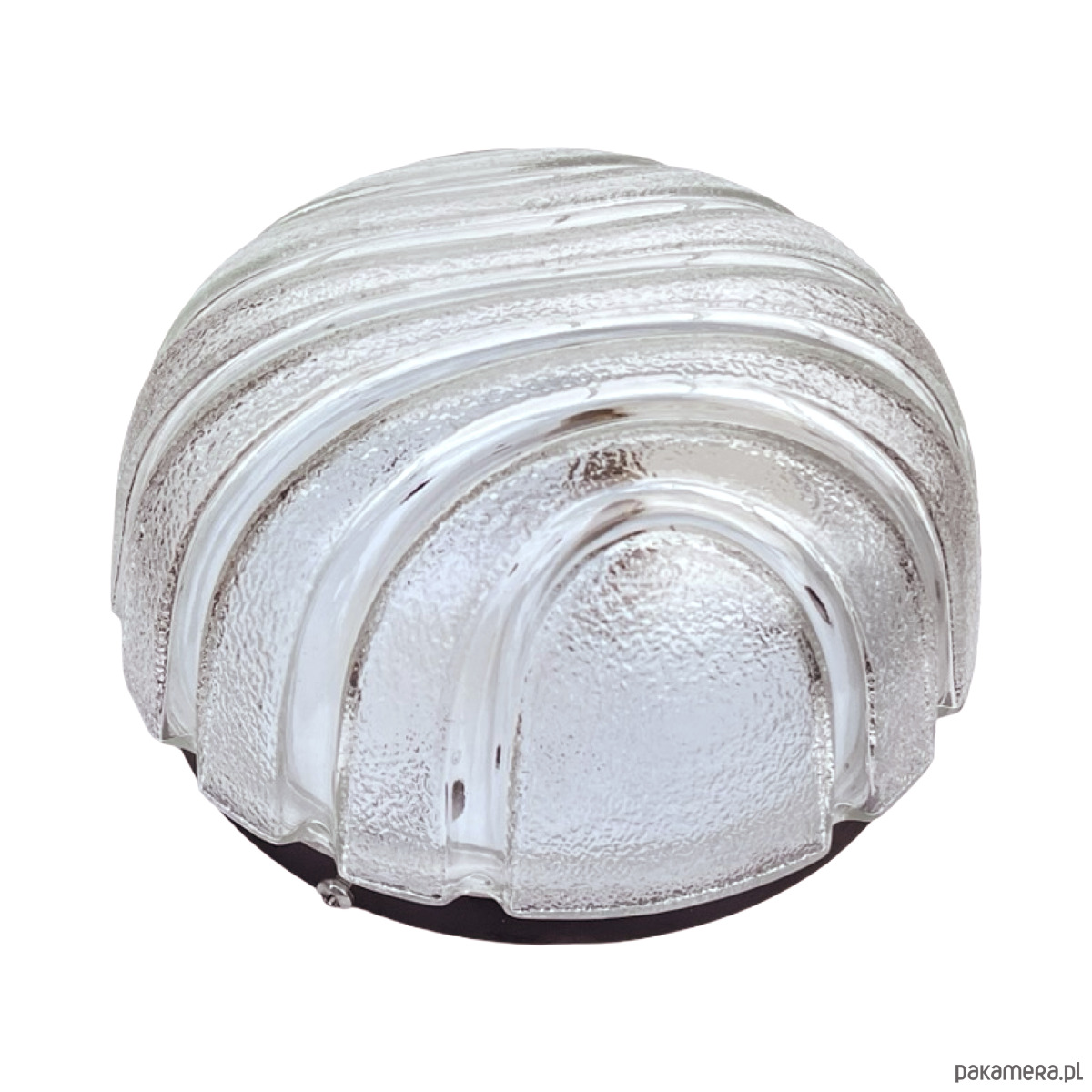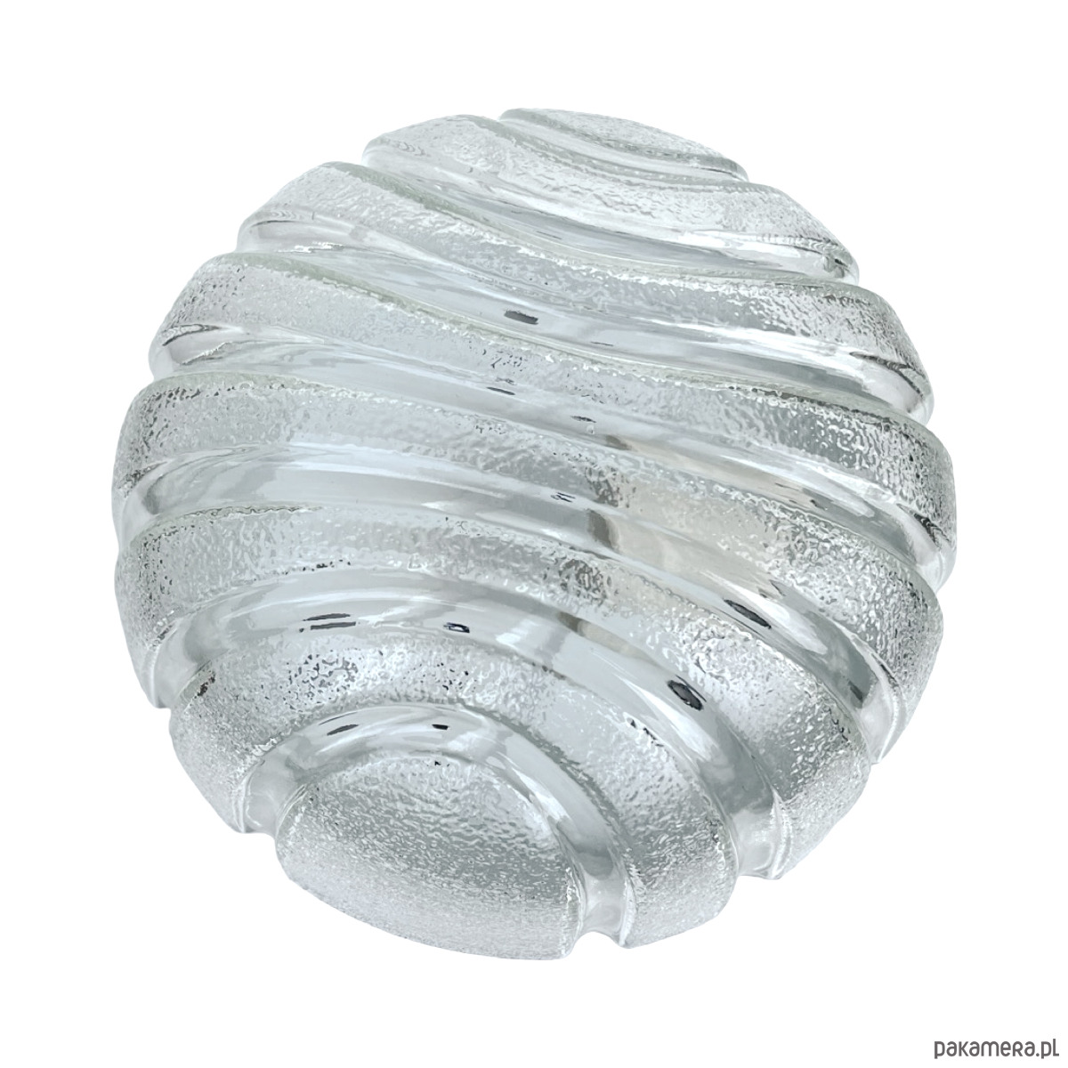 Szklany, transparentny klosz o ciekawej fakturze inspirowanej piłką do koszykówki przyciąga wzrok i pięknie rozprasza światło. Czarna, stalowa podstawa nadaje całości elegancki, industrialny charakter. Przeznaczony na pojedynczą żarówkę z gwintem E27, plafon sprawdzi się zarówno w salonie, sypialni, jak i przedpokoju.