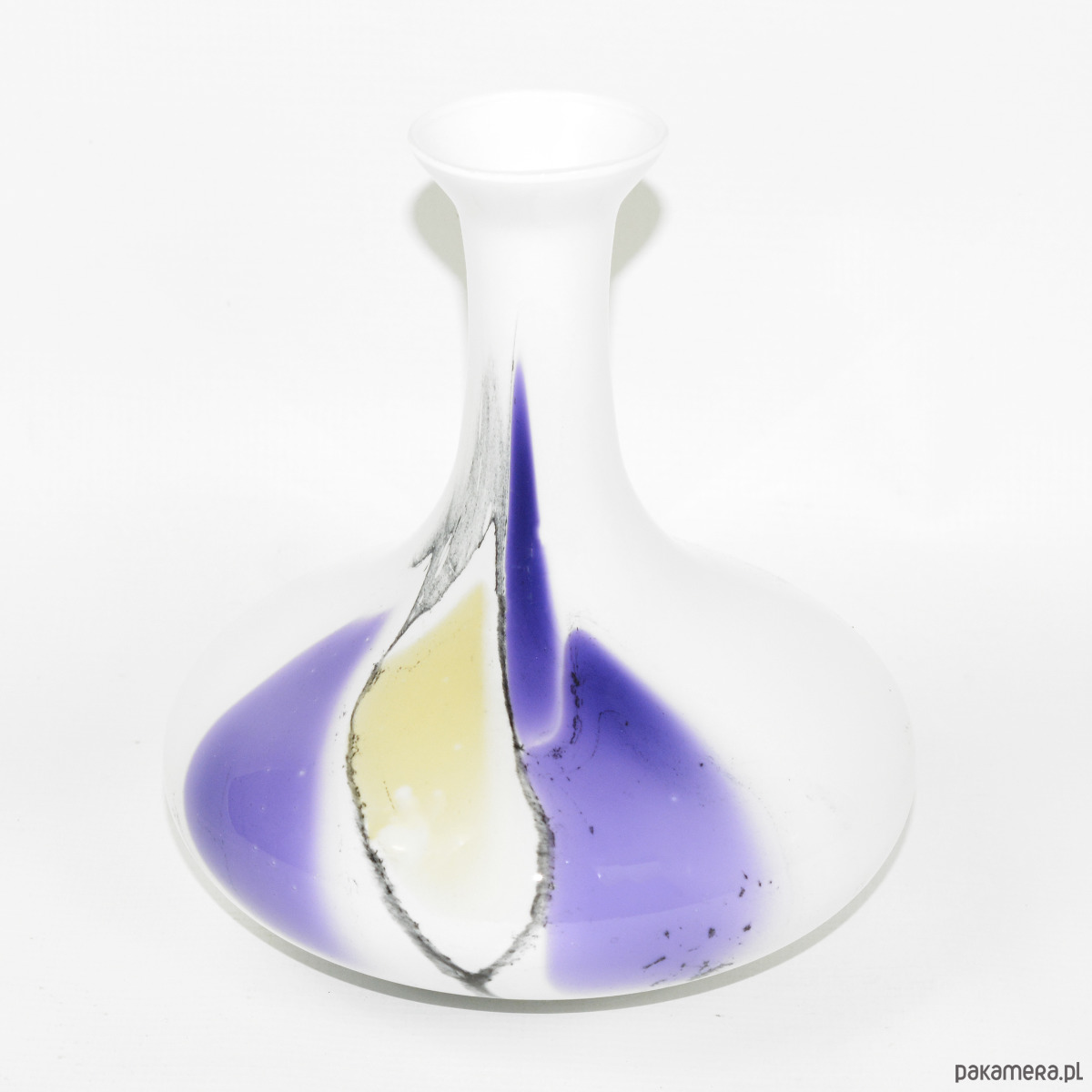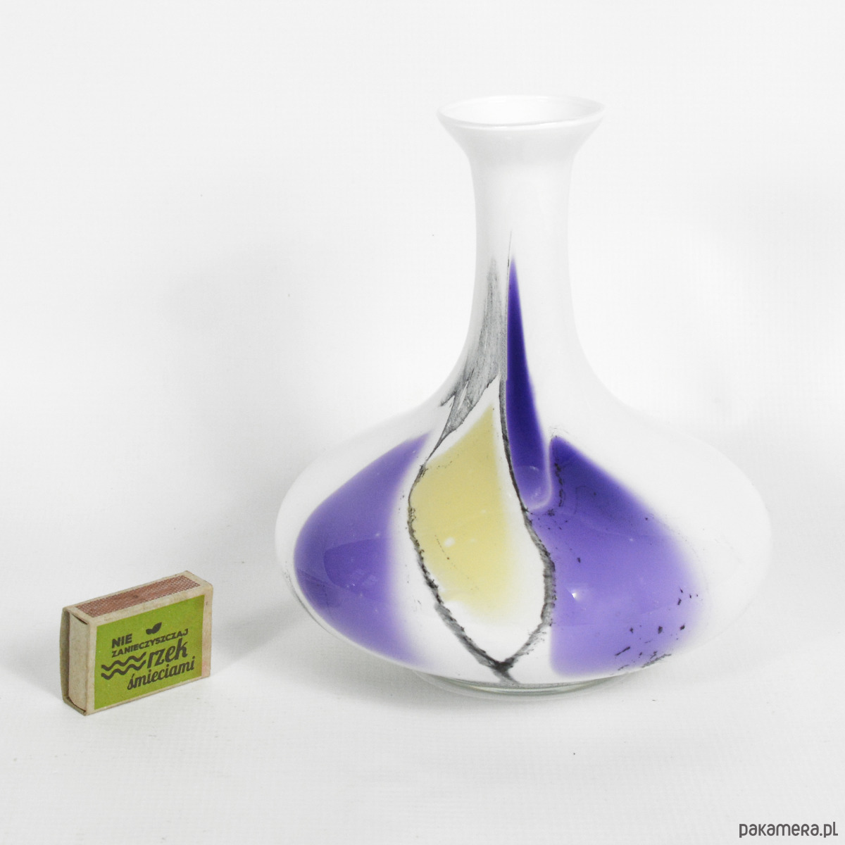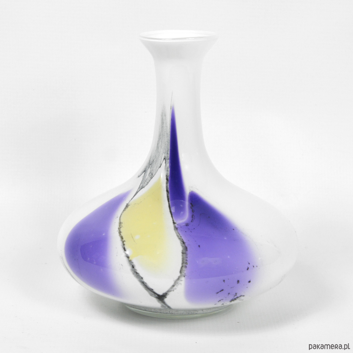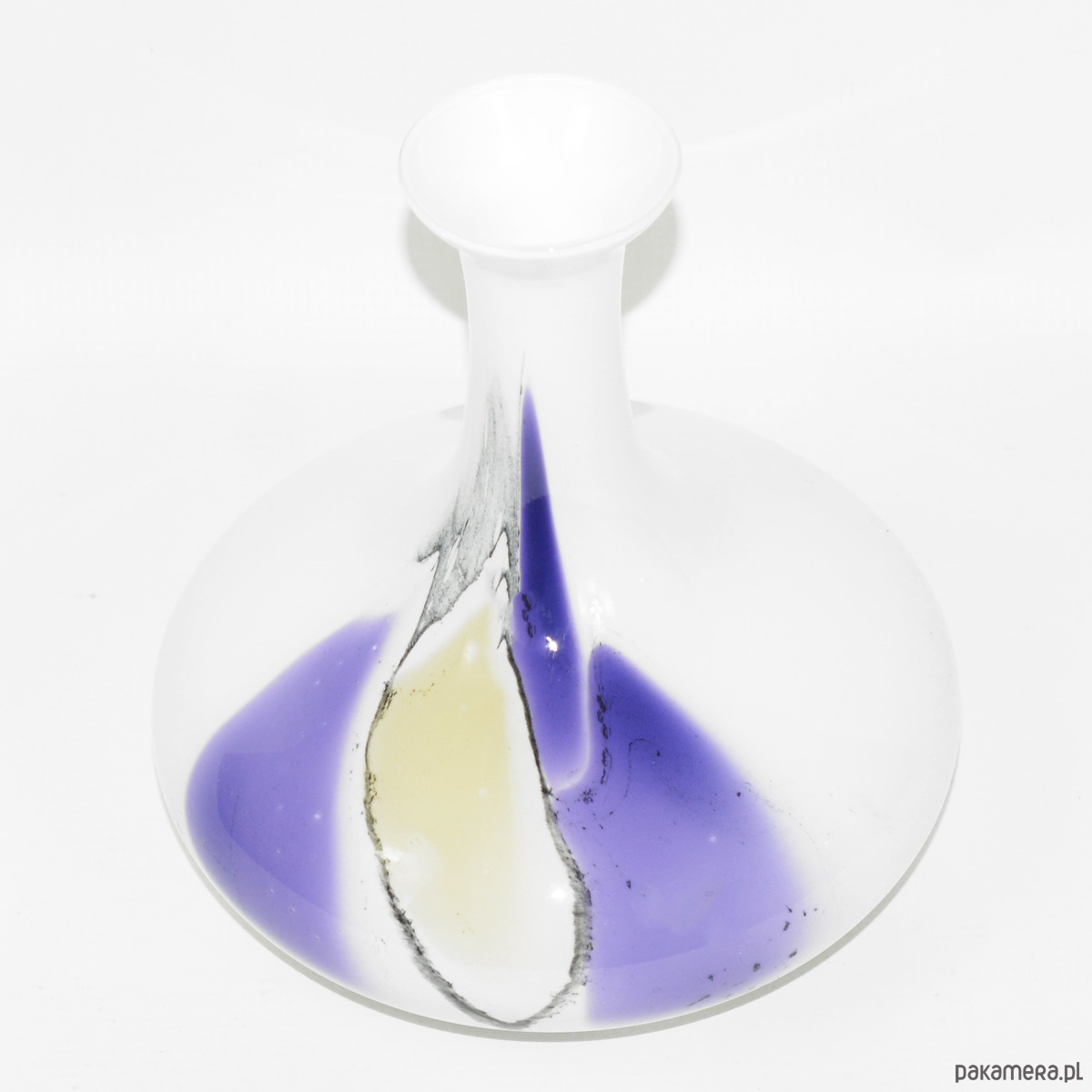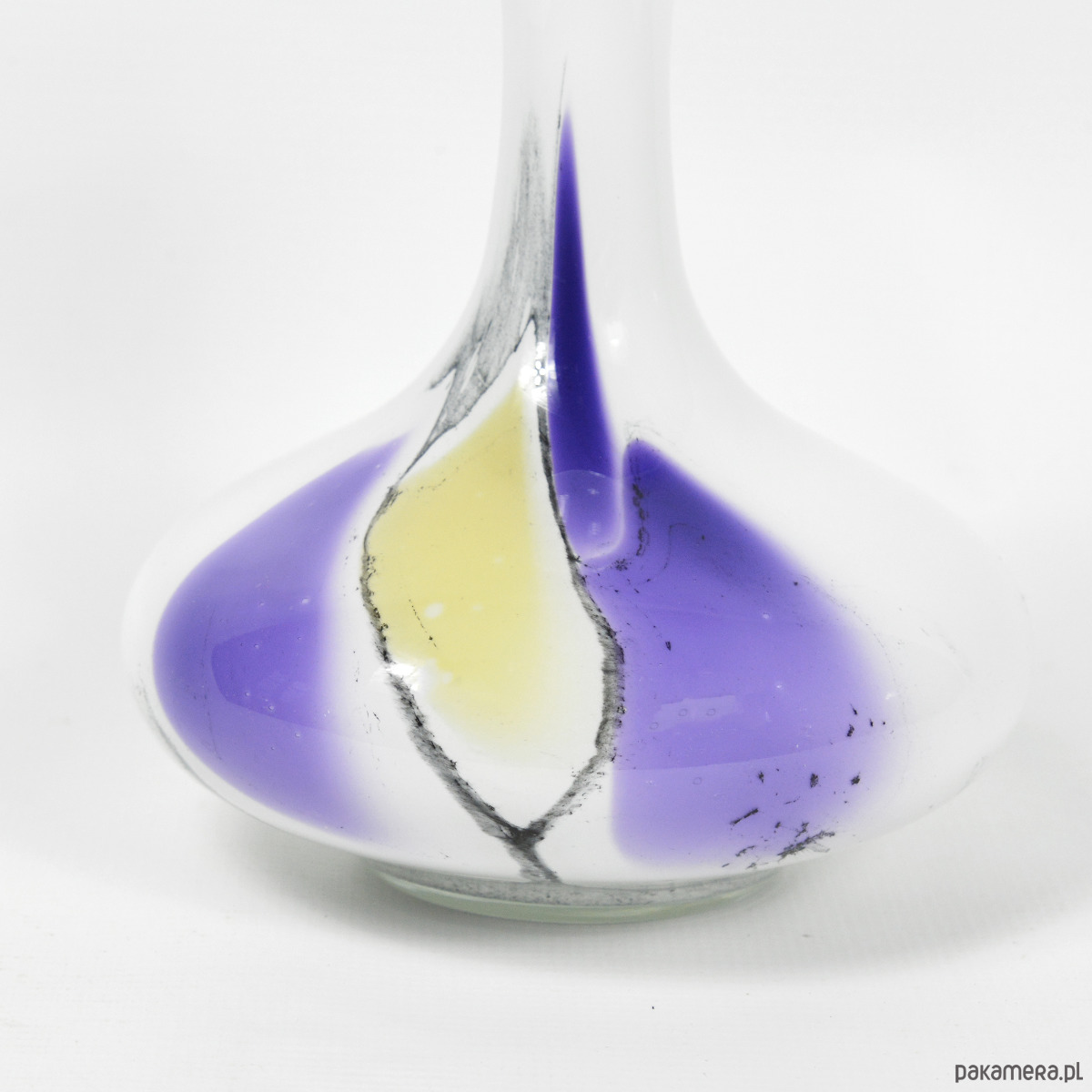 Wielobarwna misa pochodząca z Niemiec z lat 70. Wyprodukowana została dla Zieher seria International Collection. Jest ręcznie formowana ze szkła białego z elementami techniki spotted, tak zwanego szkła końca dnia, stworzone z wielobarwnych stopionych drobinek szkła. Wazon formowana ręcznie. Przedmiot w stanie oryginalnym bardzo dobrym, nosi niewielkie ślady użytkowania, sygnowany od spodu.Wymiary: wysokość 22 cm | średnica 17 cm | średnica podstawy 9 cm | średnica wlewu 5 cm