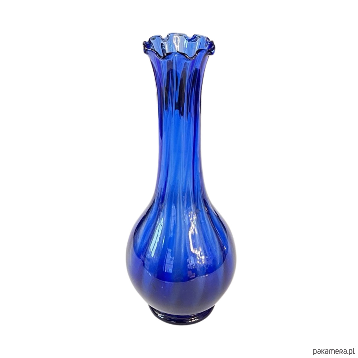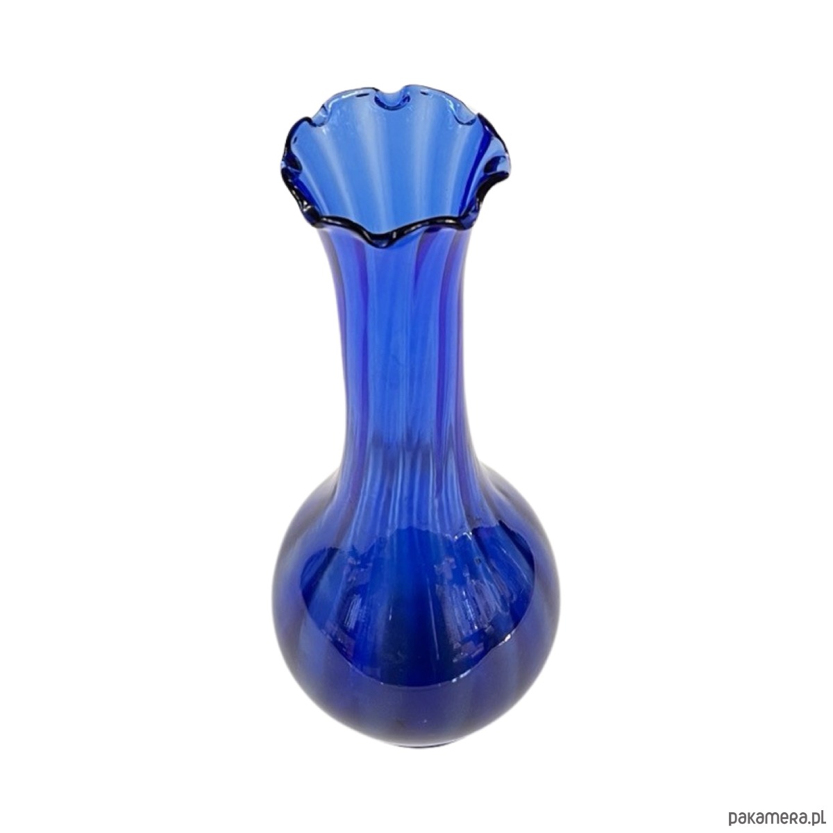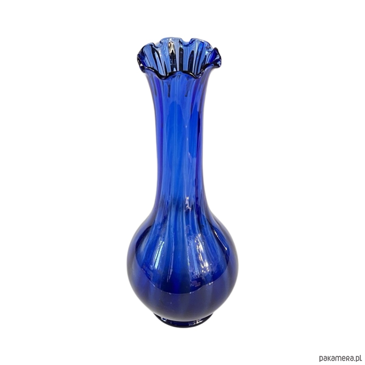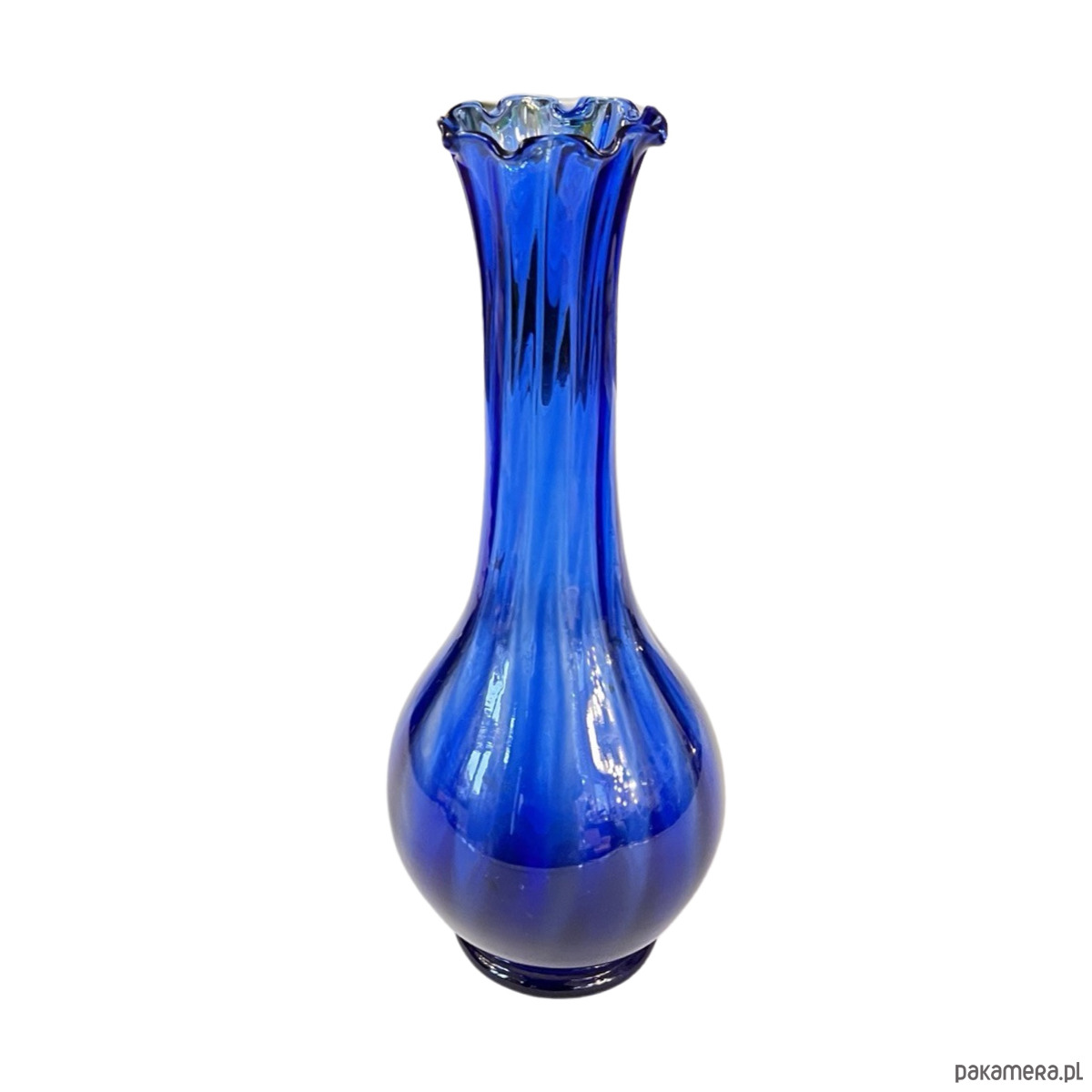 Niebieski wazon szklany, który został wyprodukowany w Niemczech przez manufakturę Farbglashutte Lauscha Thüringen w latach 70. Przedmiot wykonany ręcznie ze szkła dmuchanego. Wazon w klasycznym kształcie zachowany w stanie idealnym, praktycznie nie nosi śladów użytkowania. Piękny przykład niemieckiego wzornictwa przemysłowego.