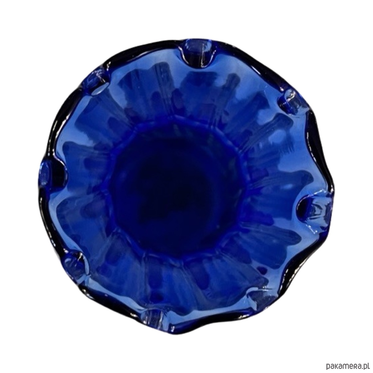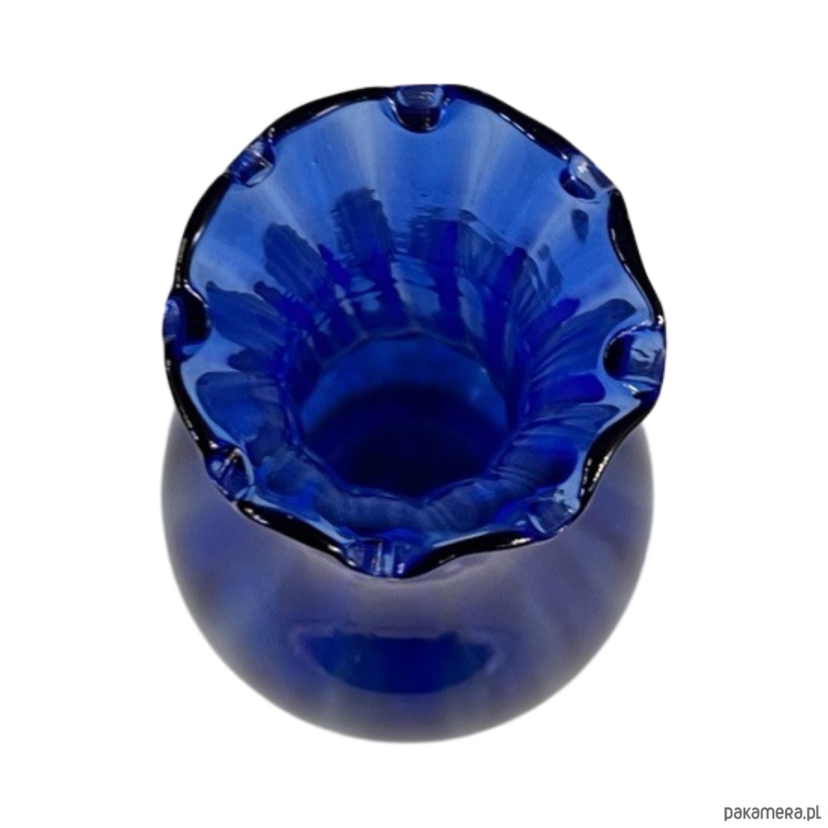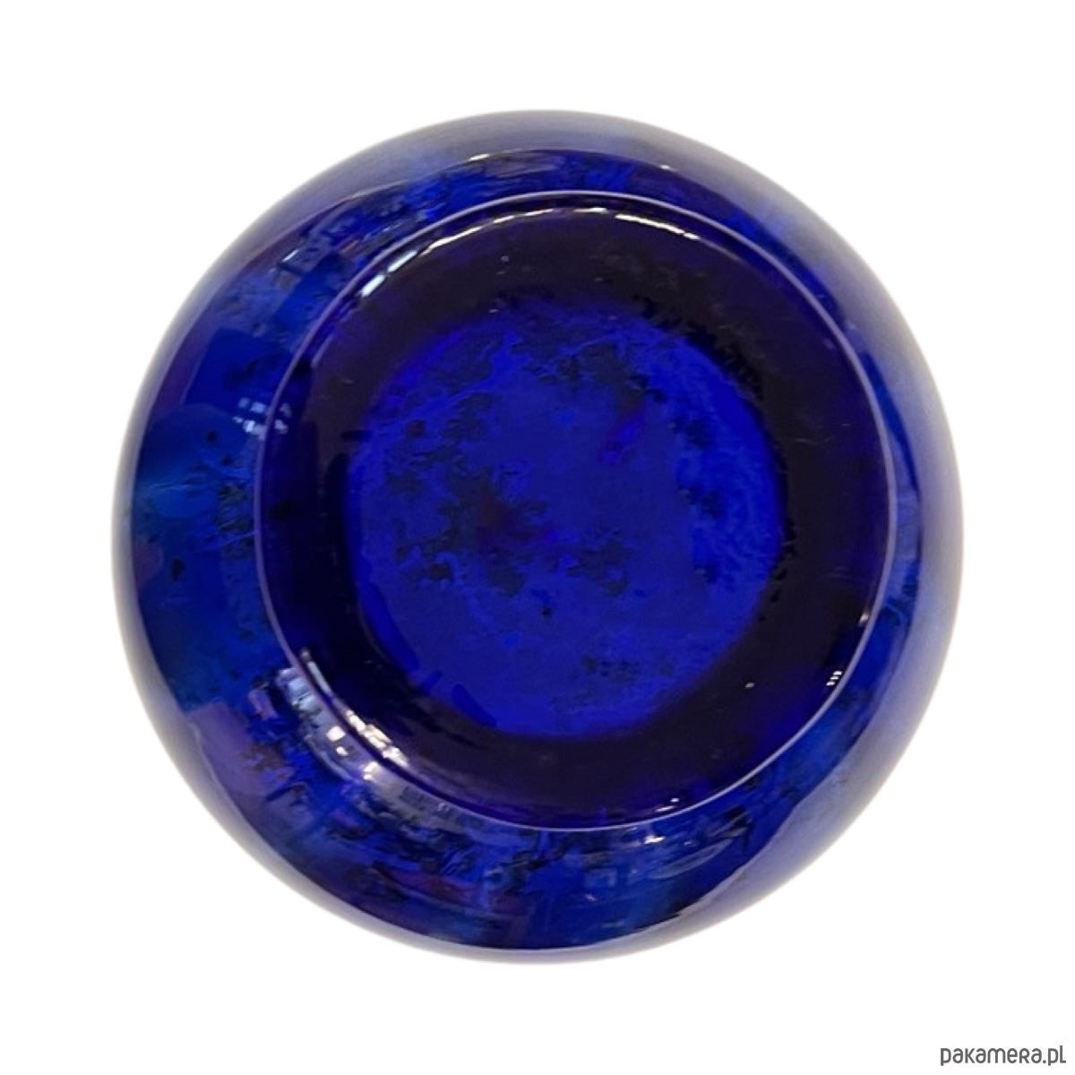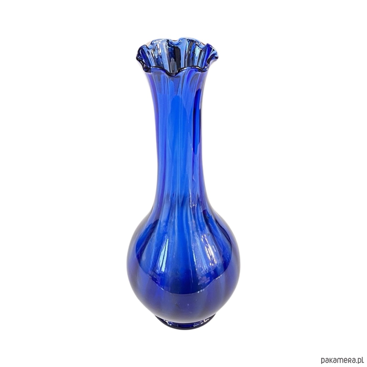 Niebieski wazon szklany, który został wyprodukowany w Niemczech przez manufakturę Farbglashutte Lauscha Thüringen w latach 70. Przedmiot wykonany ręcznie ze szkła dmuchanego. Wazon w klasycznym kształcie zachowany w stanie idealnym, praktycznie nie nosi śladów użytkowania. Piękny przykład niemieckiego wzornictwa przemysłowego.