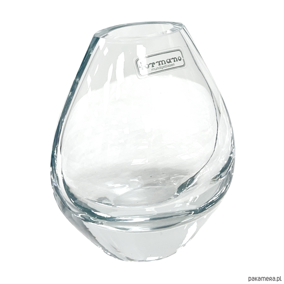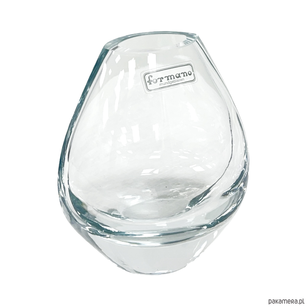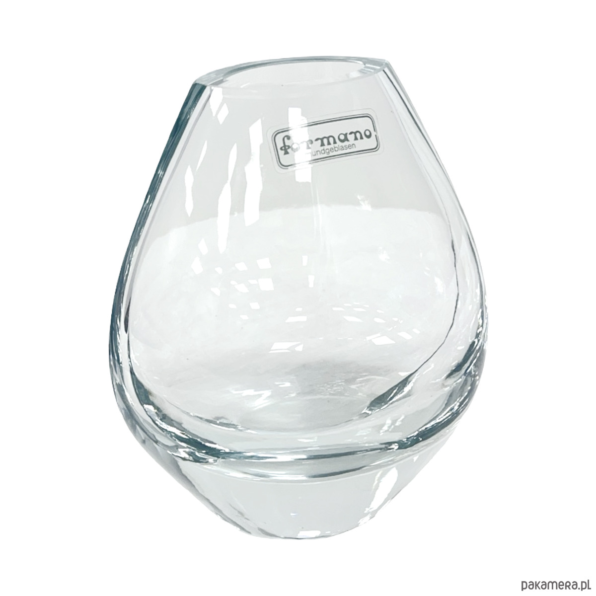 Wygląd: Wazon o opływowej, asymetrycznej formie przypominającej kroplę lub kamyk oszlifowany przez wodę. Kształt jest nieregularny, z zaokrąglonymi, miękkimi liniami, które sprawiają, że każdy egzemplarz jest unikalny — efekt ręcznego dmuchania. Górna krawędź wlotu jest delikatnie falista, dolna część zakończona masywną, zaokrągloną podstawą zapewniającą stabilność. Całość emanuje prostotą w duchu współczesnego wzornictwa. Na korpusie zachowana oryginalna naklejka producenta "for-mano mundgeblasen", potwierdzająca autentyczność i ręczne wykonanie.