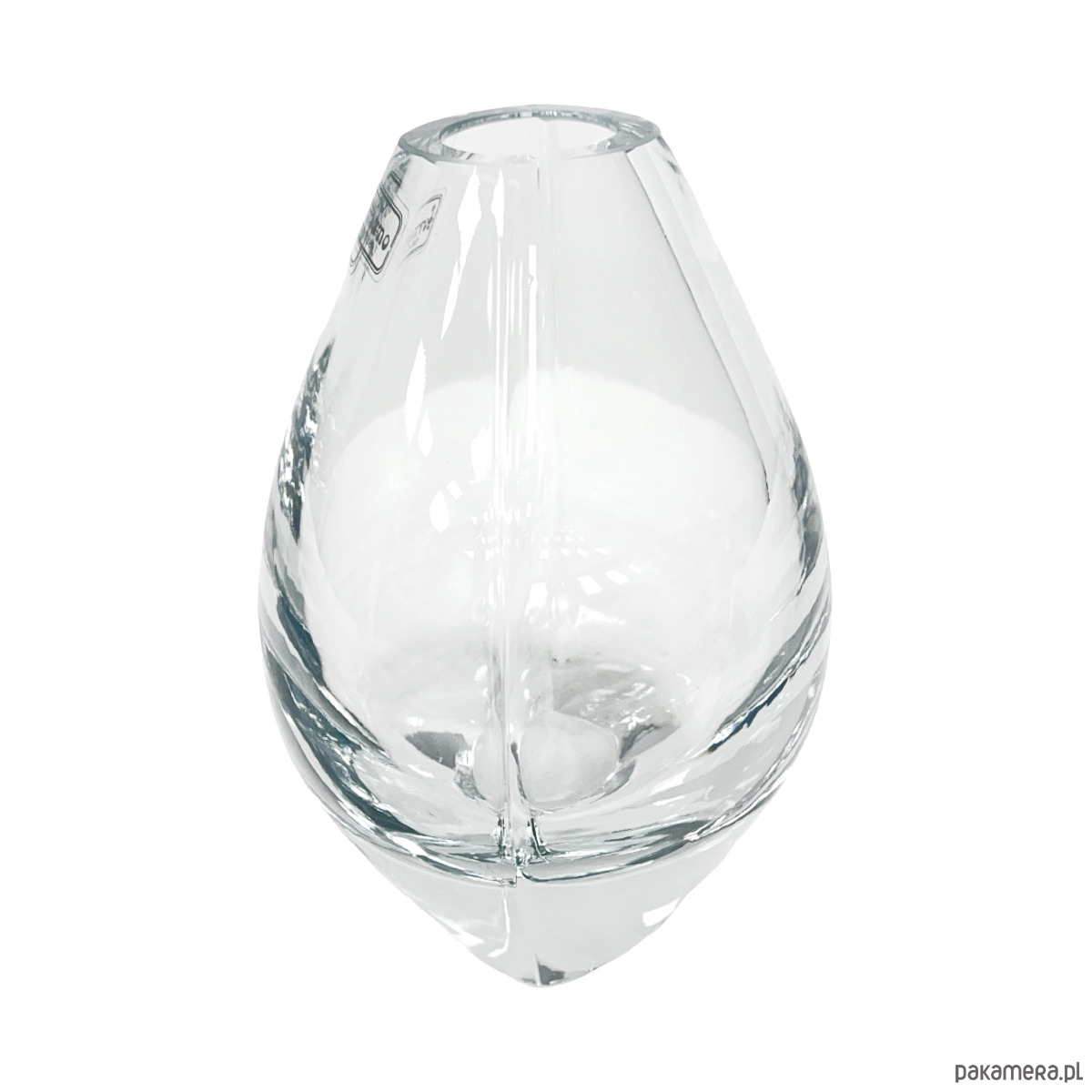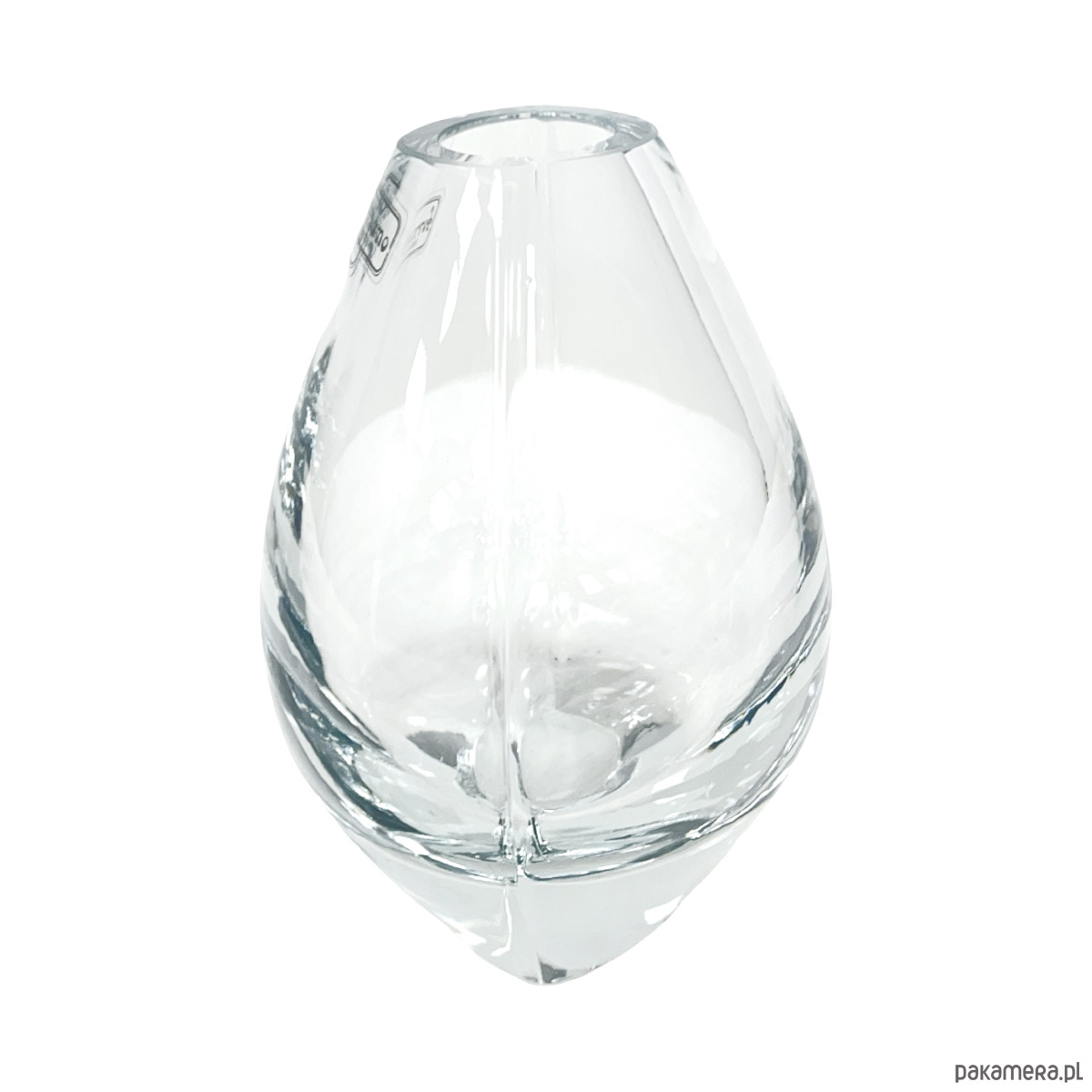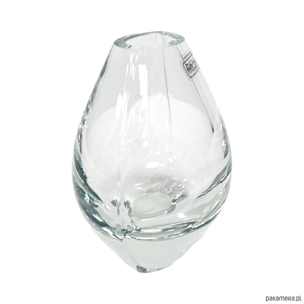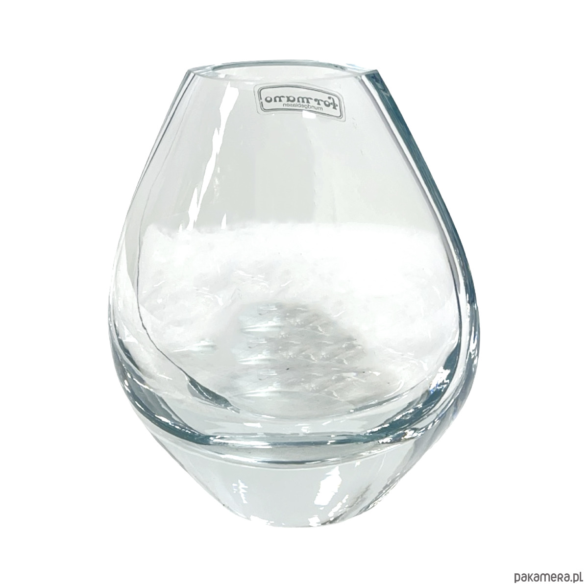 Wygląd: Wazon o opływowej, asymetrycznej formie przypominającej kroplę lub kamyk oszlifowany przez wodę. Kształt jest nieregularny, z zaokrąglonymi, miękkimi liniami, które sprawiają, że każdy egzemplarz jest unikalny — efekt ręcznego dmuchania. Górna krawędź wlotu jest delikatnie falista, dolna część zakończona masywną, zaokrągloną podstawą zapewniającą stabilność. Całość emanuje prostotą w duchu współczesnego wzornictwa. Na korpusie zachowana oryginalna naklejka producenta "for-mano mundgeblasen", potwierdzająca autentyczność i ręczne wykonanie.