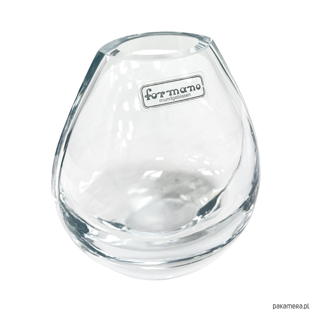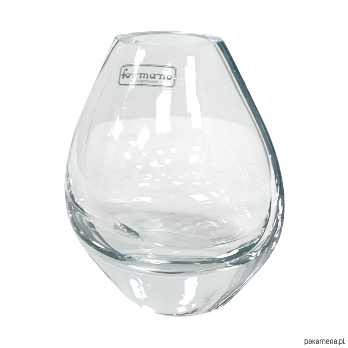 Elegancki, minimalistyczny wazon szklany marki Formano z oryginalną naklejką "for-mano mundgeblasen" (dmuchany ustnie). Formano to renomowana niemiecka marka specjalizująca się w szkle dekoracyjnym i akcesoriach wnętrzarskich. Przedmiot został wykonany w technice ręcznego dmuchania szkła, co nadaje mu niepowtarzalny, organiczny charakter.
