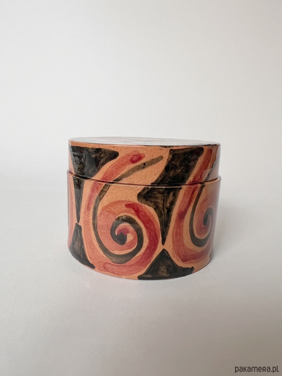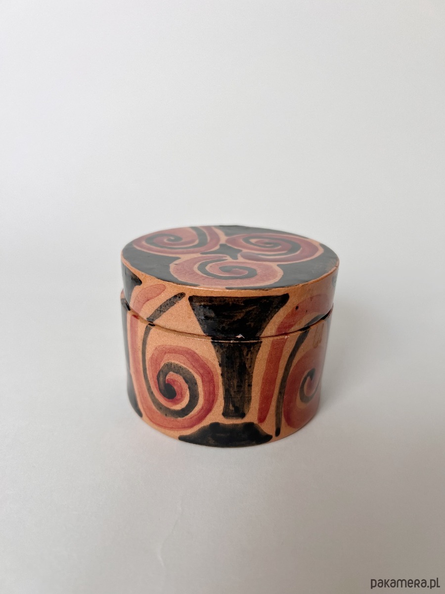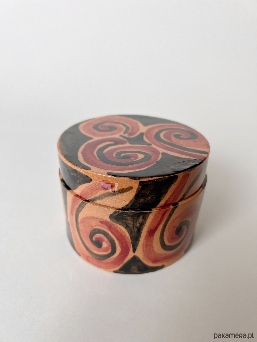 Szkliwiona, ręcznie malowana szkatułka ze spiralnymi wzorami.