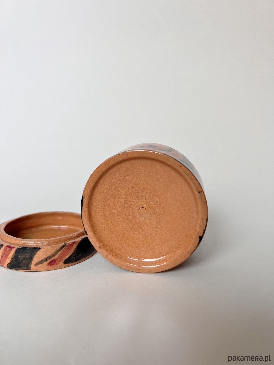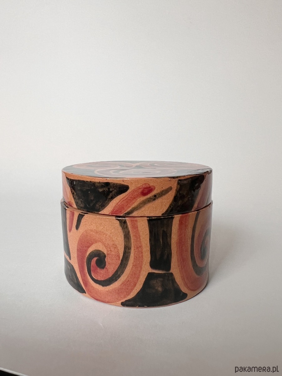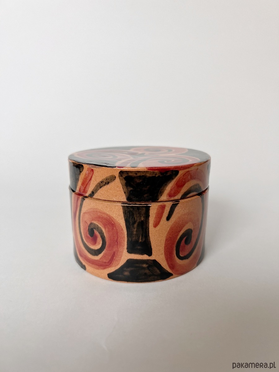 Szkliwiona, ręcznie malowana szkatułka ze spiralnymi wzorami.