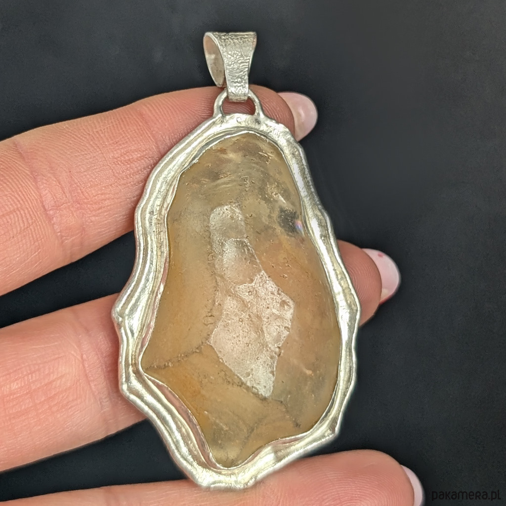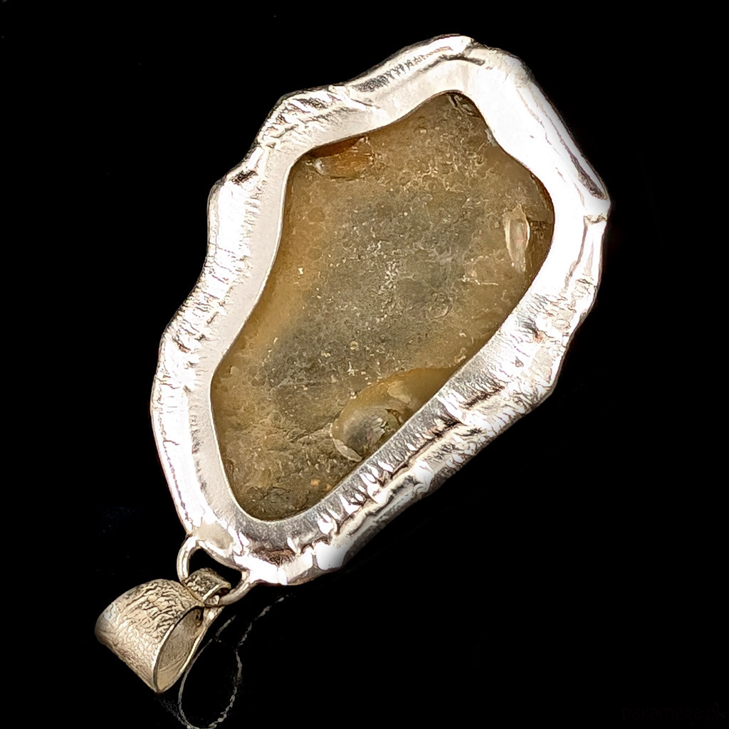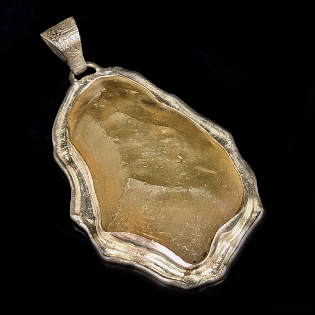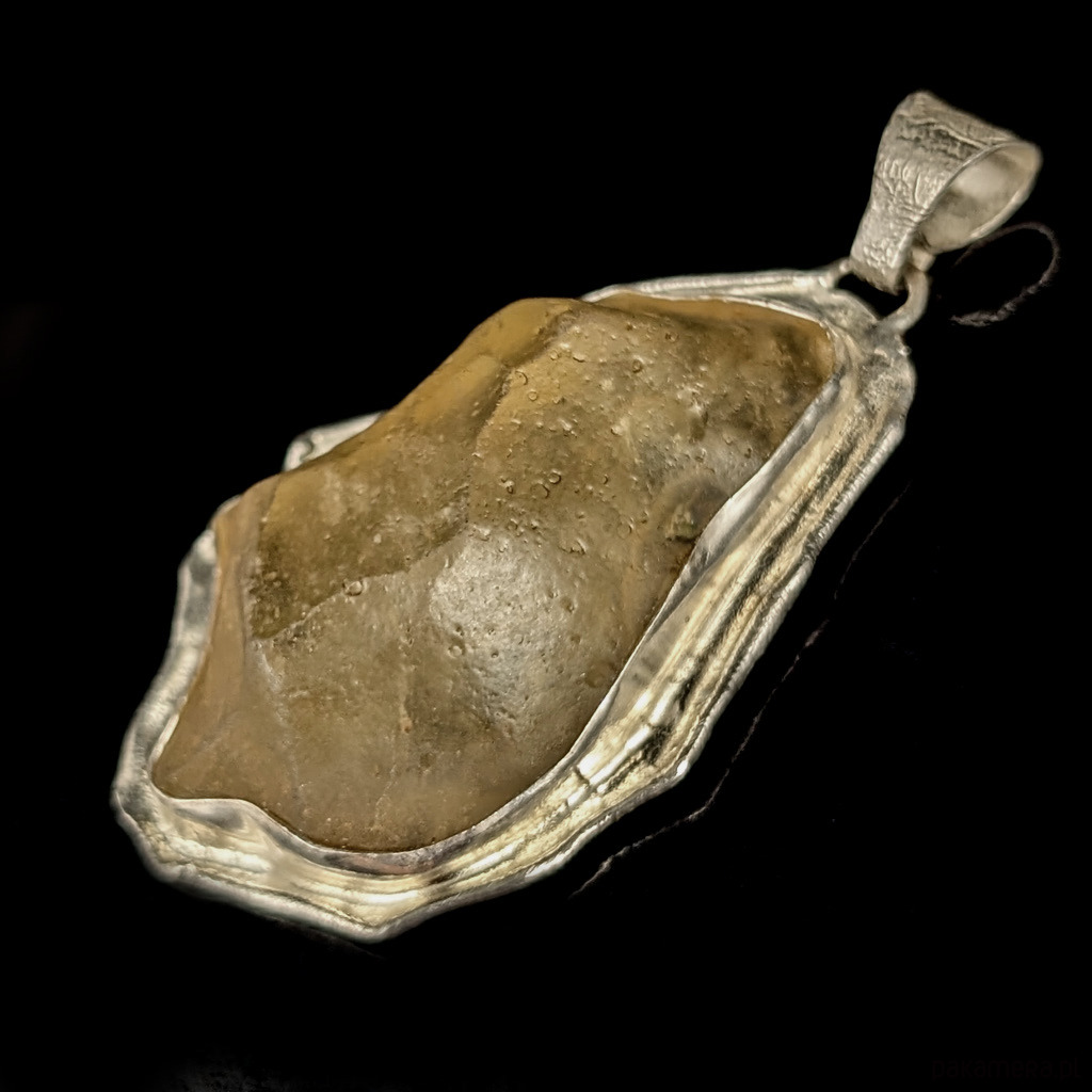 Bardzo okazały wisior, którego główną ozdobą jest piękny, surowy okaz unikalnego szkła libijskiego. Oprawa srebra próby 925. Waga wisiora 25 gramów. Wymiary całej oprawy 54 x 37mm. Długość z krawatką 67 mm. Wisior zapakowany zostanie w ozdobne pudełeczko.