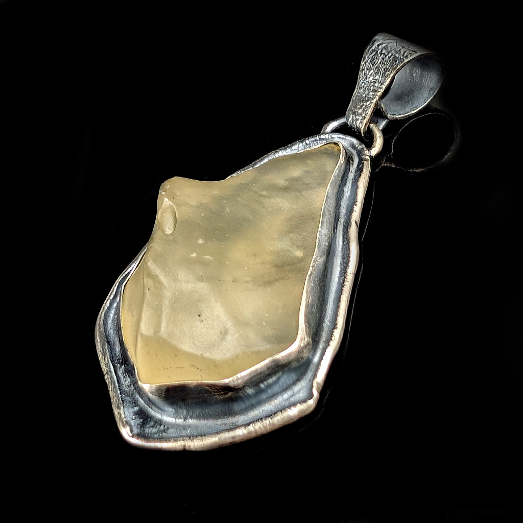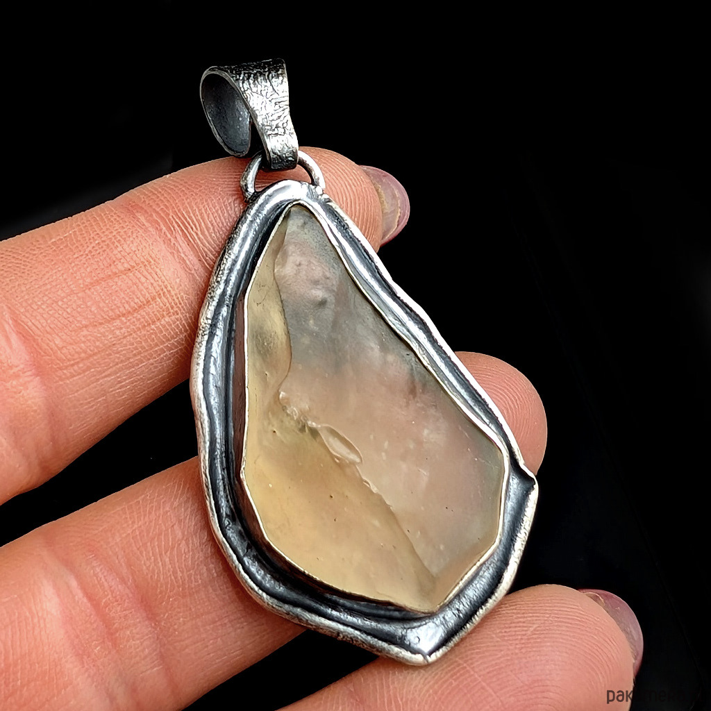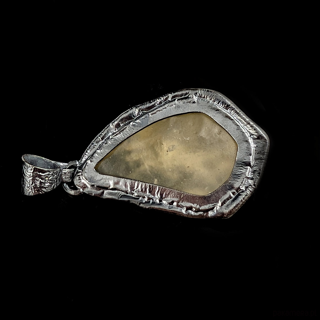 Okazały wisior, którego główną ozdobą jest piękny, surowy okaz unikalnego szkła libijskiego. Oprawa srebra próby 925. Waga wisiora 12,6 grama. Wymiary całej oprawy 42 x 27 mm. Długość z krawatką 55 mm. Wisior zapakowany zostanie w ozdobne pudełeczko.