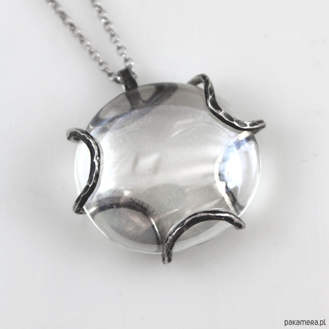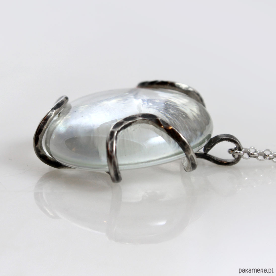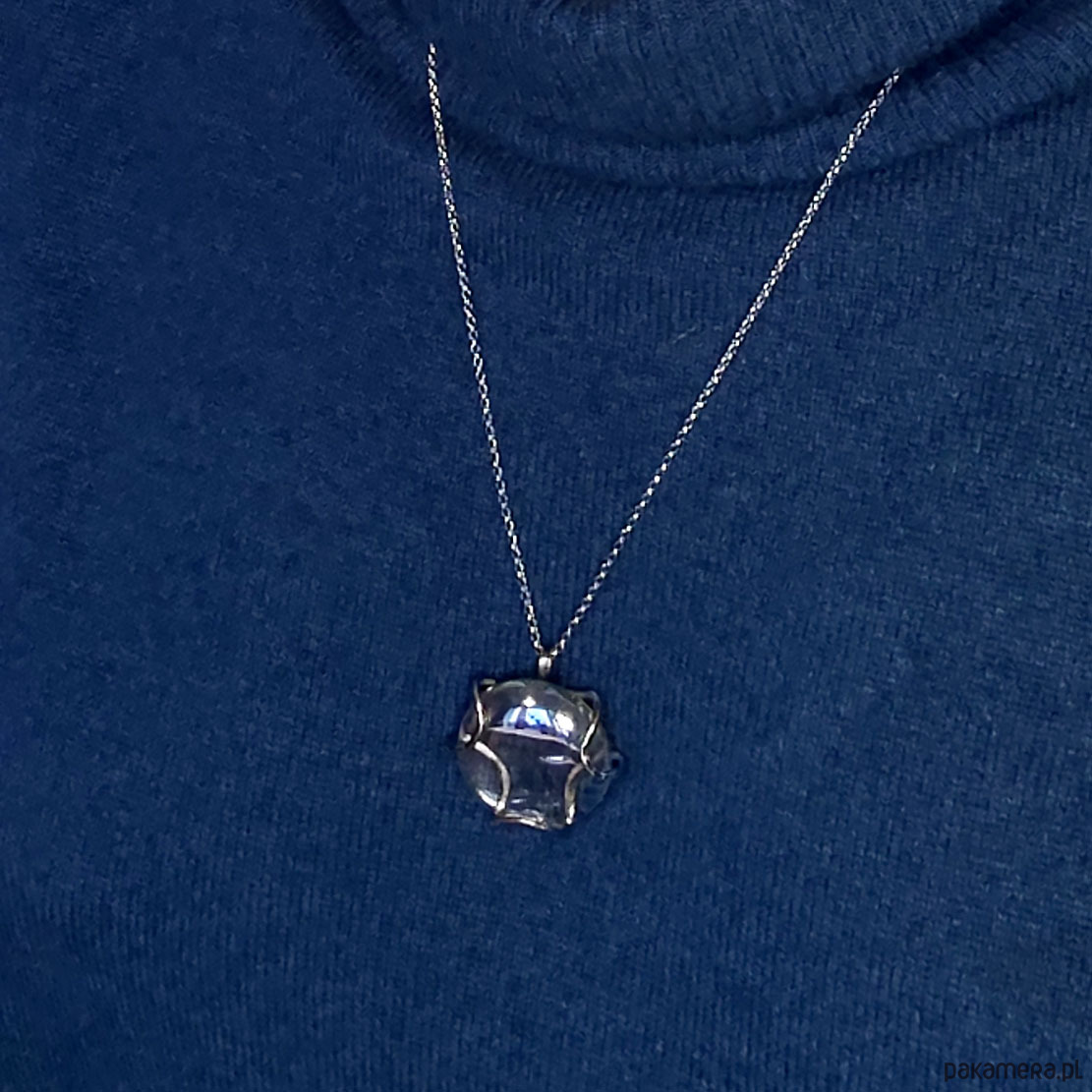 Duży wisior ze szkła witrażowego w srebrnej oprawie.