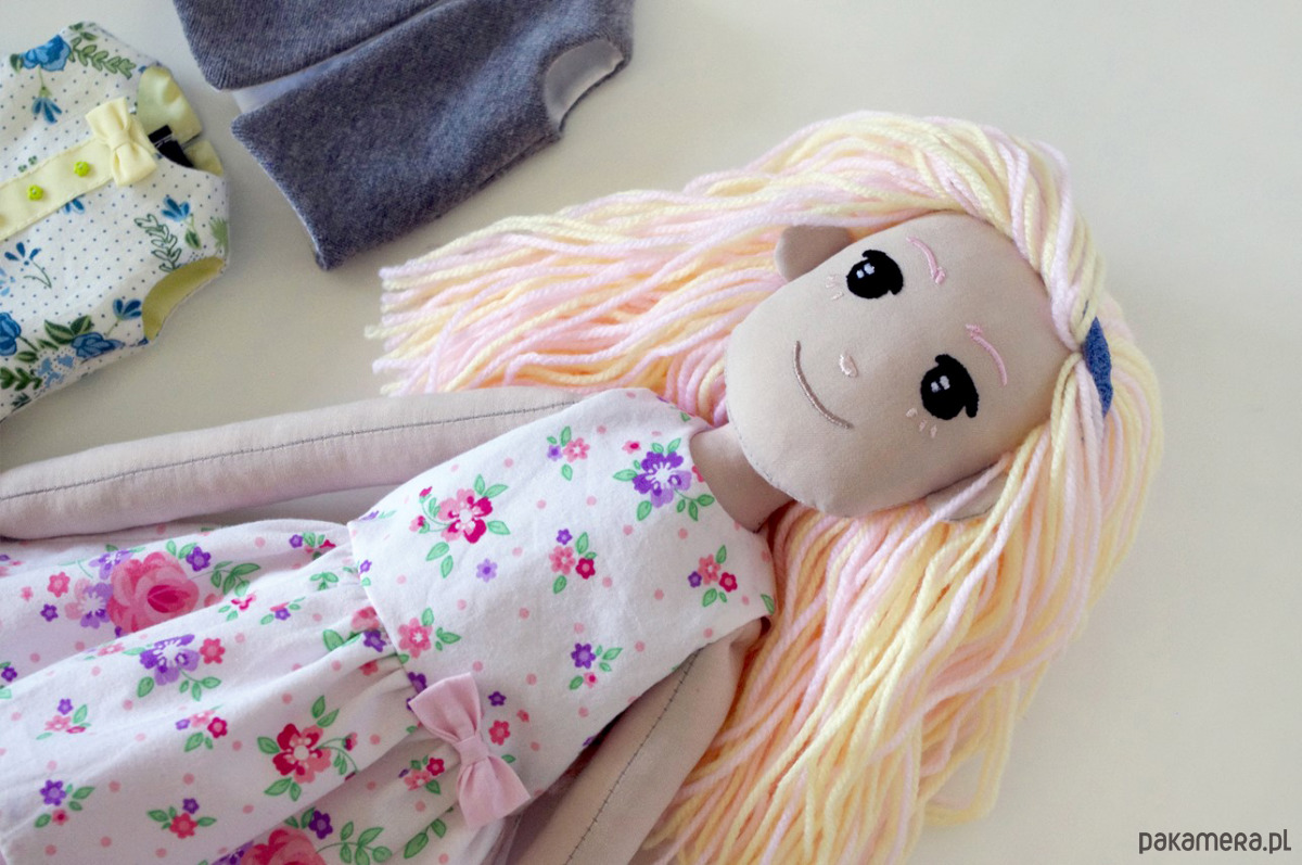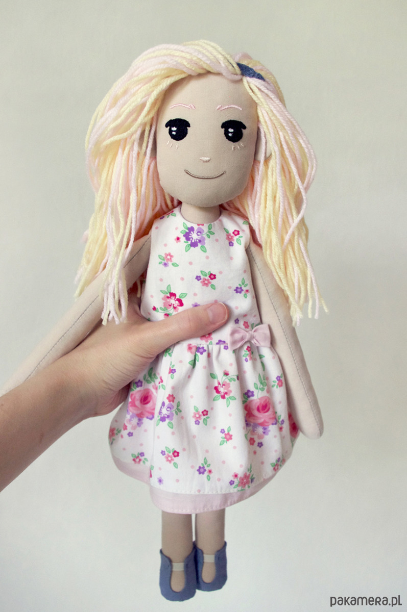 Ta jedyna w swoim rodzaju lalka jest szyta ręcznie, z haftowaną twarzyczką i włosami wykonanymi z akrylowej włóczki. Rączki są połączone sznurkiem, dzięki czemu można nimi ruszać. Wypchana kulką silikonową.