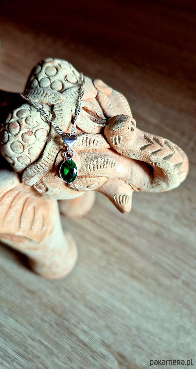 Wisiorek z kolekcji baśniowej wykonany ze srebra 925 najwyższej jakości bez niklu. Kamień, to piękny w barwie Szmaragd z Kolumbii o szlifie diamentowym wielkości około 8 mm x 6 mm. Wisiorek na ozdobnej krawatce serduszko 9 mm ze srebra 925. Łańcuszek 45 cm ze srebra 925.