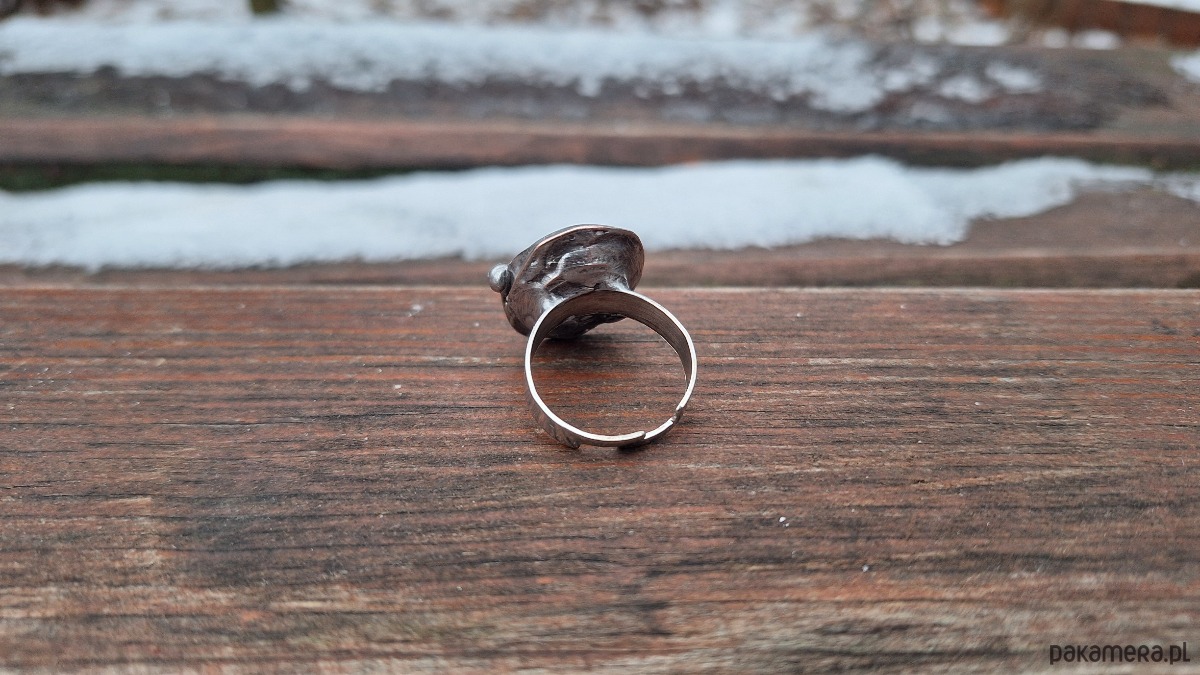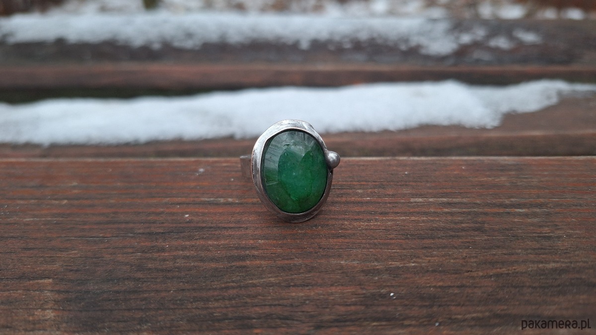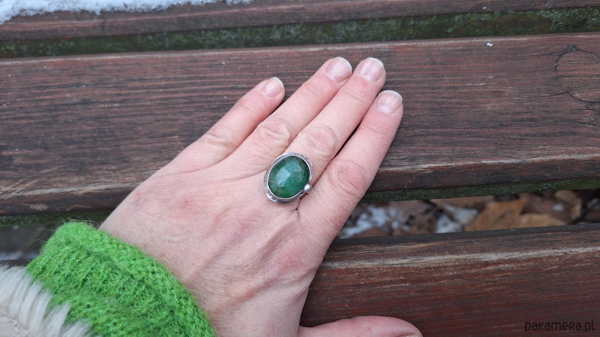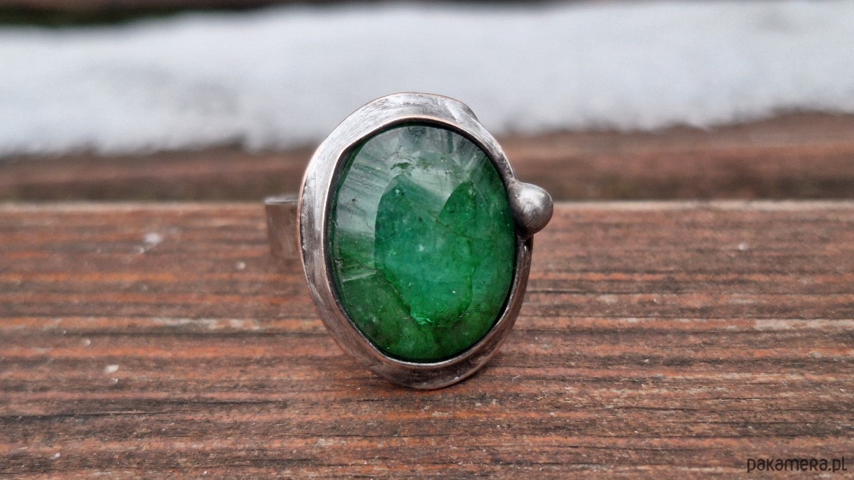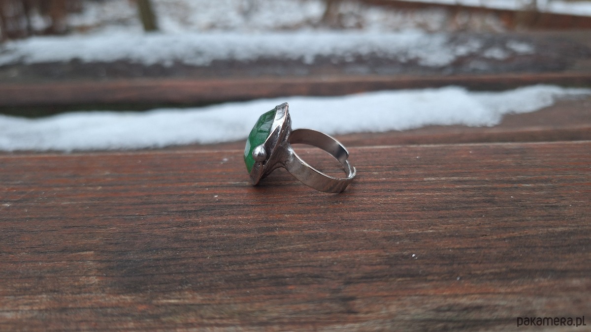 Pierścionek wykonany z miedzi, cyny i fasetowanego szmaragdu. Wymiary ok. 2 na 1.5 cm. Regulowany. Nie jest ciężki.