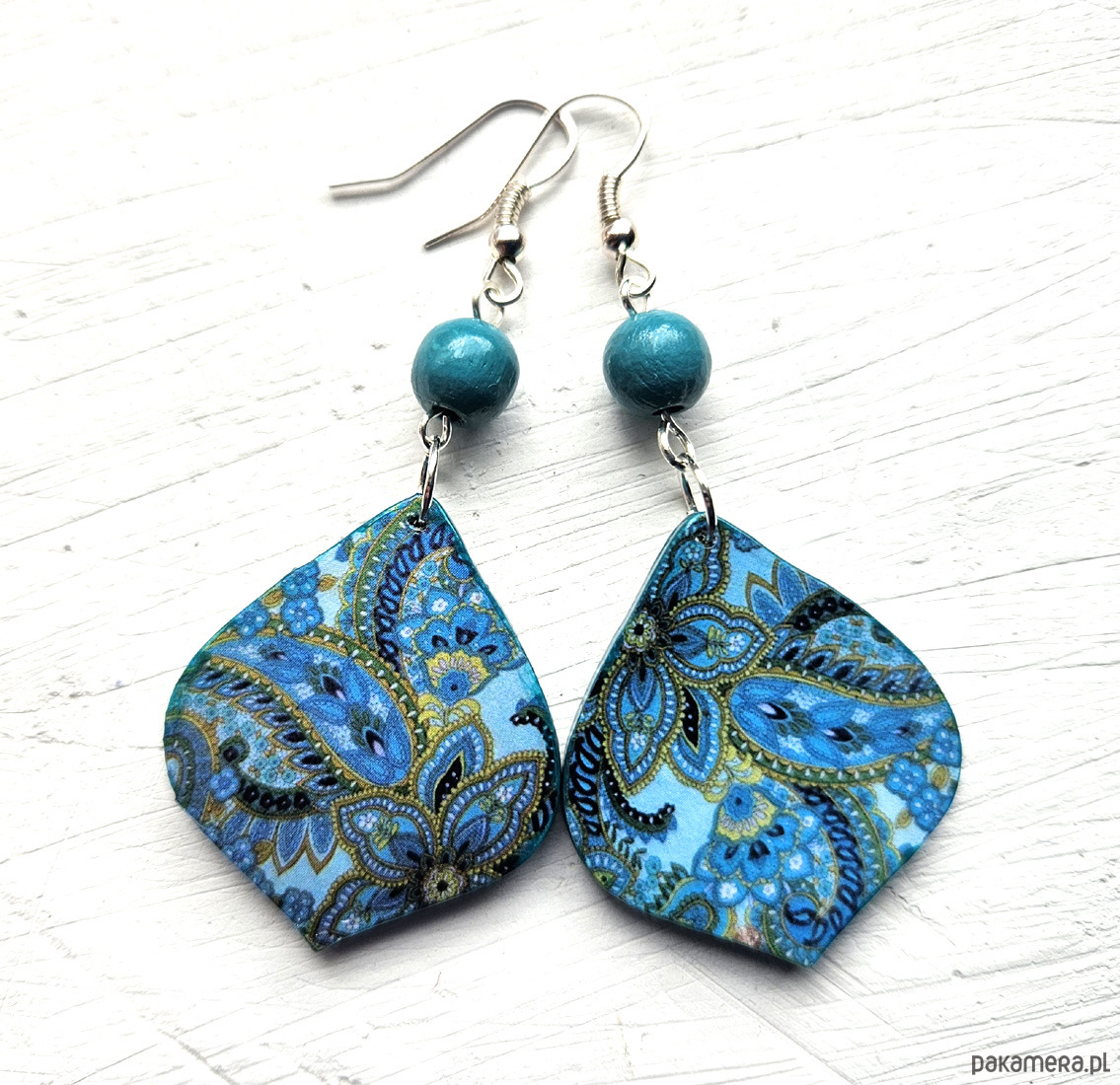 kolczyki drewniane, ozdobione metodą decoupage, dwustronne, starannie wykończone farbami akrylowymi i zabezpieczone wielokrotnie lakierem, koraliki drewniane, bigle posrebrzane, długość kolczyków bez bigli: 5,5 cm, szerokość: 3 cm, bardzo lekkie