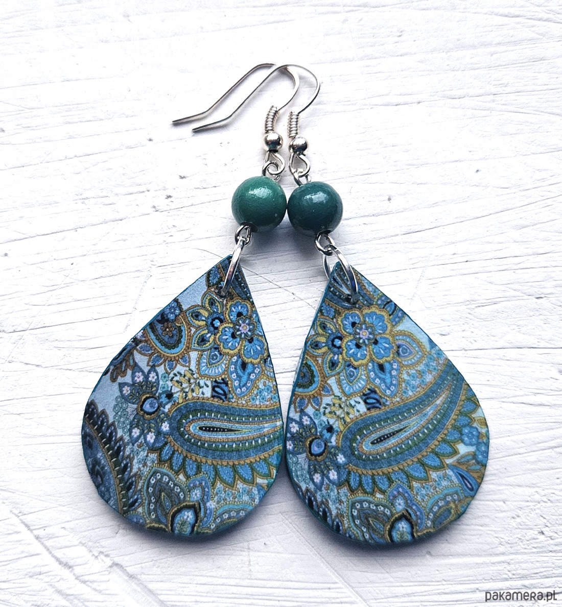 kolczyki drewniane, ozdobione metodą decoupage, dwustronne, starannie wykończone farbami akrylowymi i zabezpieczone wielokrotnie lakierem, koraliki drewniane, bigle posrebrzane, długość kolczyków bez bigli: 5,5 cm, szerokość: 3 cm, bardzo lekkie