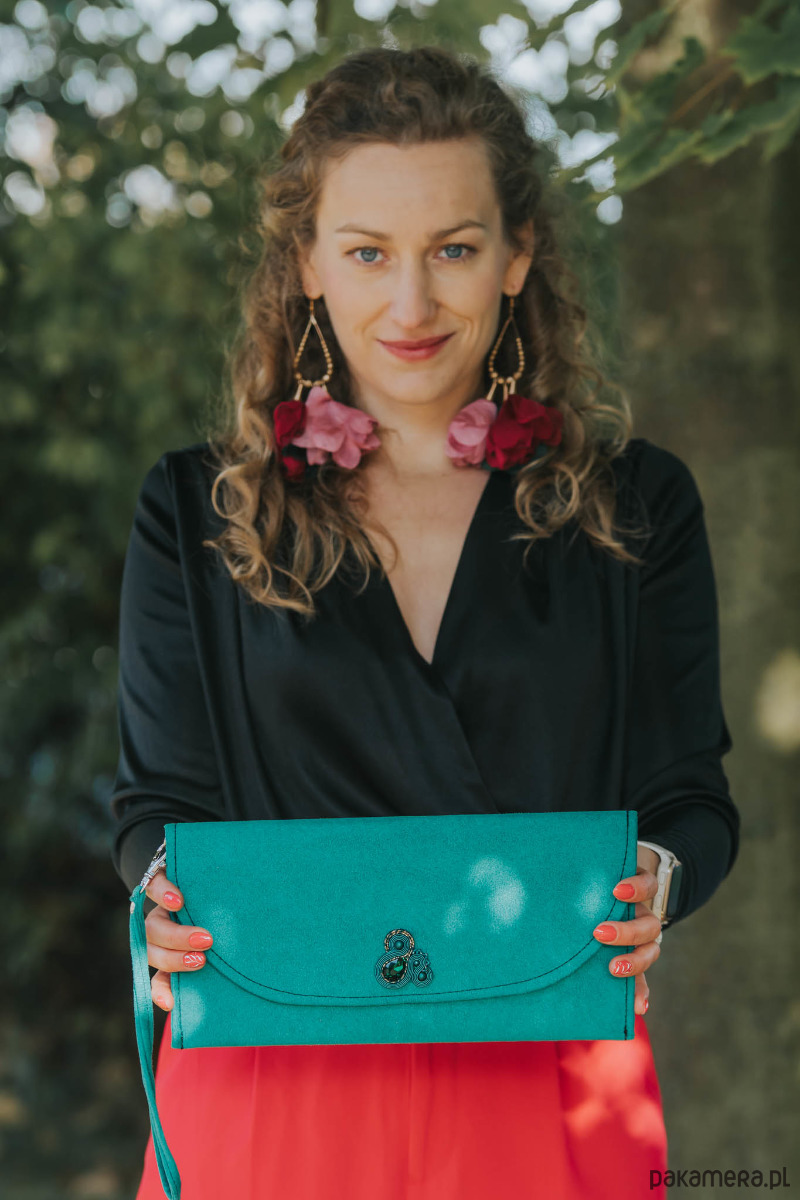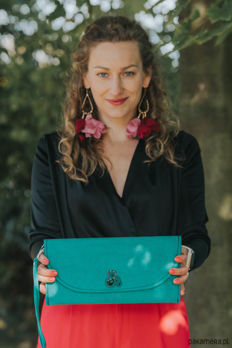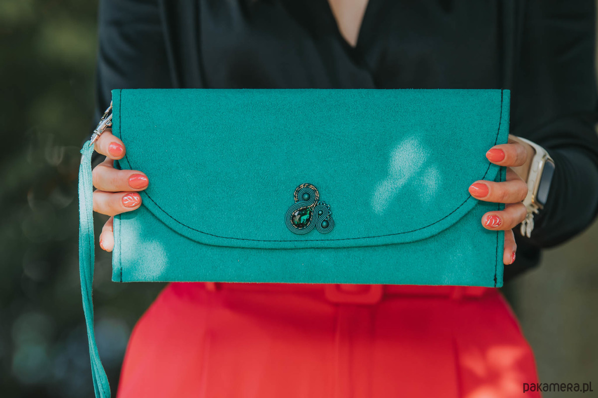 Torebka szyta jest w małej polskiej szwalni, zaś ja w mojej pracowni szyję specjalne aplikacje soutache zdobiące każdy egzemplarz. Na zdjęciu chochlik spłatał figla z promieniami słońca - torebka oczywiście jest w jednym głębokim szmaragdowym kolorze, plamy światła - to słońce :)