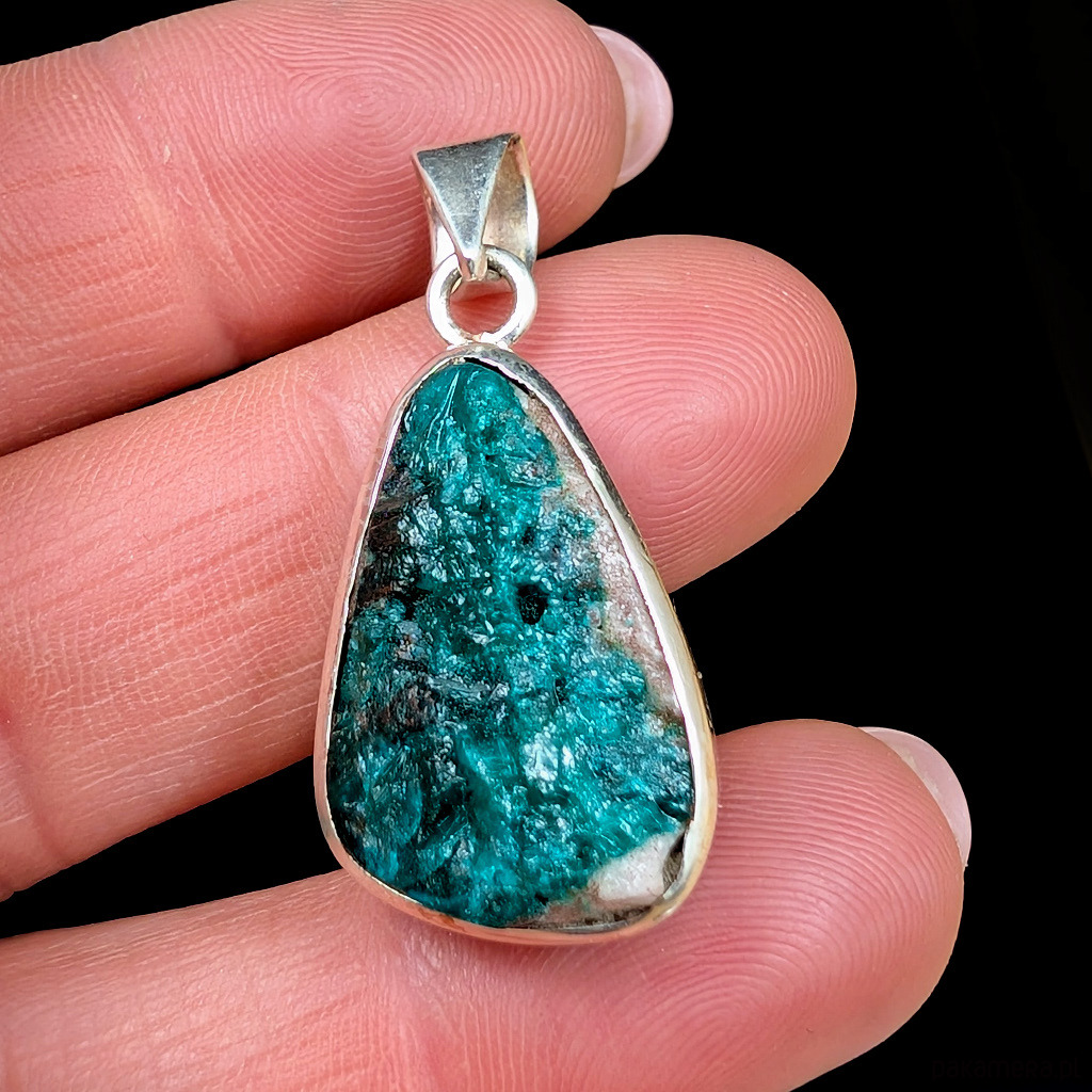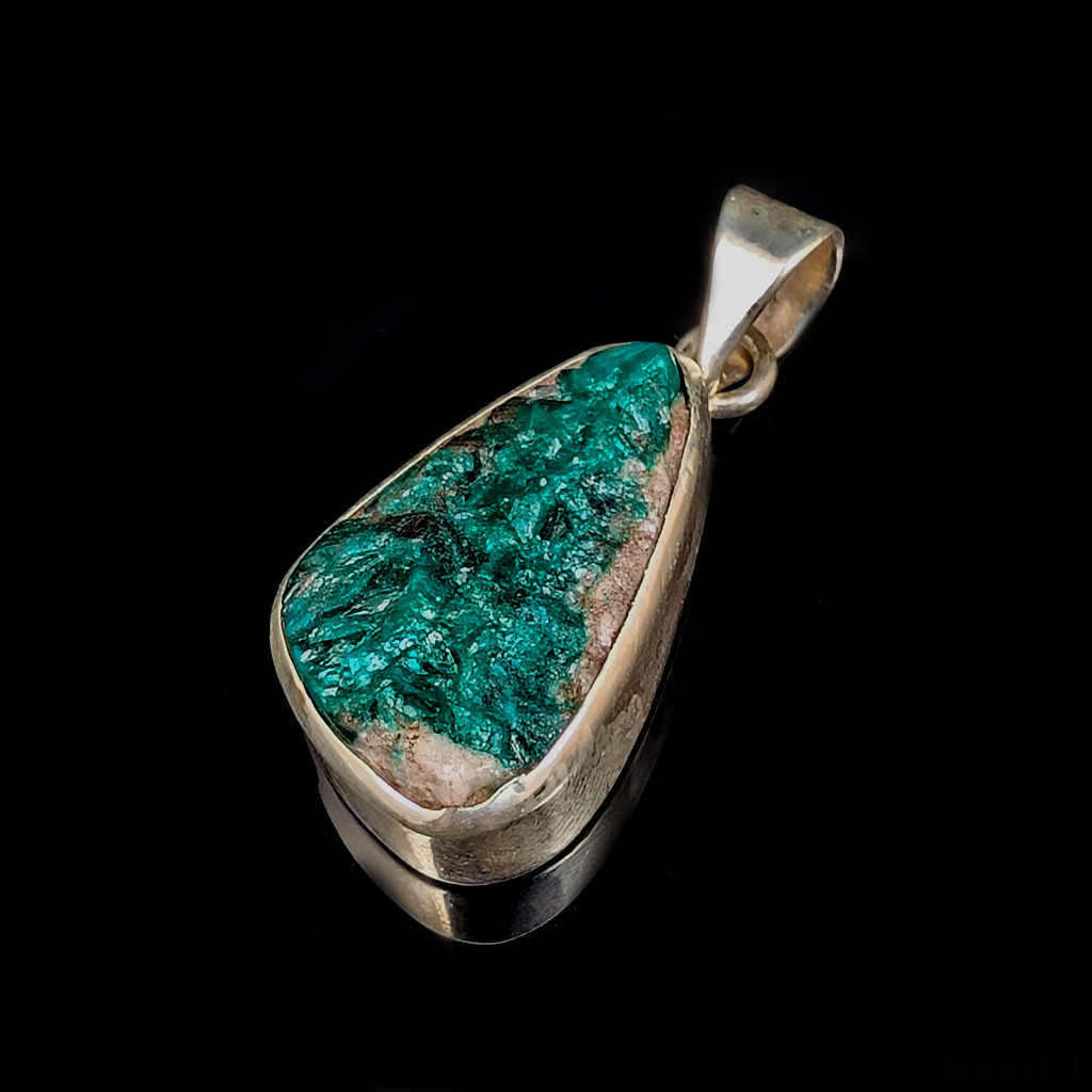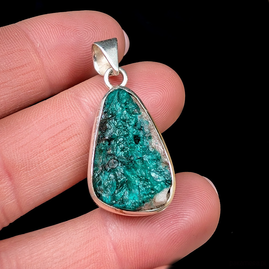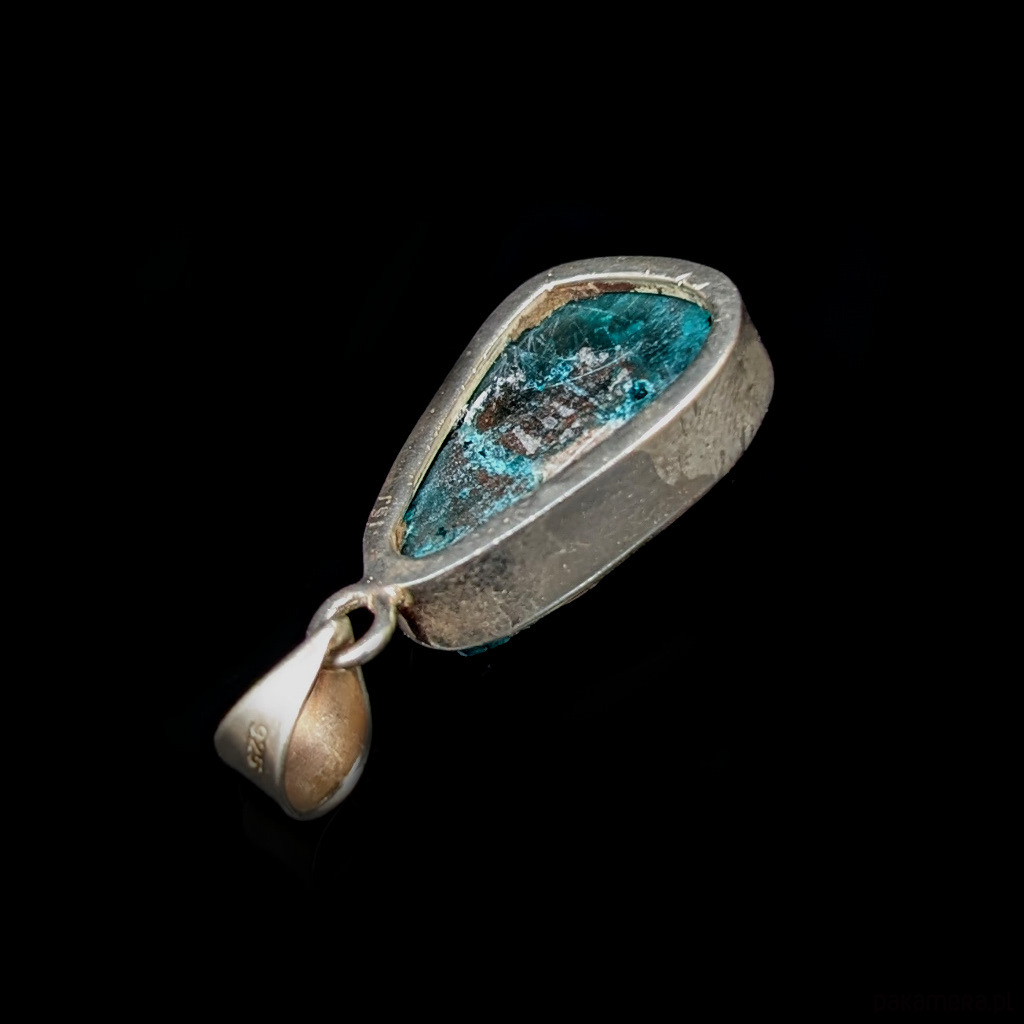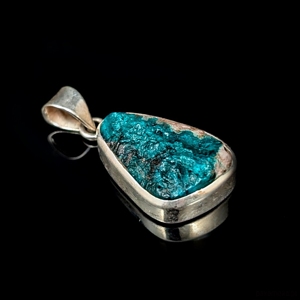 Wisiorek z rzadkim i efektownym dioptazem oprawionym w srebro próby 925.Wisior waży 8 g.