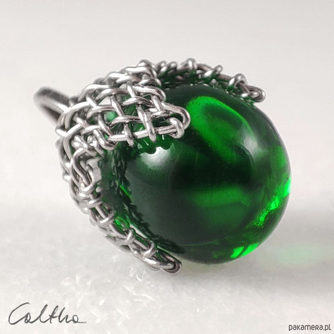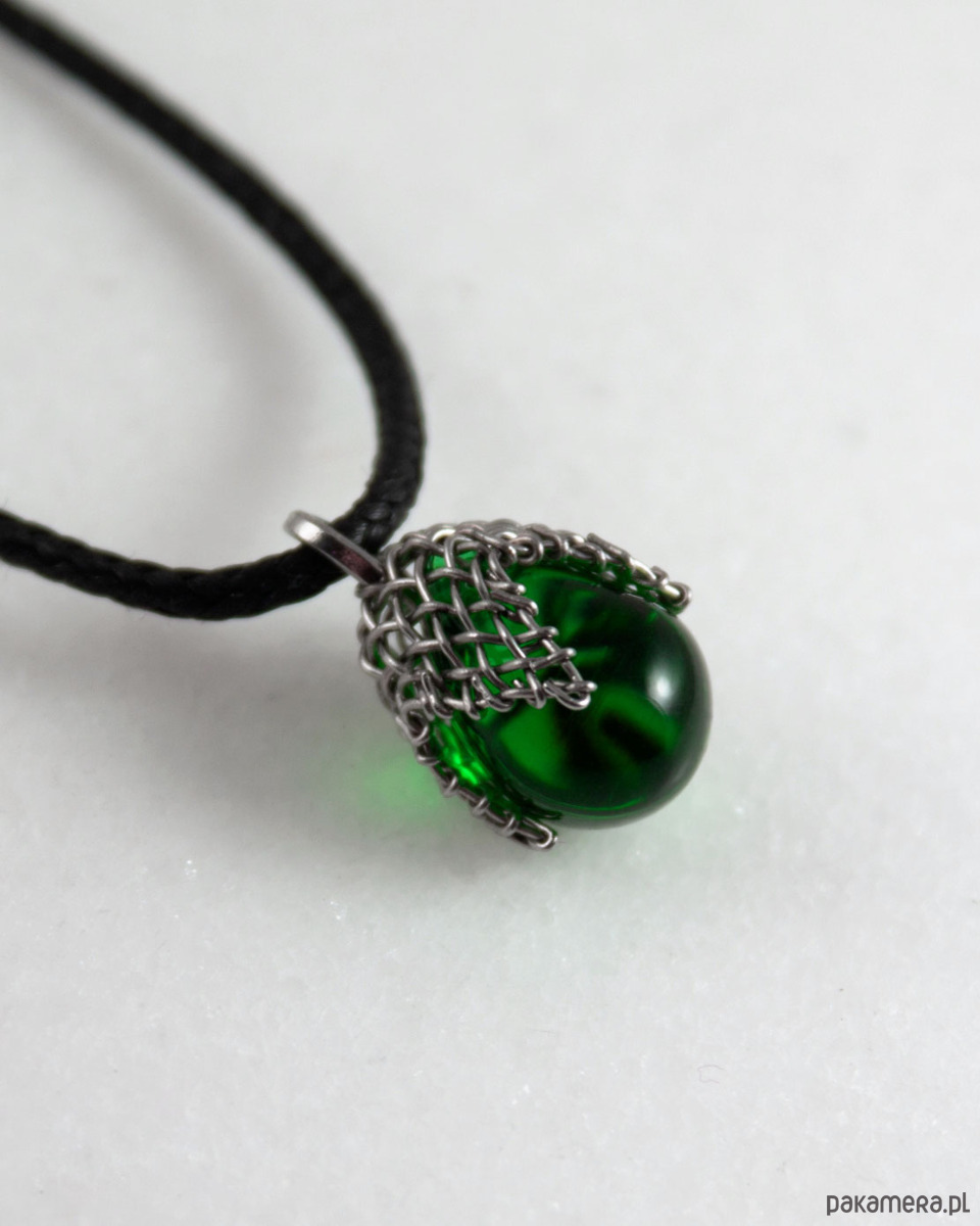Szklana kropla oprawiona w ręcznie formowaną metalową siateczkę. Całkowita wielkość wisiorka to ok. 2 cm. W komplecie bawełniany sznurek do zawieszenia.