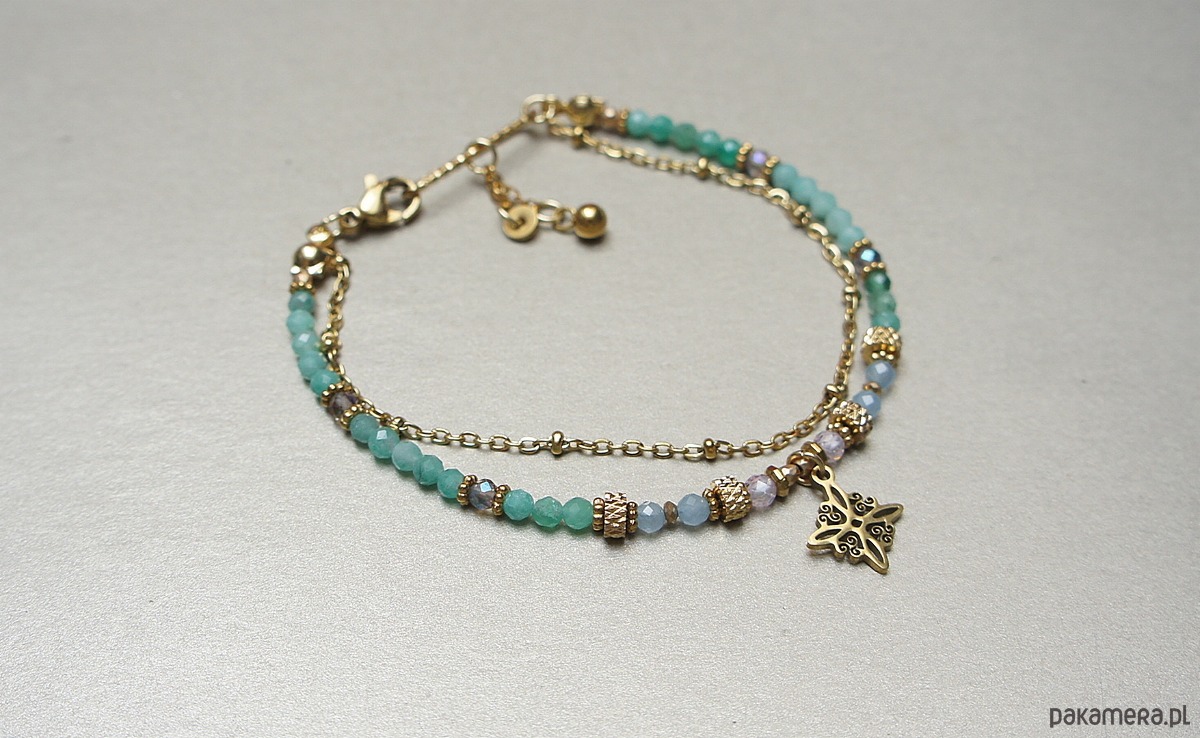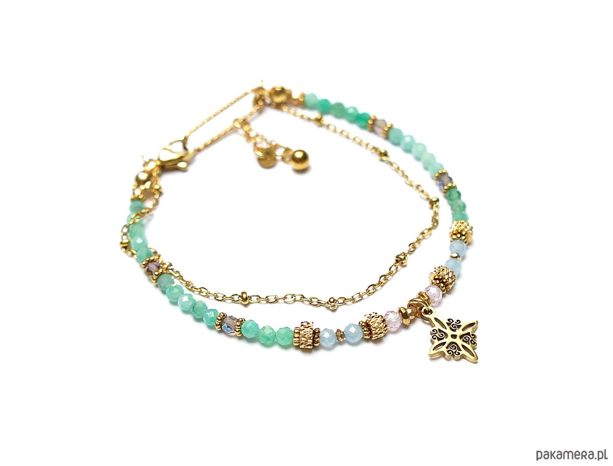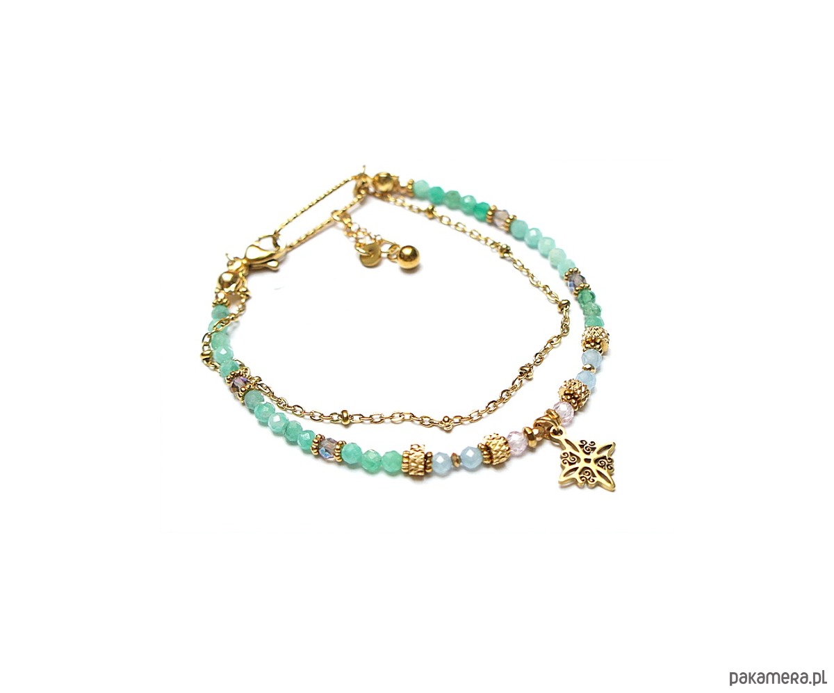 Delikatna bransoletka wykonana w całości ze stali szlachetnej pozłacanej, szlachetnych kamieni - szmaragdy fasetowane [2,5mm], kwarc dymny platerowany [2,5mm], akwamaryn fasetowany [2,5mm], cyrkonie fasetowane [2,5mm], hematyt fasetowany platerowany [2mm], przekładek z hematytu [1mm]. Całkowita długość bransoletki 18,5cm. Biżuteria ozdobnie zapakowana.