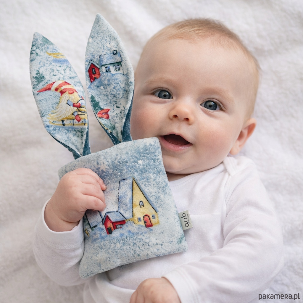 Uszyte z najwyższej jakości, bezpiecznych tkanin: 100 % bawełny i pikowanego velvetu, w środku szeleszcząca folia stymulująca sensorycznie .Długie uszy i kolory z pewnością pobudzą zmysły Maluszka.