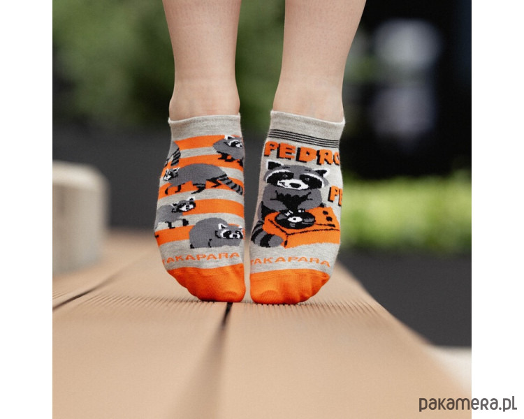 Szukasz dodatku, który rozkręci Twoją stylówkę? Stopki nie do pary Szop Pedro to uderzeniowa dawka humoru i koloru, inspirowana najzabawniejszymi zakamarkami internetu. Jedna ze stopek – szara, z pomarańczowymi detalami – pokazuje szopa, który jak rasowy DJ kręci się na gramofonie w rytm hitu Pedro. Druga – pełna ruchu i energii – ukazuje bandę szopów, które biegają po szaro-pomarańczowym tle jak z kreskówki. Pomysł na wzór zrodził się z kultowego filmiku, który z dnia na dzień podbił TikToka i Reddita, oraz z memów, które uczyniły szopy nowymi bohaterami internetu. Takapara połączyła tę zabawę z jakością – stawiając na trwałą dzianinę z bawełny, świetny krój i detaliczny nadruk. Te kolorowe luksusowe skarpetki w wersji stopkowej są idealne do trampek, sneakersów, a nawet do domowego lenistwa. Sprawdzą się jako prezent dla fana memów, muzyki, szopów – albo po prostu jako sposób na poprawienie sobie nastroju. Bo kto powiedział, że skarpetki muszą być nudne?