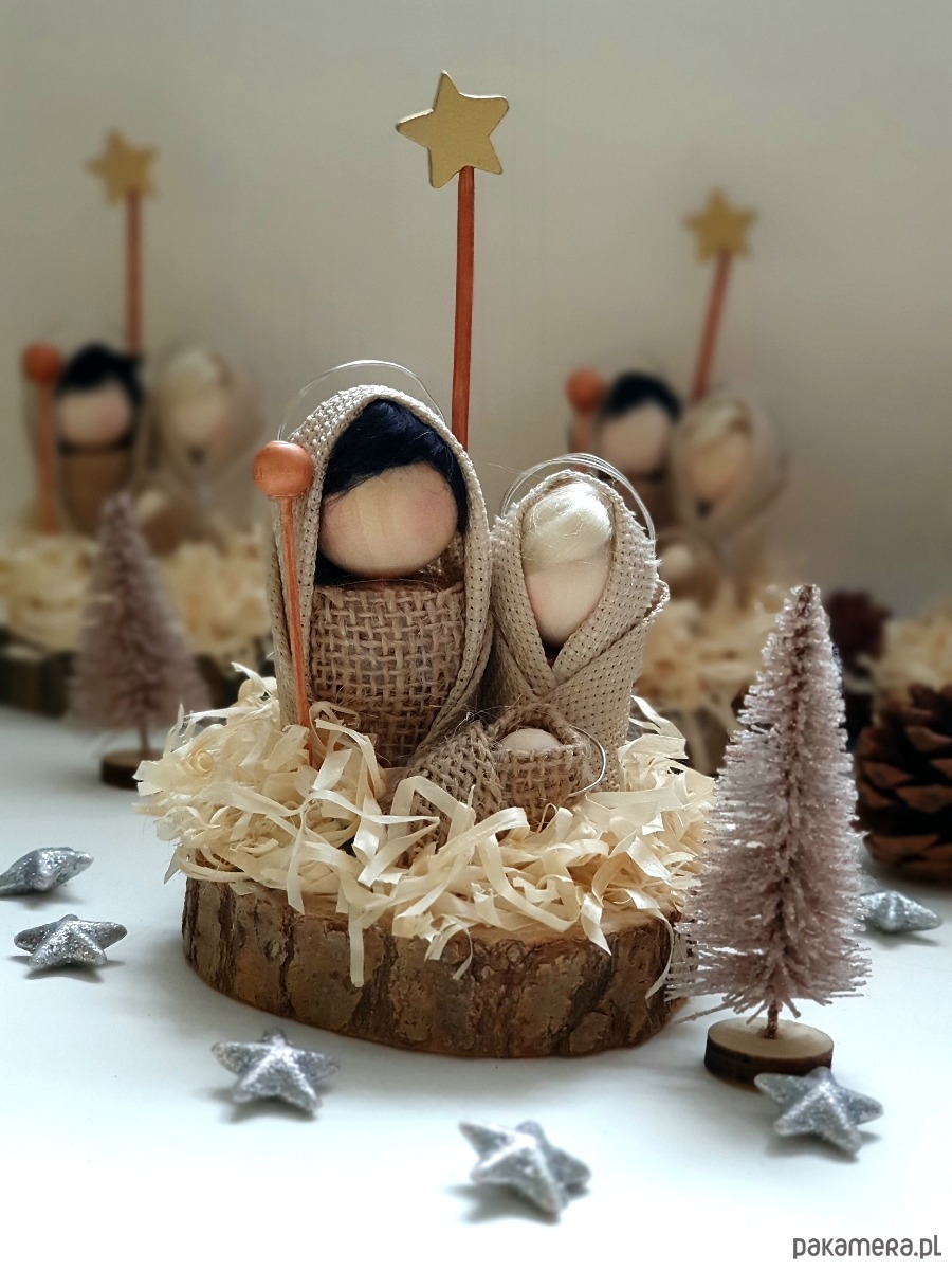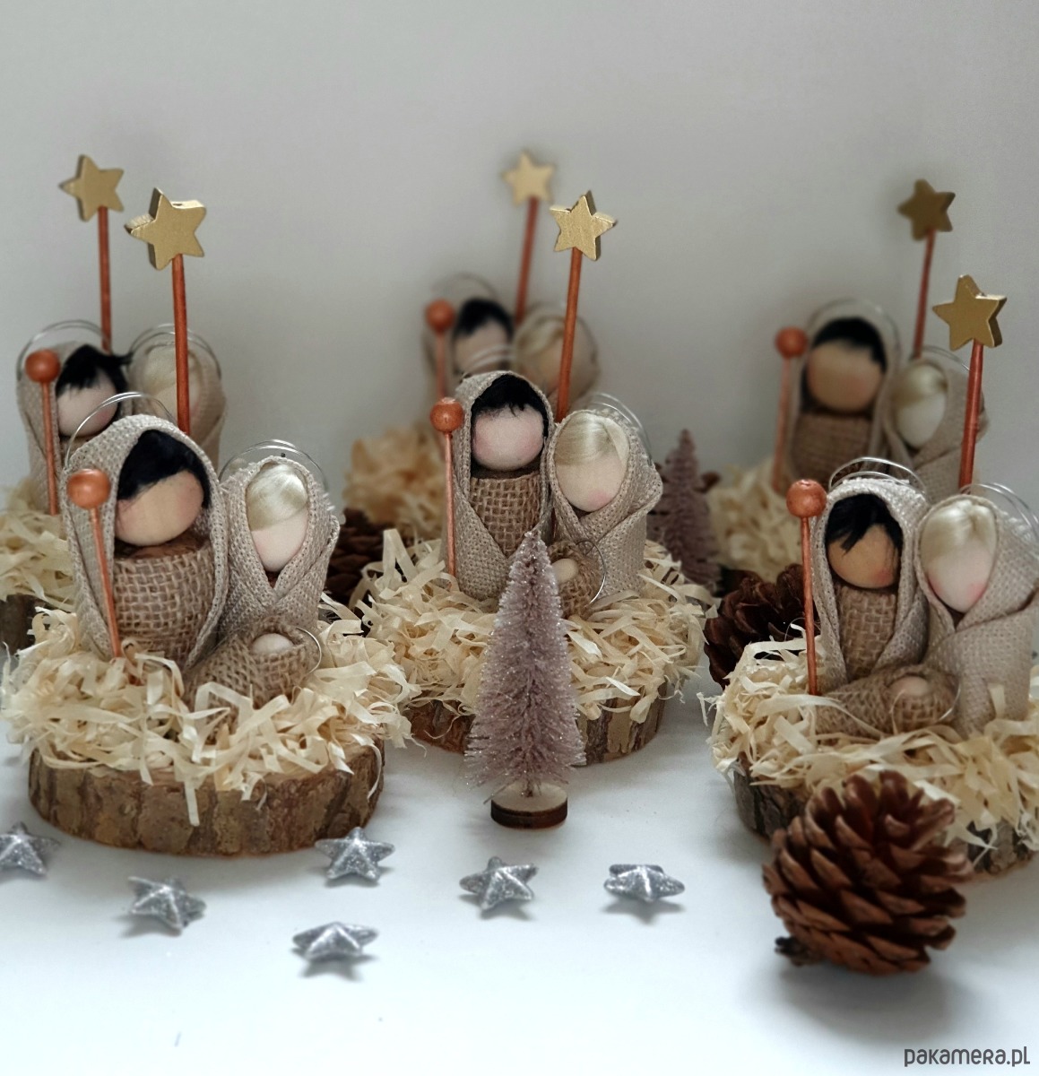 Szopka betlejemska na plastrze drewna, wykonana z naturalnych materiałów.