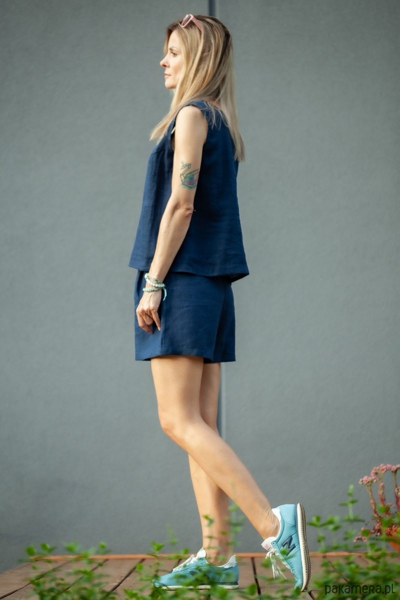 Spodnie wykonane są z tkaniny lnianej 100%. W pasie mają gumę, z przodu zakładki, z boku zamek.
