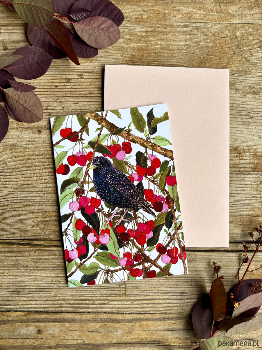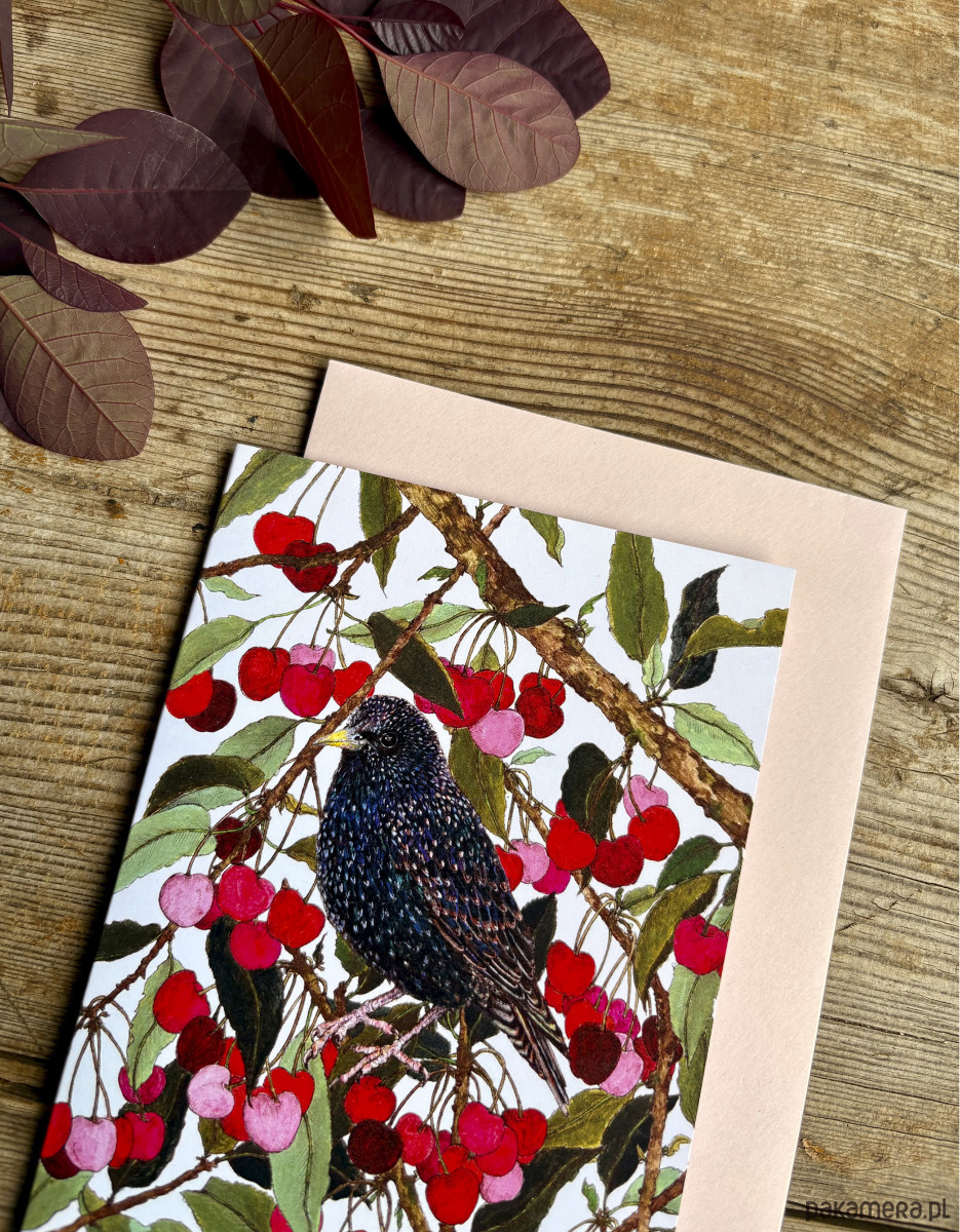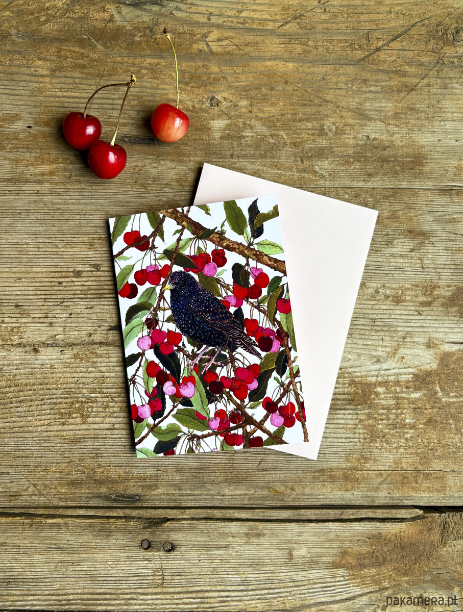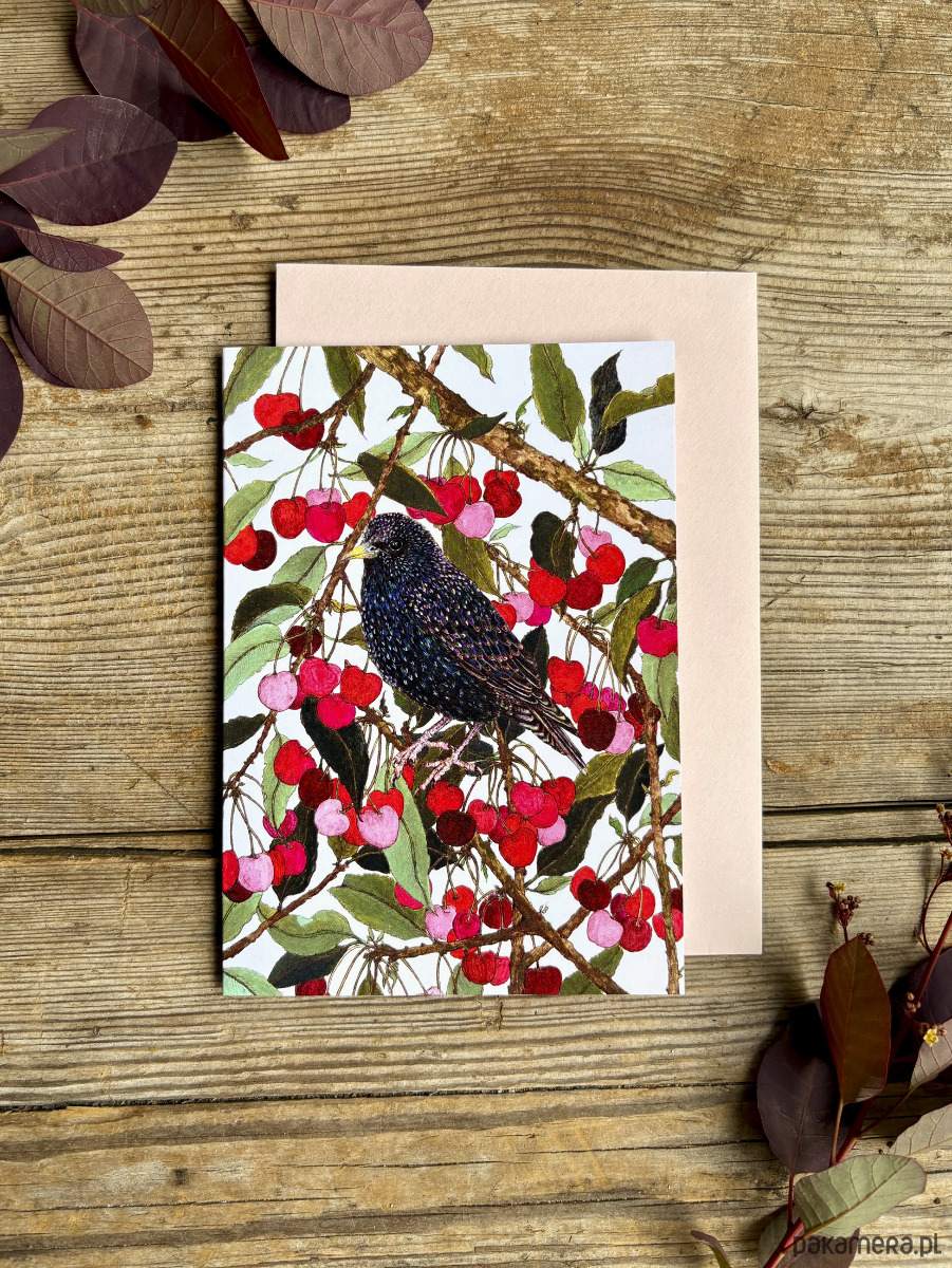 Szpak w czereśniach- Kartka- Grafika- Ilustracja- Ptaki