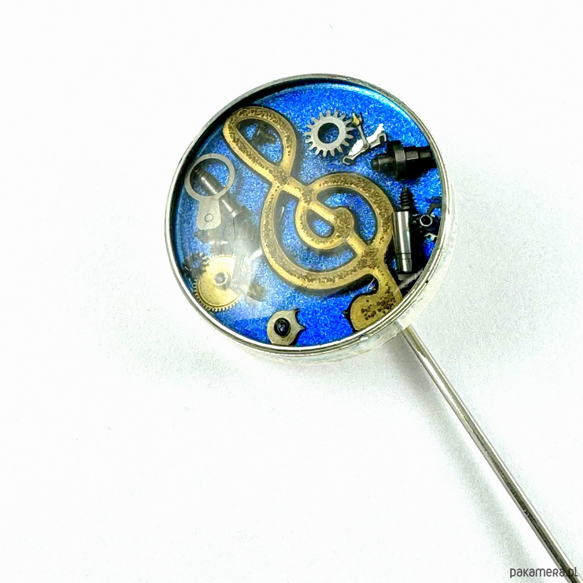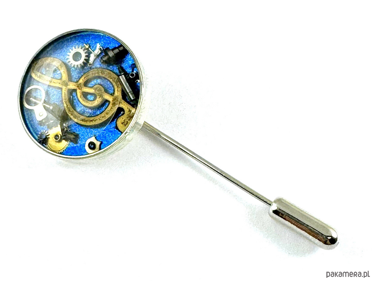 Garść danych technicznych:- Długość całego Pina: ok 5,5 cm- Rozmiar mechanizmu: Średnica ok: 2,5 cm- Baza posrebrzana.- Motyw nutki zatopiony na niebieskim tle, dla każdego fana muzyki.