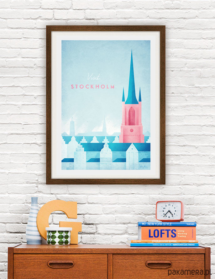Plakat w stylu vintage przedstawiający panoramę Sztokholmu z widniejącym na pierwszym planie Kościołem na Riddarholmen. W tle widnieje wieża ratusza miejskiego oraz sylwetki kamienic. Inspirowany plakatami podróżniczymi z lat 20-tych XX wieku.