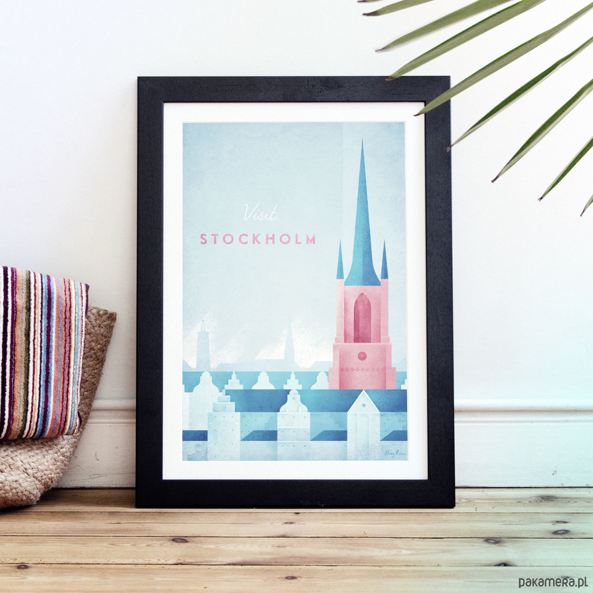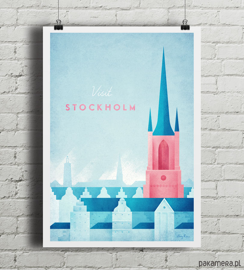Plakat w stylu vintage przedstawiający panoramę Sztokholmu z widniejącym na pierwszym planie Kościołem na Riddarholmen. W tle widnieje wieża ratusza miejskiego oraz sylwetki kamienic. Inspirowany plakatami podróżniczymi z lat 20-tych XX wieku.