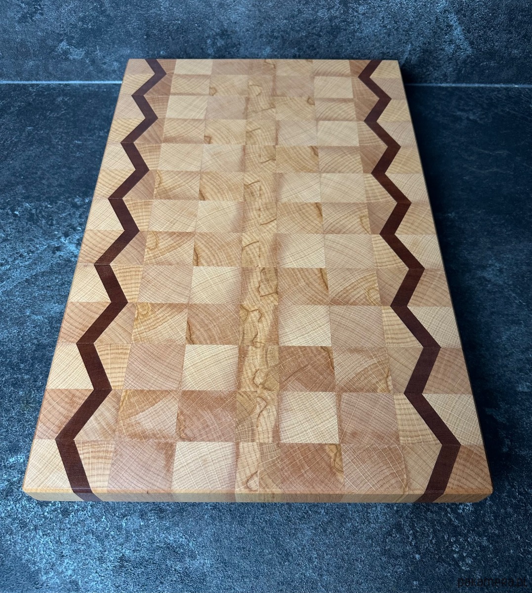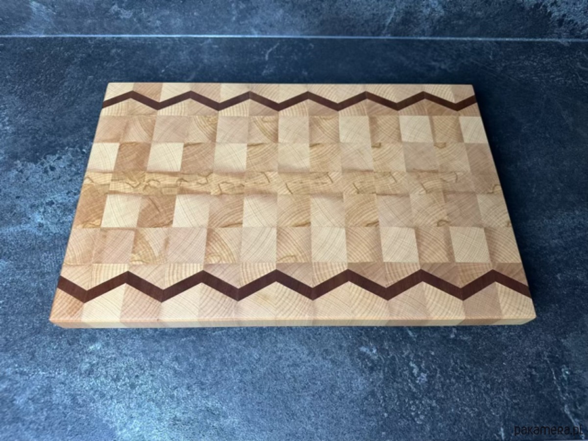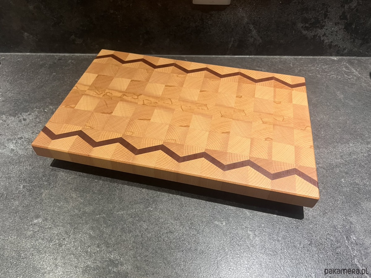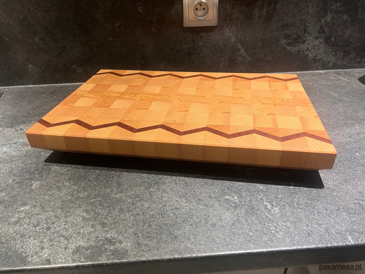 Ta deska to nie tylko narzędzie kuchenne — to solidny kawał rzemiosła, który robi wrażenie od pierwszego dotyku. Połączenie parzonego buku z egzotycznym sapeli w efektownym wzorze chevron i kostki tworzy elegancki, ponadczasowy design, który pasuje zarówno do nowoczesnych, jak i klasycznych wnętrz.