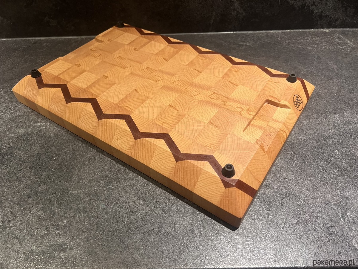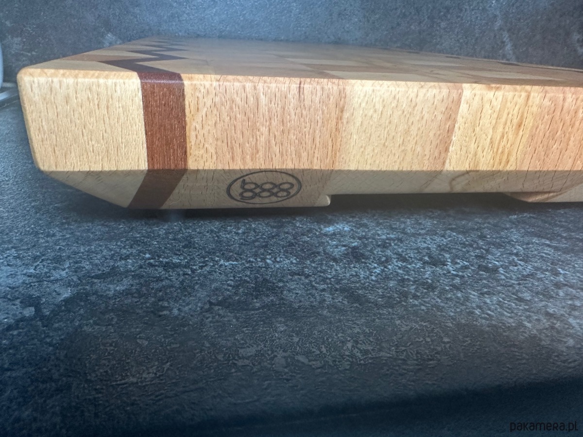 Grubość 5,3 cm + 1 cm nóżki daje wyjątkową stabilność, komfort pracy i ochronę blatu. Od spodu deska jest lekko podcięta i posiada wygodne uchwyty, dzięki czemu świetnie leży w dłoniach i łatwo ją przenosić. Dodatkowo zastosowano gumowe, antypoślizgowe nóżki, które zapobiegają przesuwaniu się podczas krojenia.