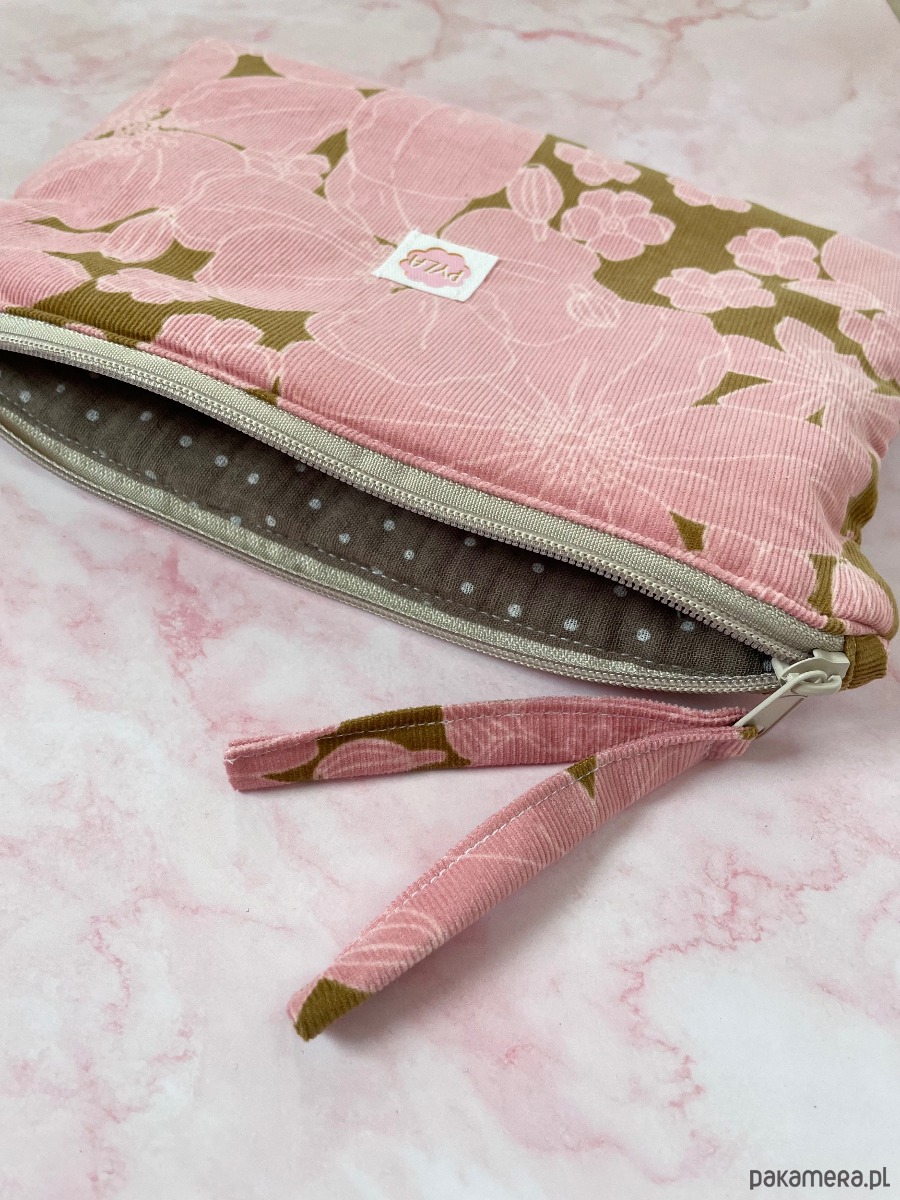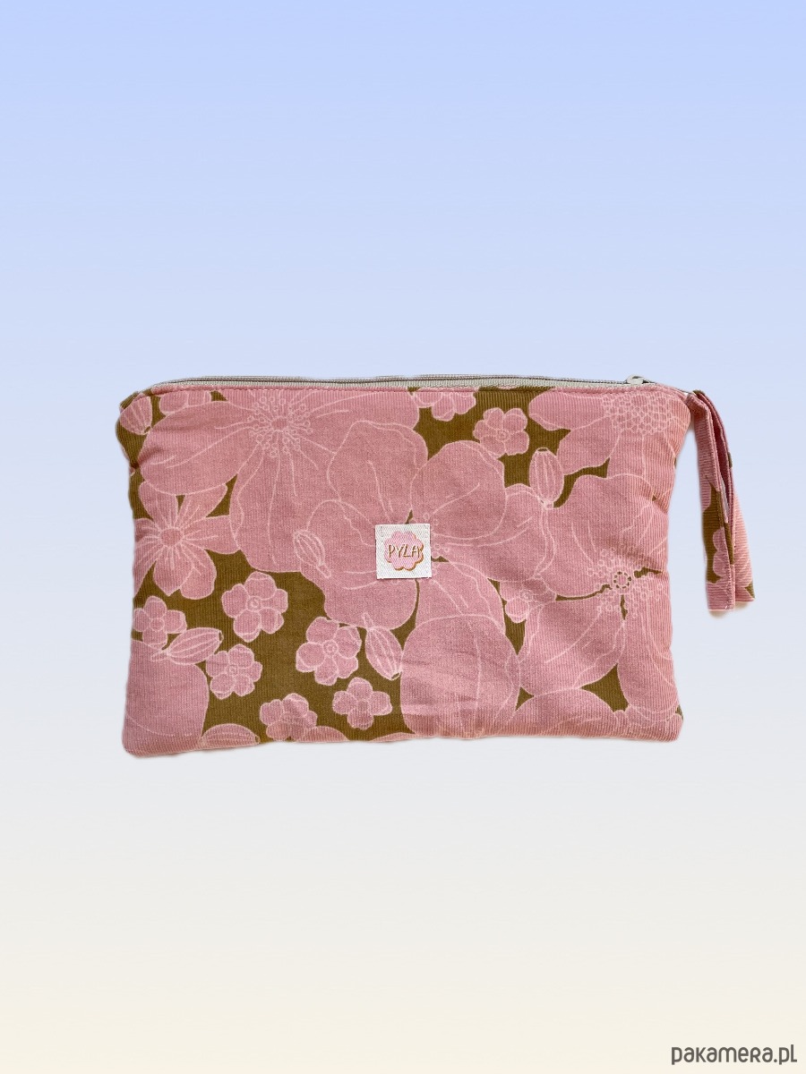 Kosmetyczka sztruksowa, różowe kwiaty na musztardowym tle.
