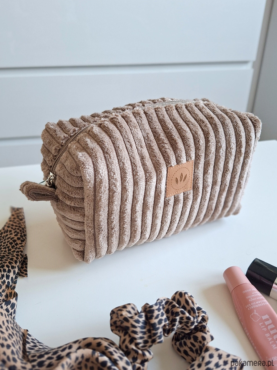 Średniej wielkości kosmetyczka z miękkiego sztruksu w szeroki prążek.