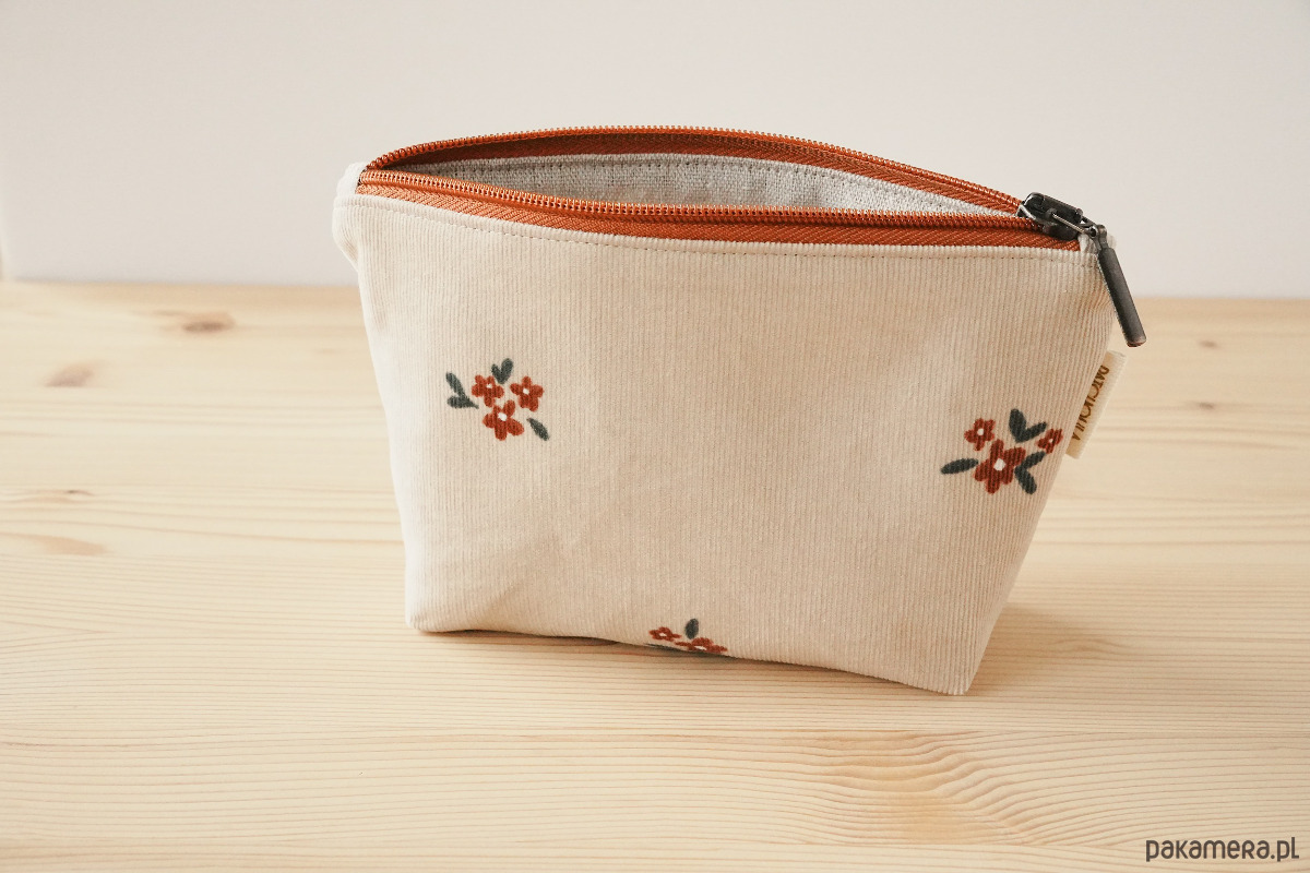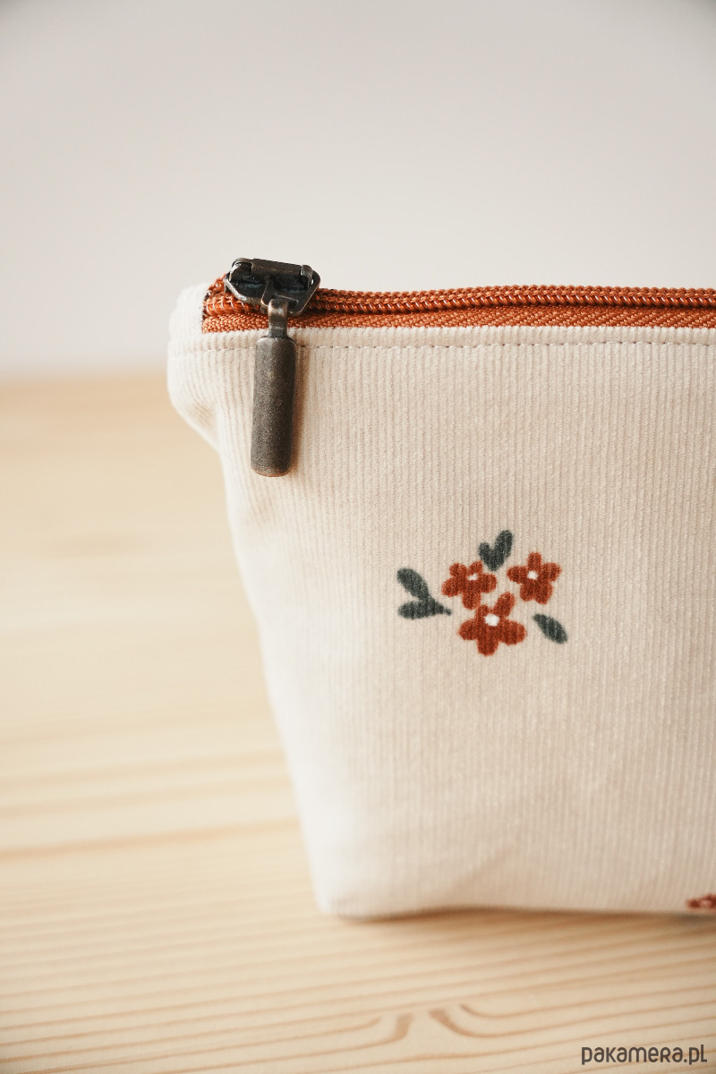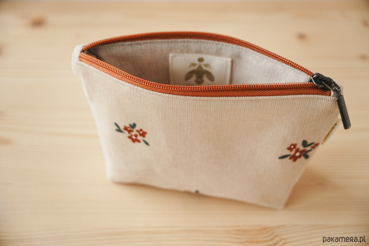 Na zewnątrz bawełniana tkanina z kwiatowym motywem. Wewnątrz beżowa podszewka (upcycling) ozdobiona bawełnianą metką z logo marki. Całość dopełniona retro zamkiem.