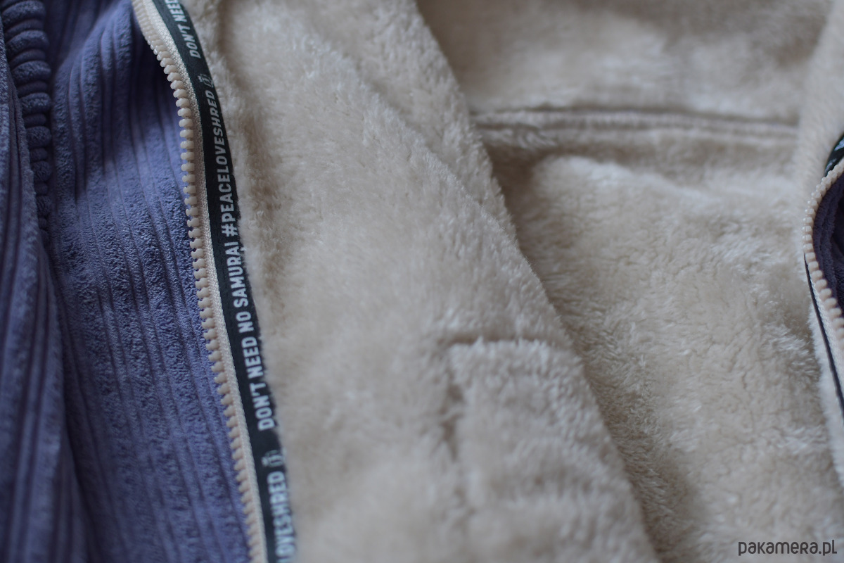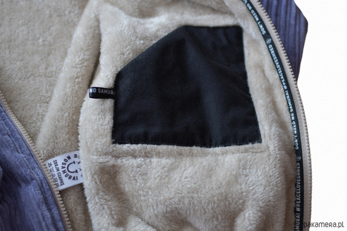 Wysoki kołnierz, suwak, dwie boczne kieszenie, jedna wewnętrzna.