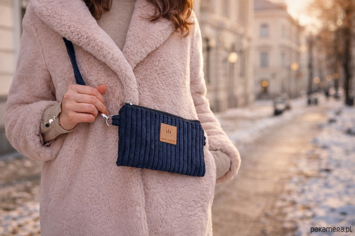 Funkcjonalną mini nerkę na telefon można nosić tradycyjnie na biodrze lub na skos.